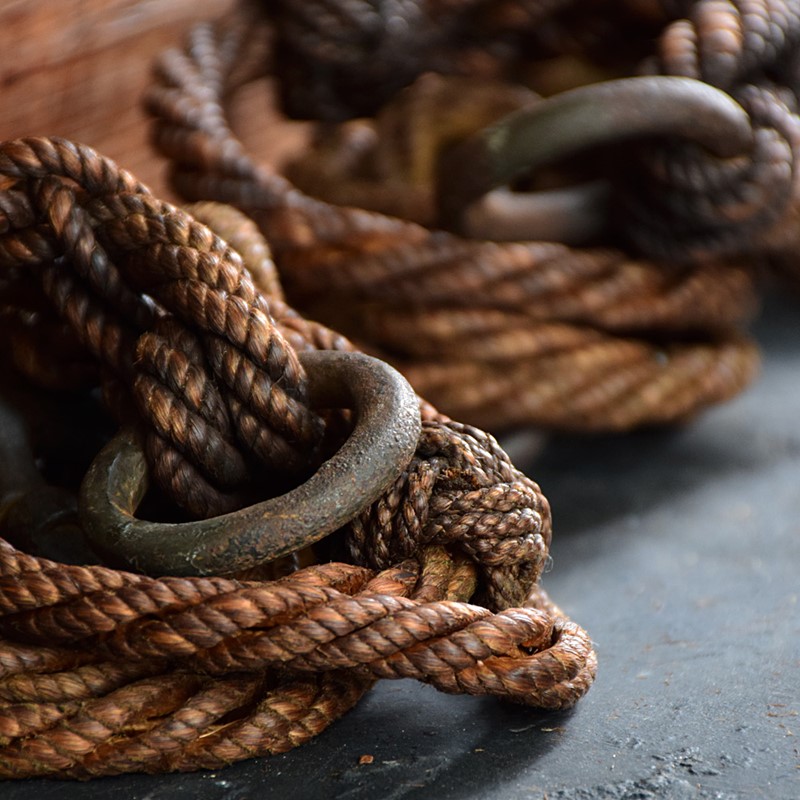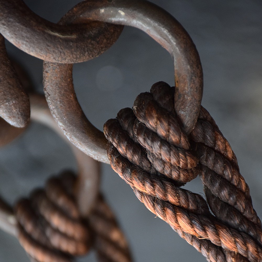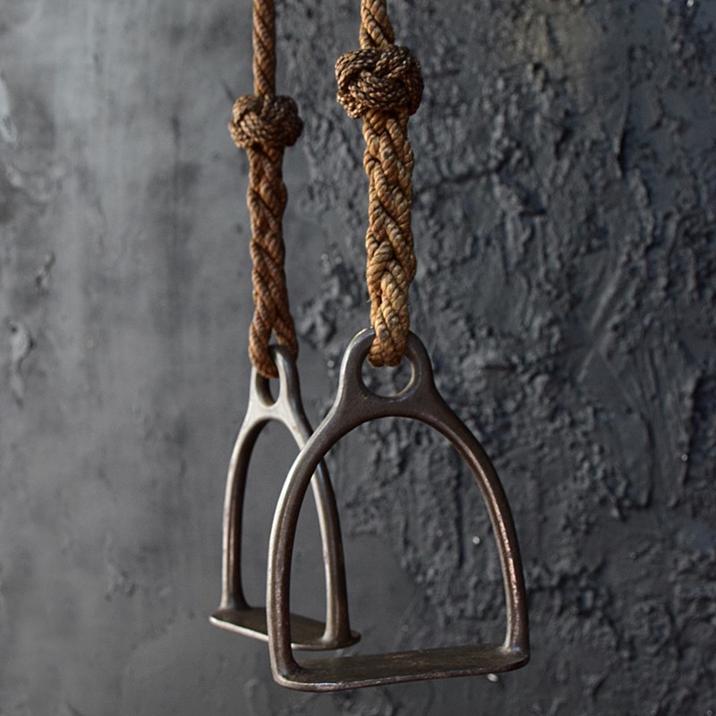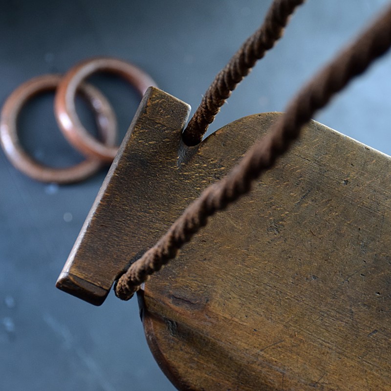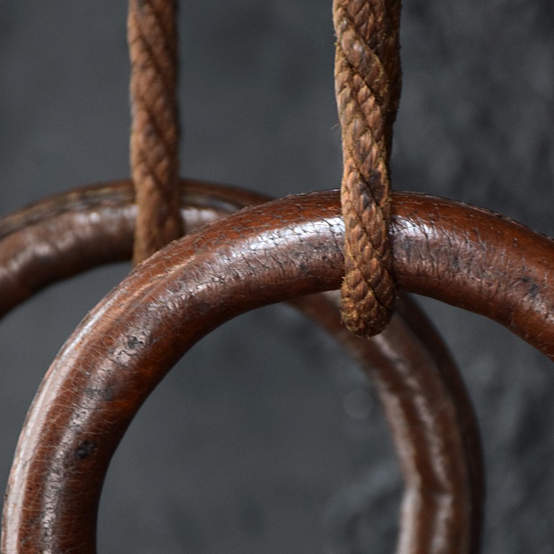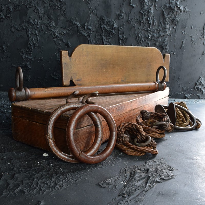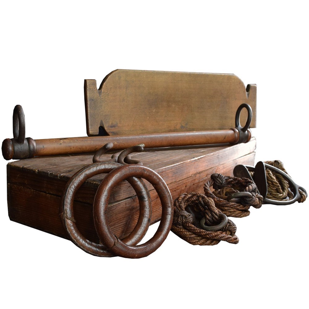 We share what we love, and we love this rare and unusual set of late 19th century English trapeze artists equipment. Housed in its original pine box, this collection includes a pair of leather stitched rings, ceiling screw supports, cast metal foot supports with rope, swing support ropes with metal clips, hanging pole with cast metal supports and a wooden swing seat. Rare to obtain a complete set in such good condition, untouched in form with a deep natural patination across all this item.