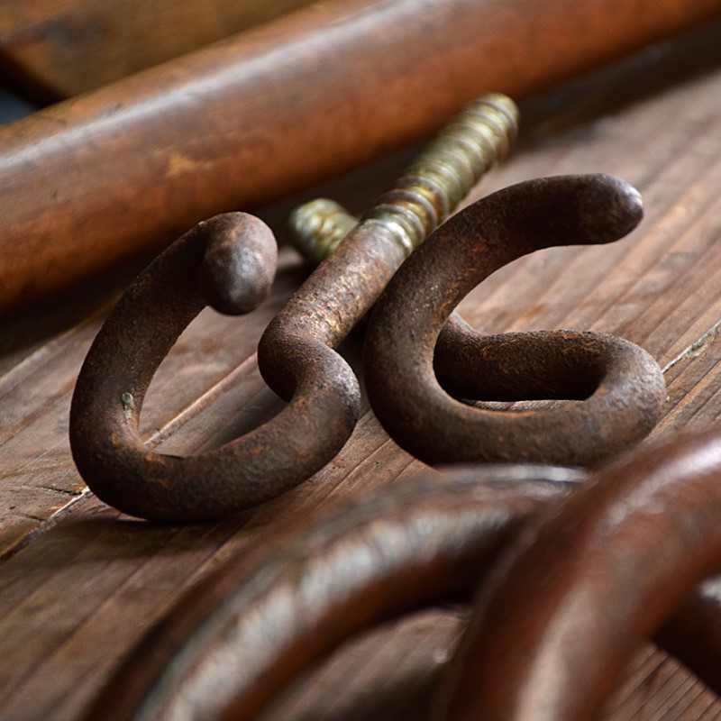 Completely solid in structure and form, Natural aging across all surfaces, the wood material is worn in certain areas with scratches and worn areas due to use. Rust and aging across metal sections of this item with a deep natural patination. An aged antique item so please expect this in the condition as the photos aim to show.