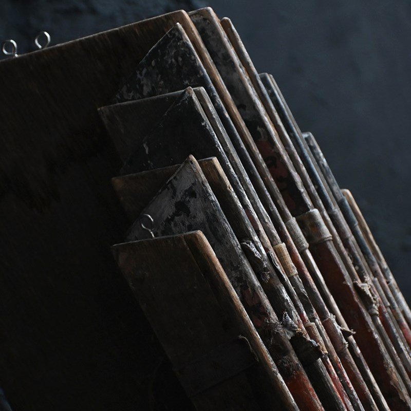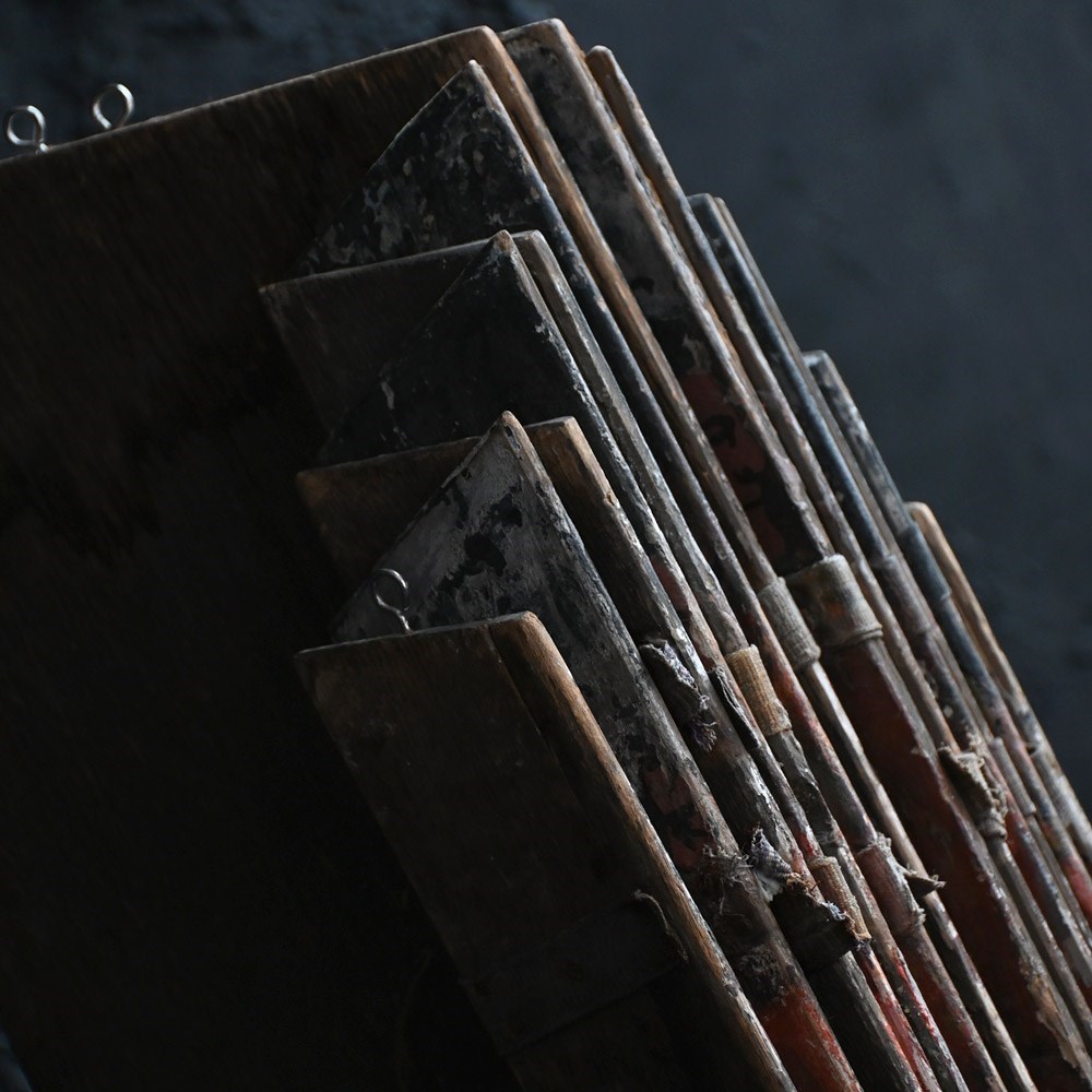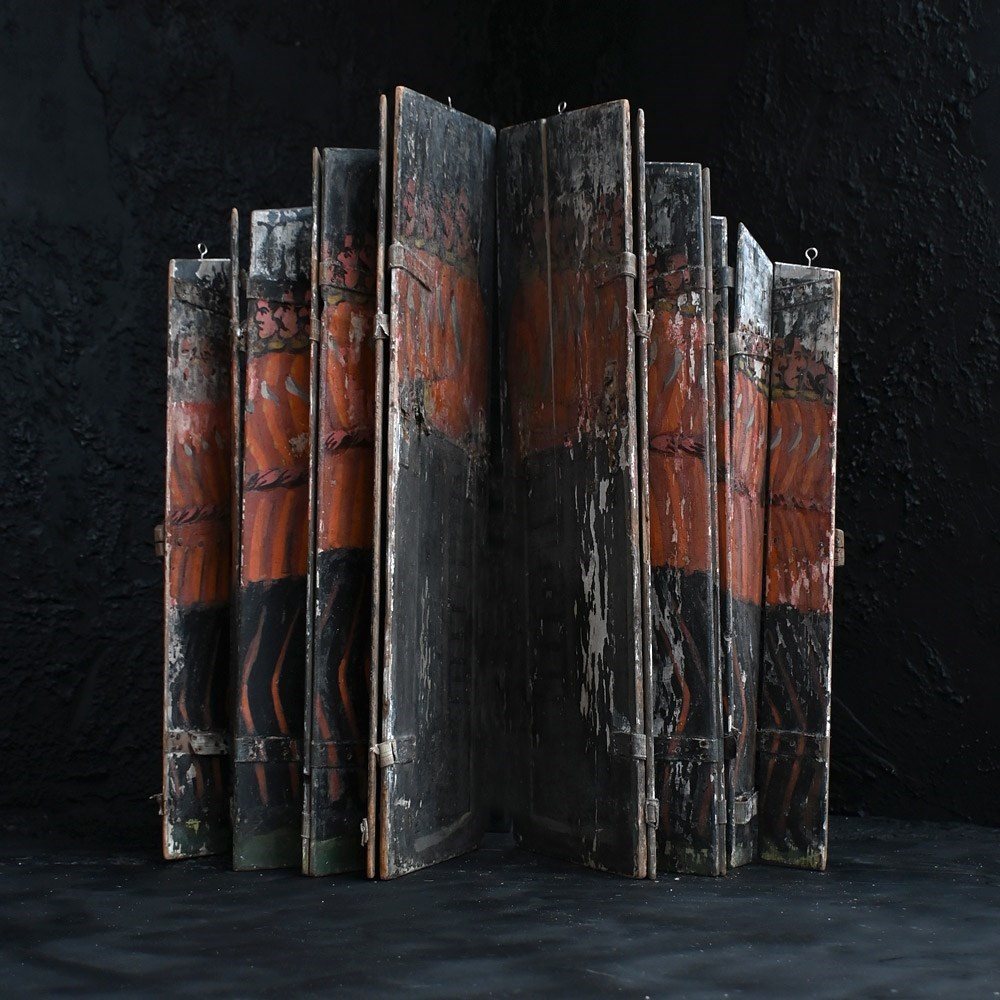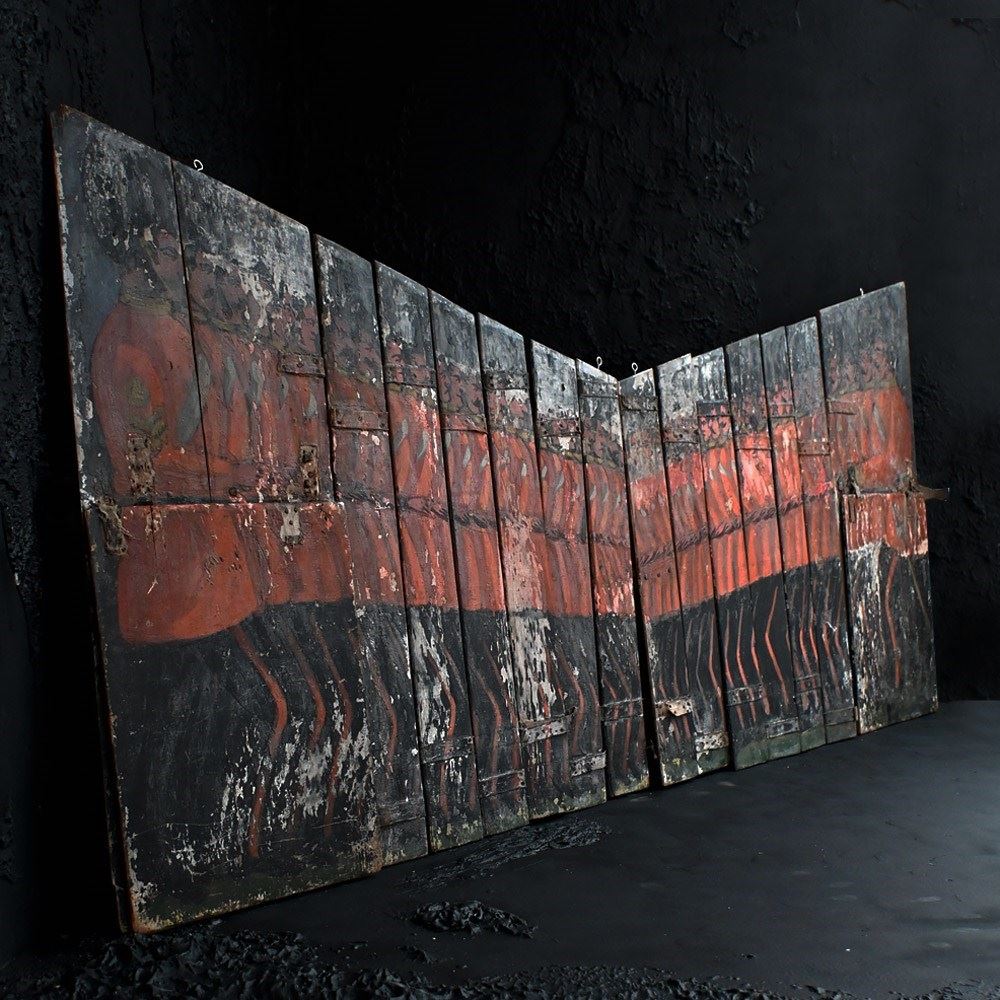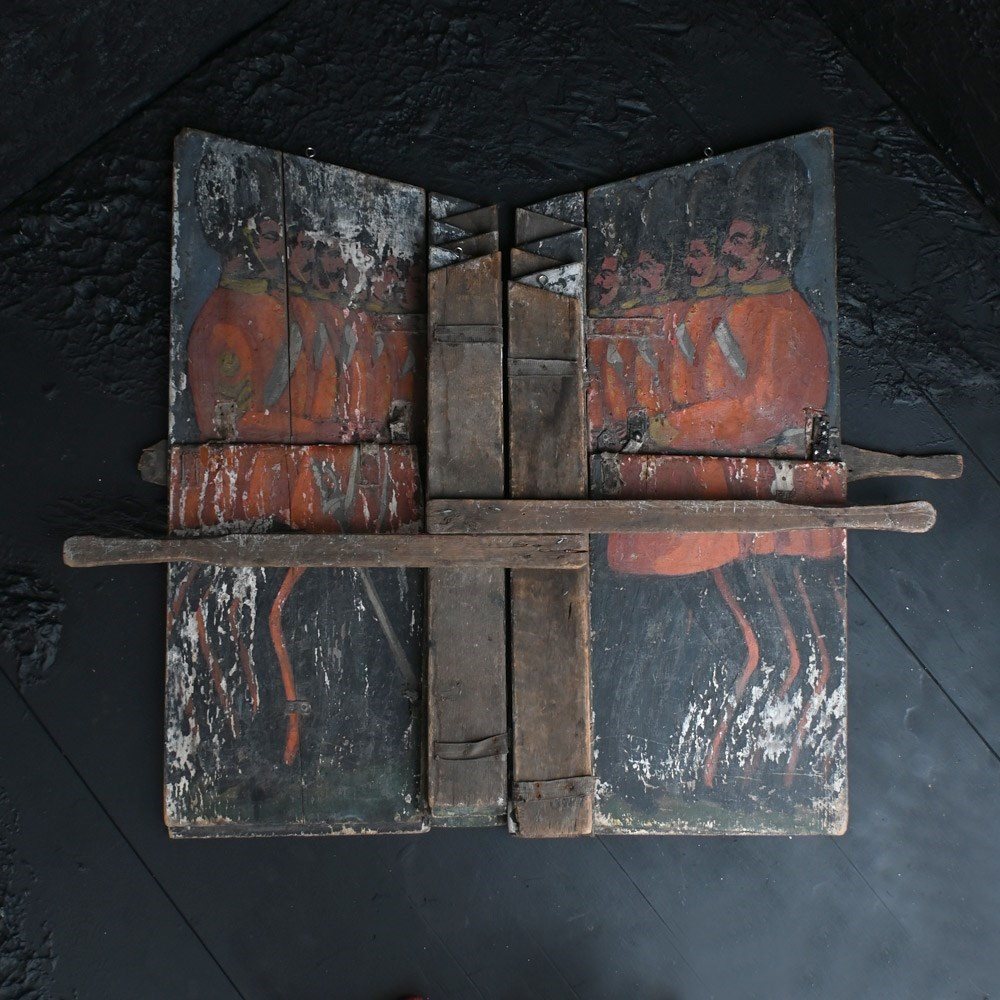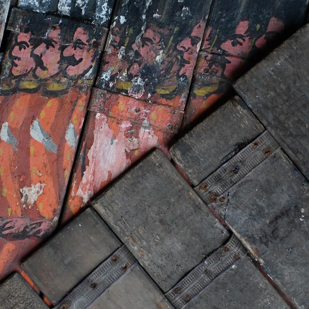 The condition of the scenery boards is totally un-meddled with and there have been no attempts to restore the flaking to the original paintwork (only natural wax has been applied to keep things tight on the surface). They are relatively fragile having been well used in performance and the canvas hinges are delicate with some lacking. We have added small hooks for wall hanging but they could be removed. The original tactile wooden handles are all present.