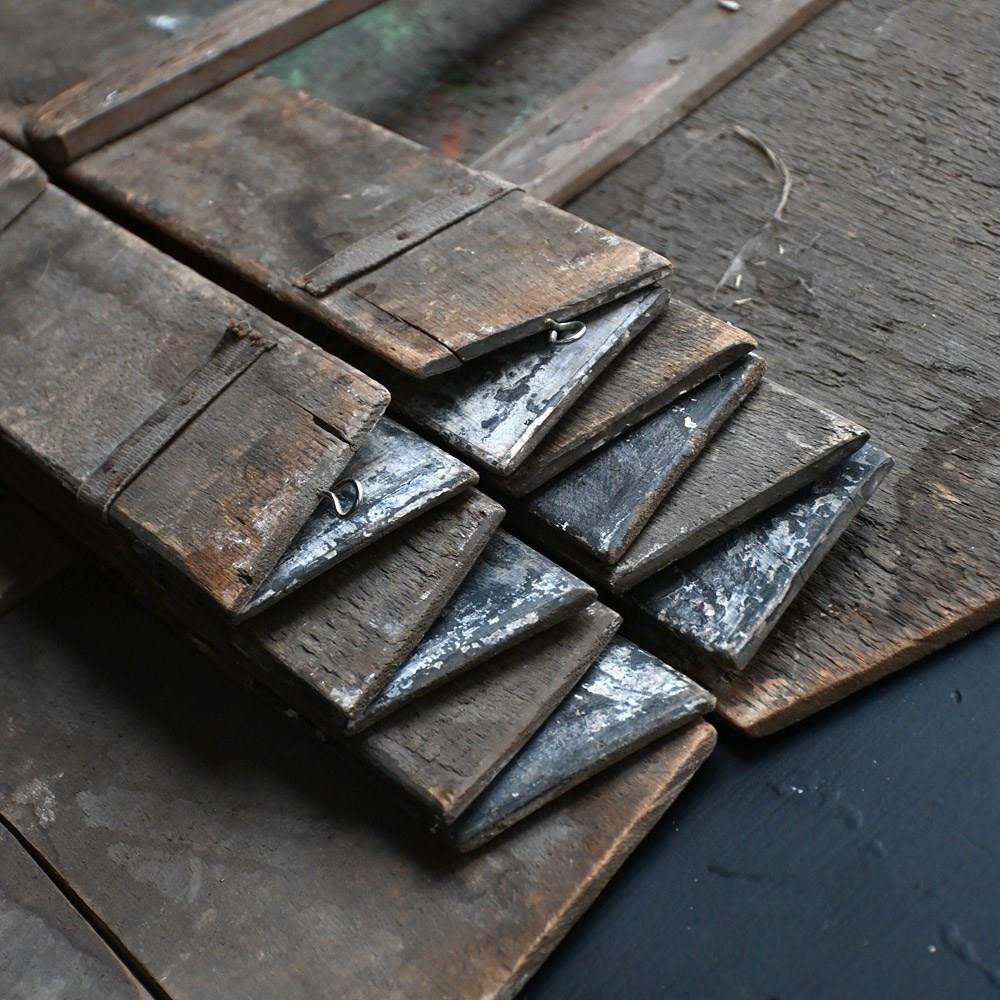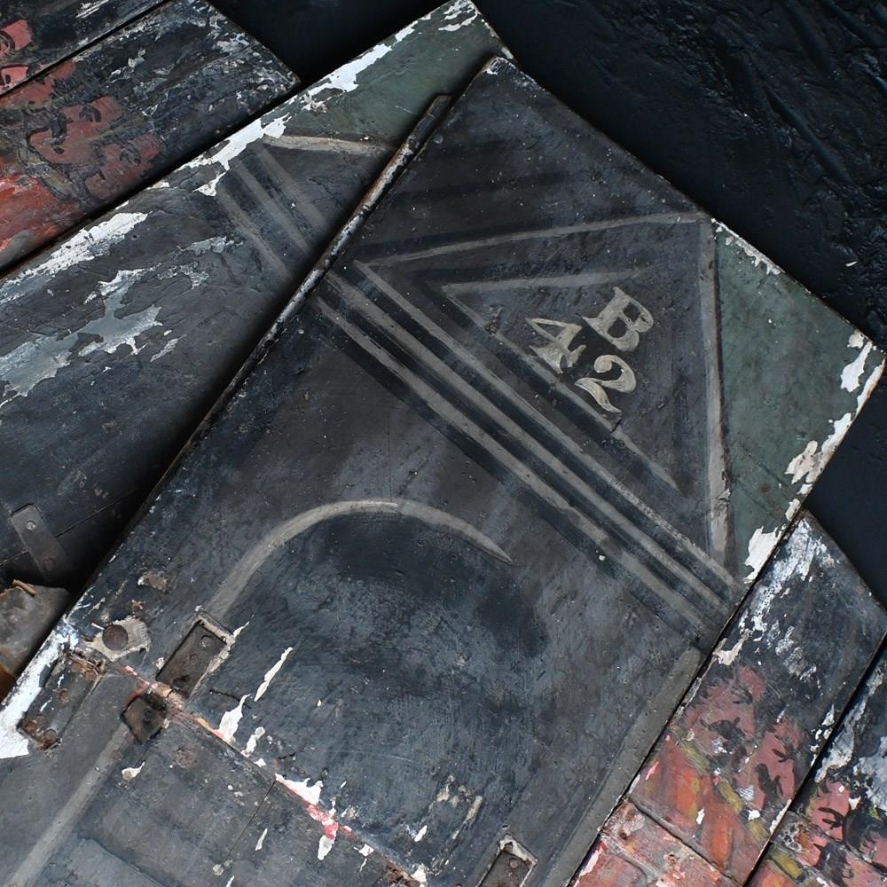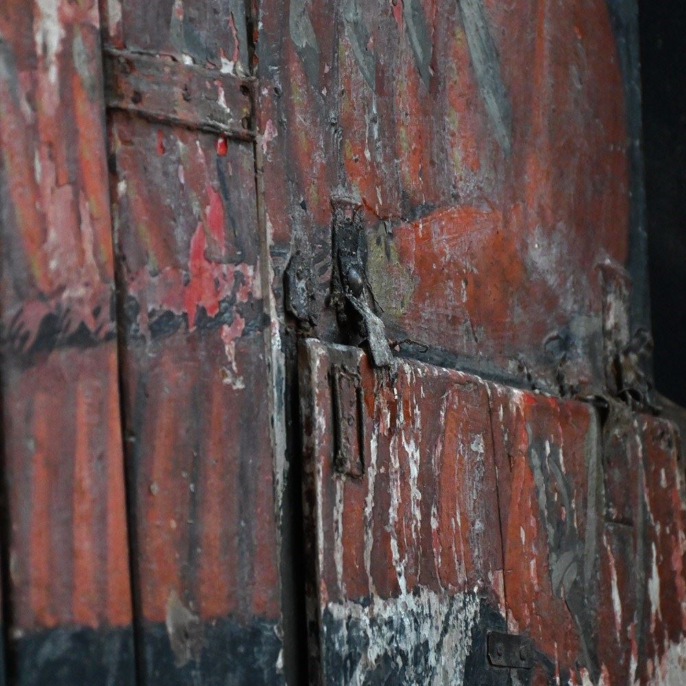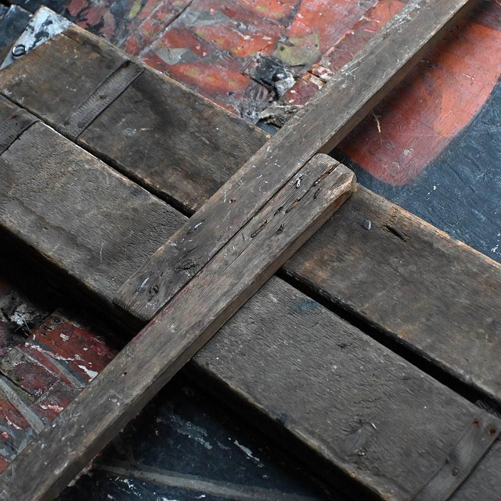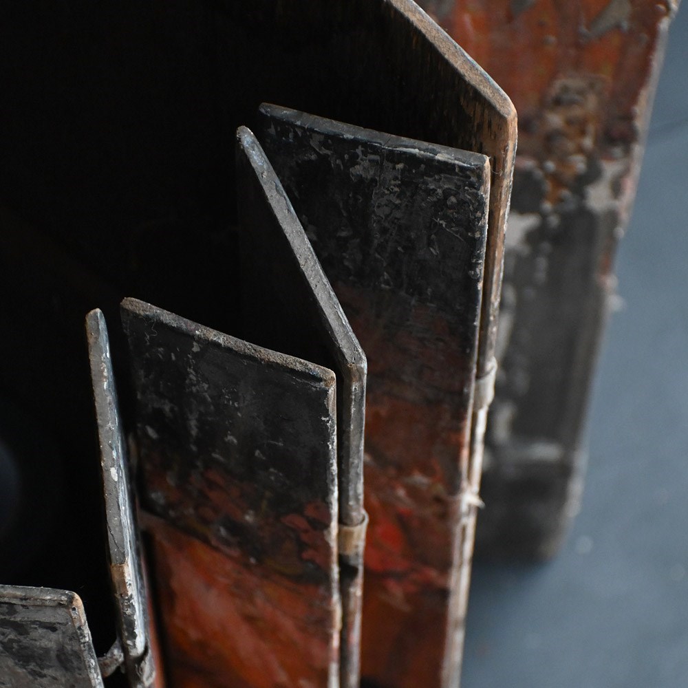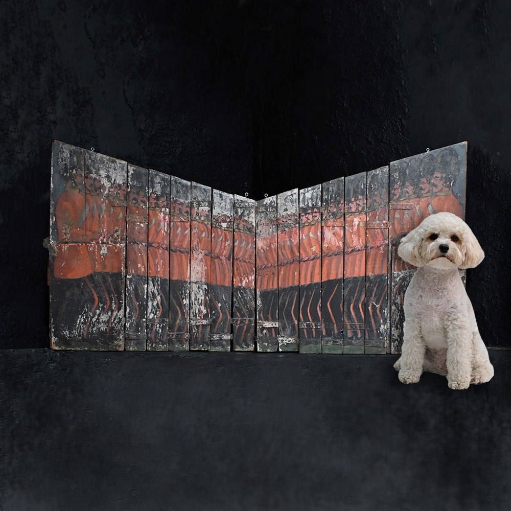 The condition of the scenery boards is totally un-meddled with and there have been no attempts to restore the flaking to the original paintwork (only natural wax has been applied to keep things tight on the surface). They are relatively fragile having been well used in performance and the canvas hinges are delicate with some lacking. We have added small hooks for wall hanging but they could be removed. The original tactile wooden handles are all present.