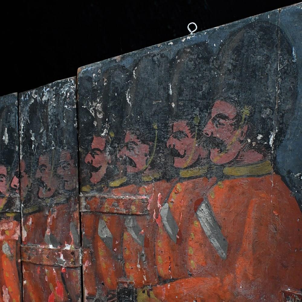 The very rare pair of metamorphic trick scenery boards each hinged and hand-painted to wood and canvas, comprising of two rows of the Queen’s guard appearing from their guard houses, sign written with the numbers B42 and A41, the soldiers appearing to emerge by un-folding into a two rows of twenty five soldiers each, in their distinctive red tunics, on the march, surviving from the latter part of the nineteenth century and from the renowned collection of John Michael Blundall (1937-2014).