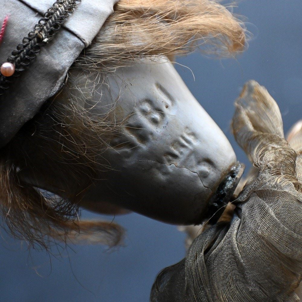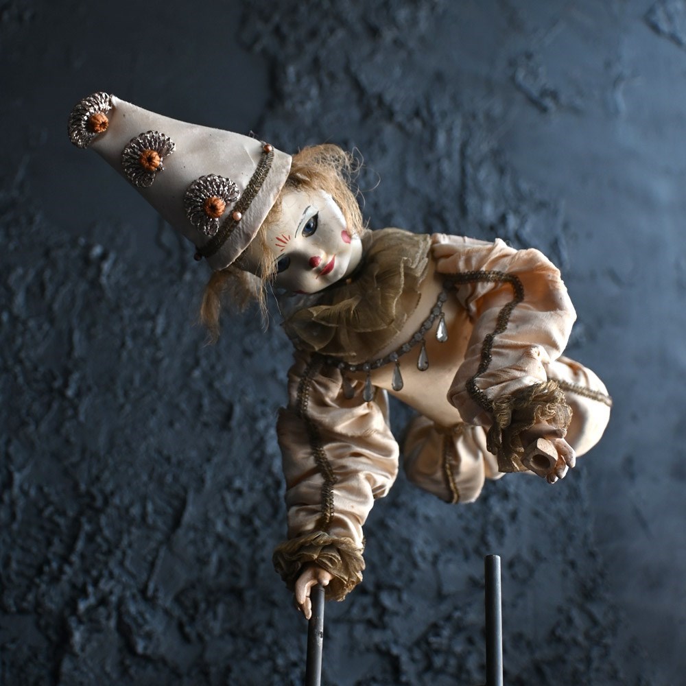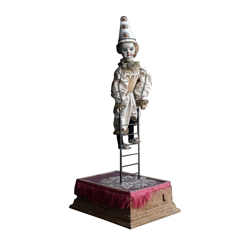 An unworking automaton example by Michel Marcu from the mid-20th Century. The respected maker of French automatons Michel created some amazing examples including this one. This item doesn’t have a key present but upon inspection of the mechanism everything is present and original to the item. The flip switch also is brass and moves up and down if somewhat loosely. The White Clown or Tightrope Walker as its more famously known with clown in a white silk costume with a painted bisque head made up with fixed eyes, it would performed acrobatics like movements, from a station upright on the ladder to eventually making its way up to a single arm handstand position. We believe after showing this to an expect repaired that the cost to bring this back to like is around £500 as all the mechanism is present. We have priced this item according to its non-working state.