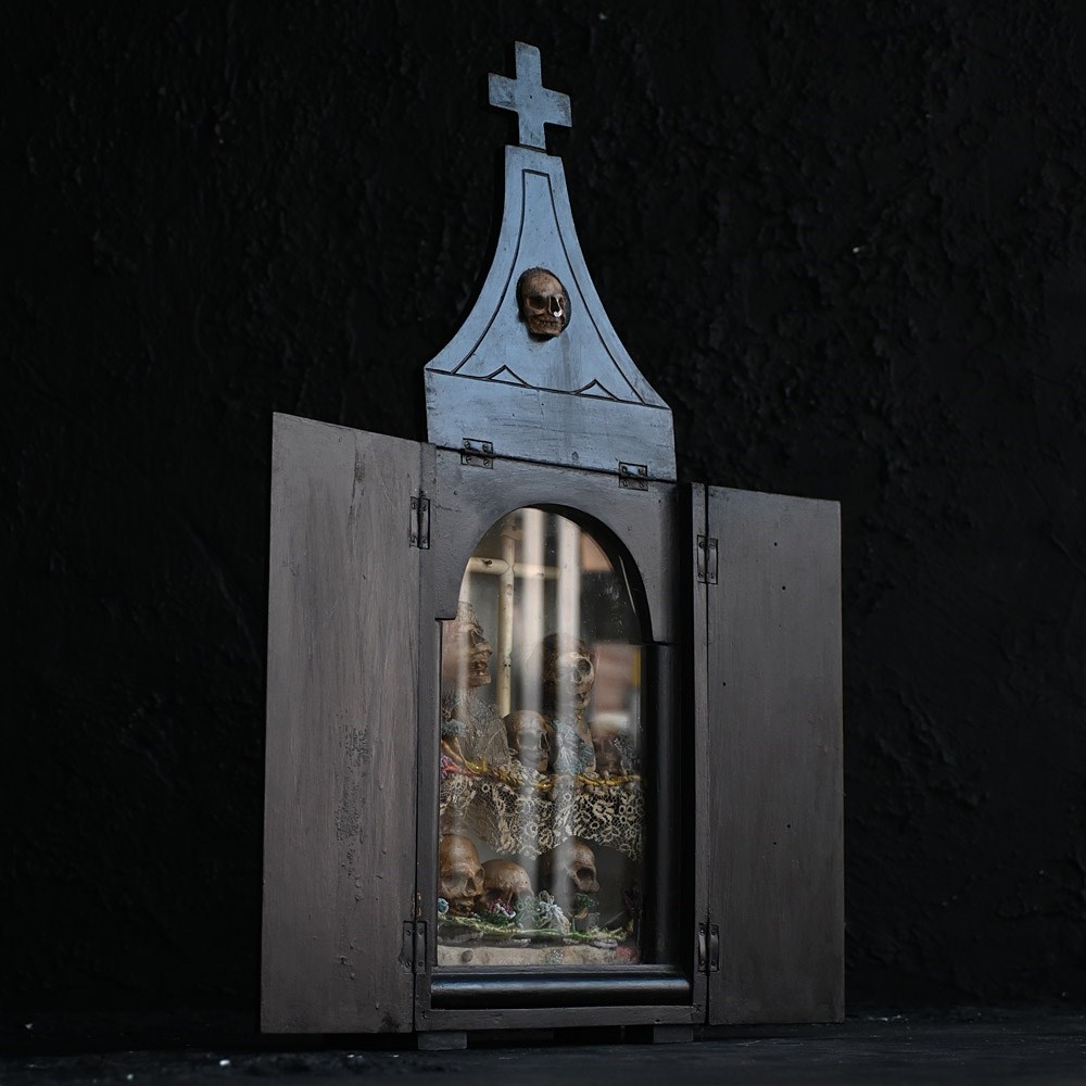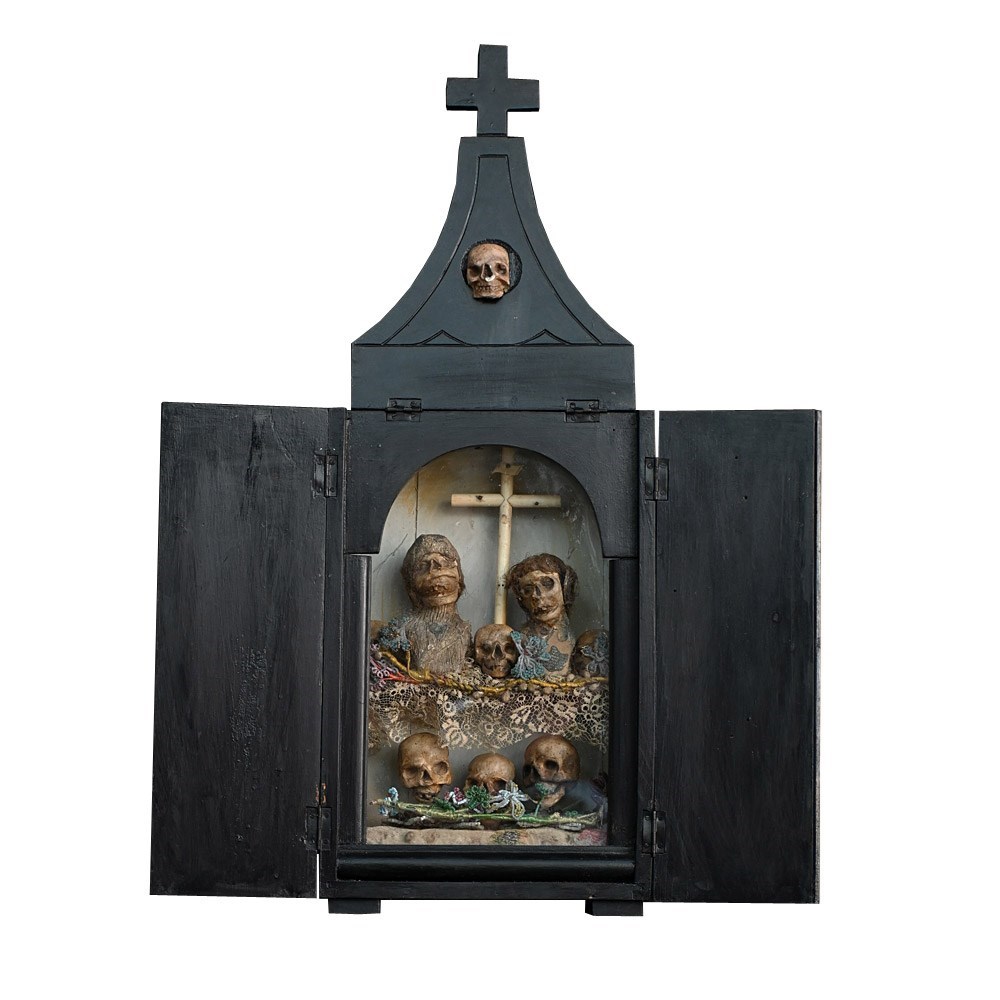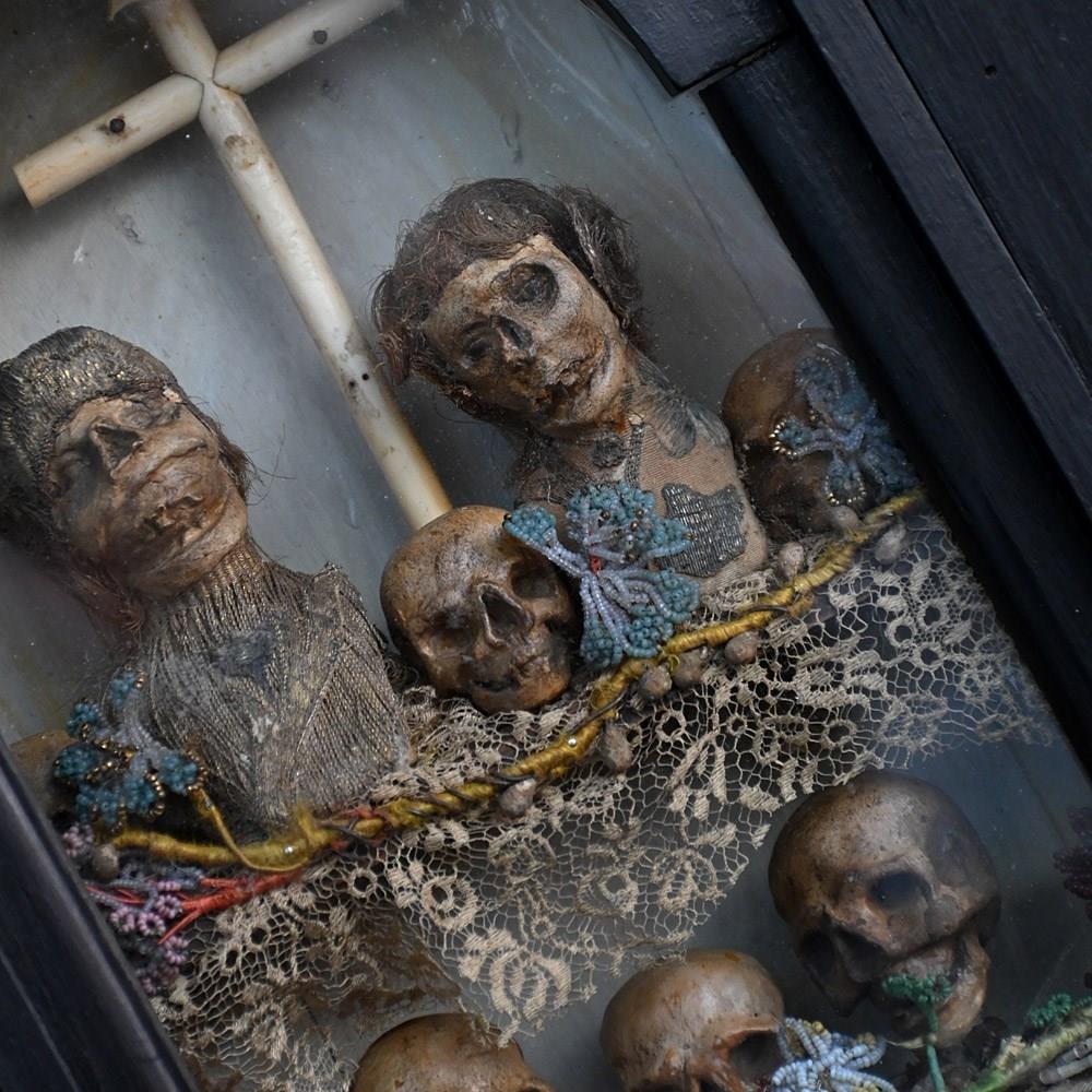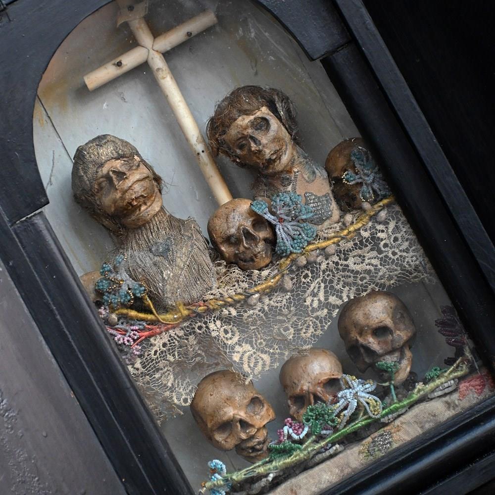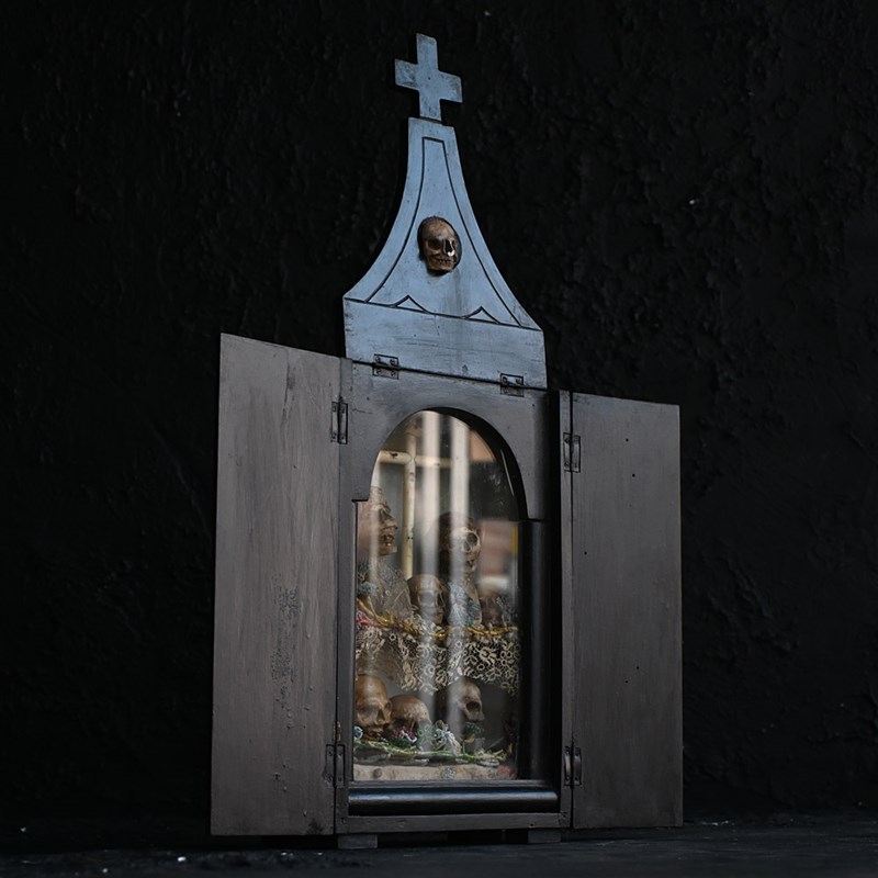An unusual casket box which opens to reveal a memento mori display. Filled with hand carved pine figures and skulls covered in lace and beads.