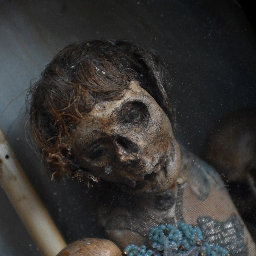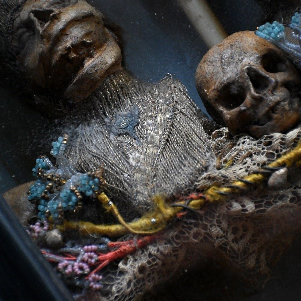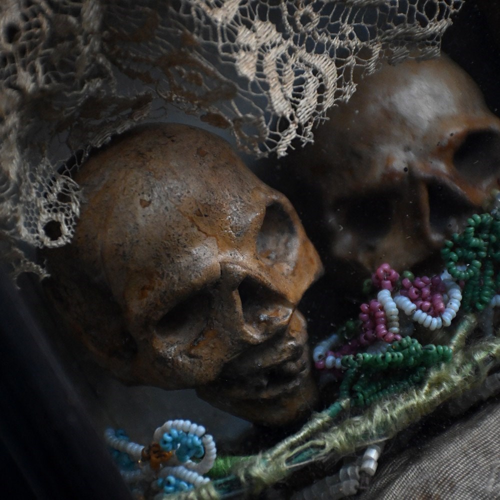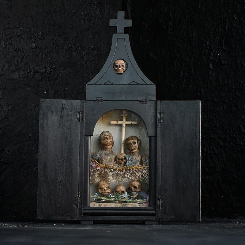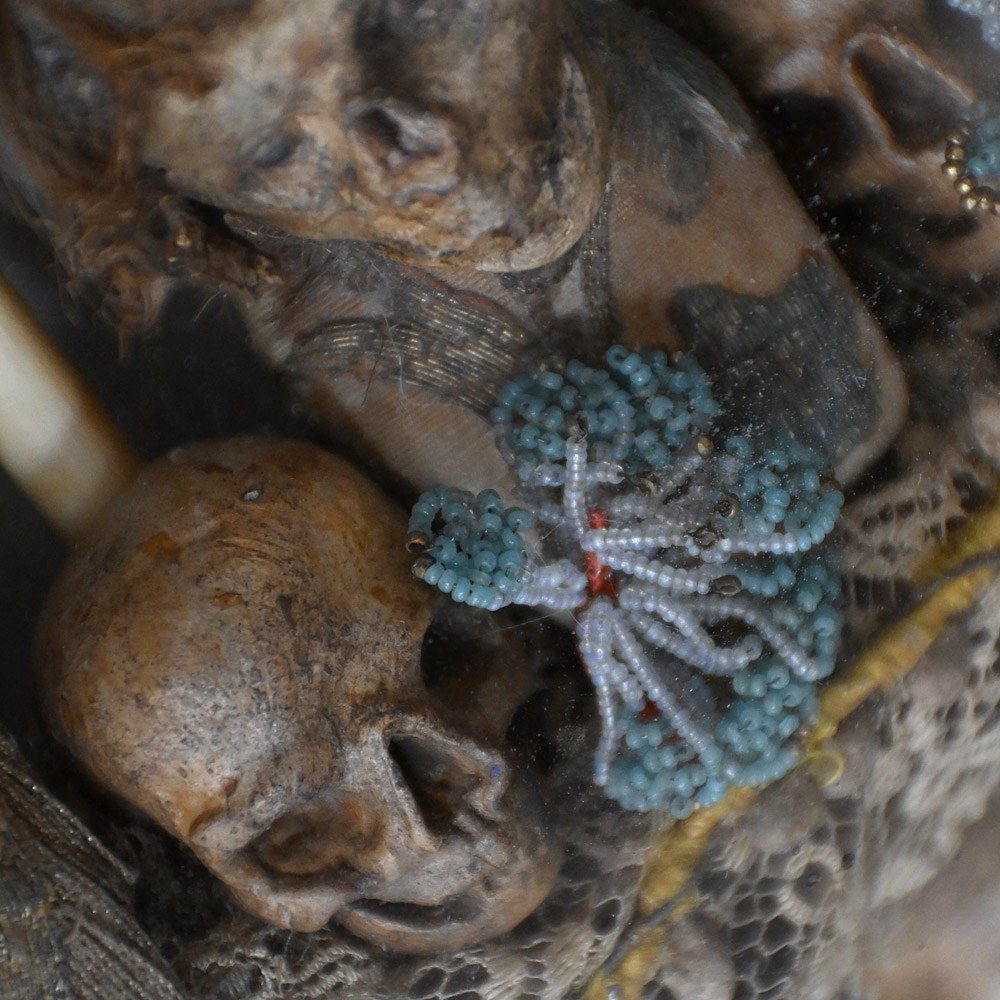An unusual casket box which opens to reveal a memento mori display. Filled with hand carved pine figures and skulls covered in lace and beads.