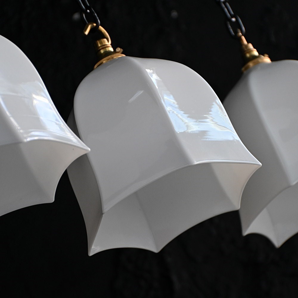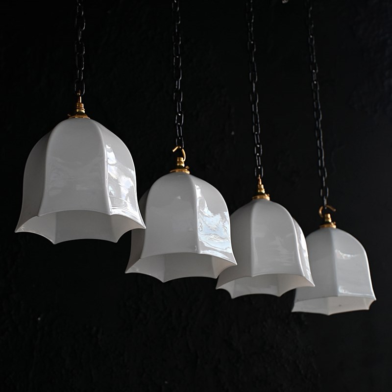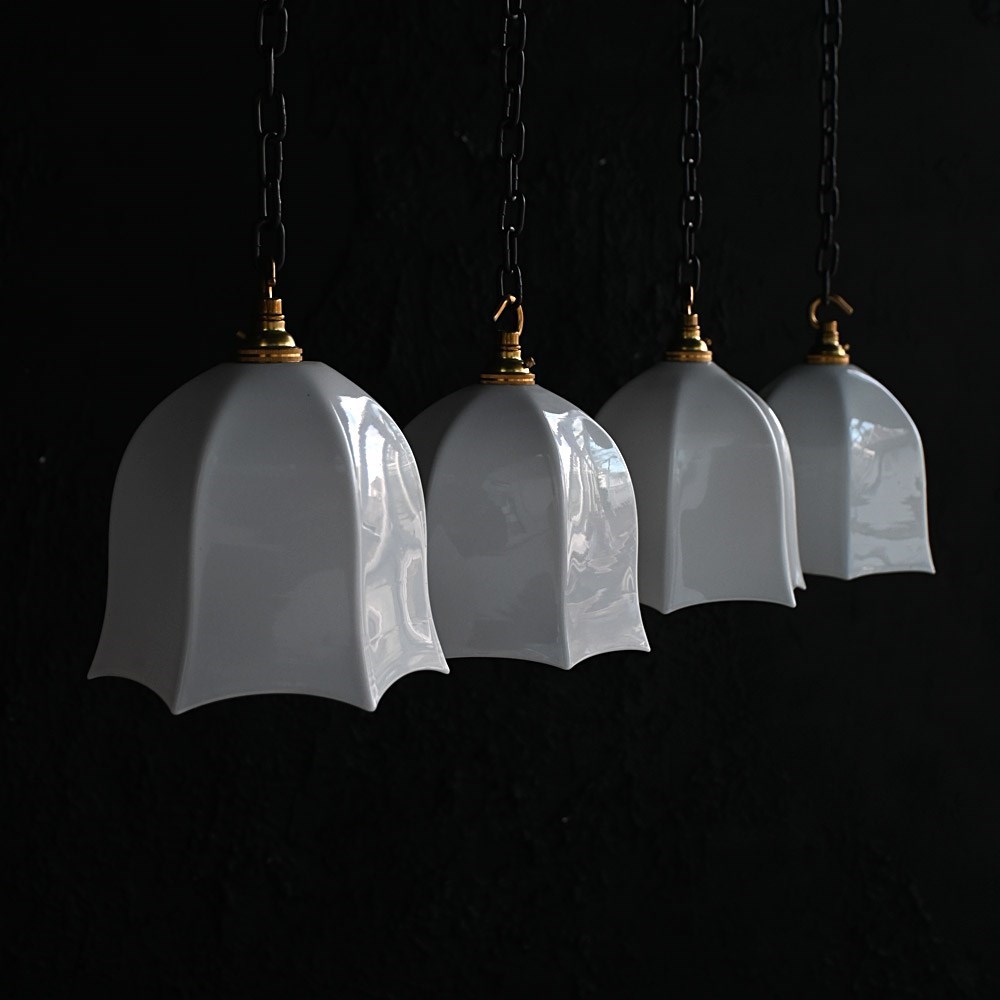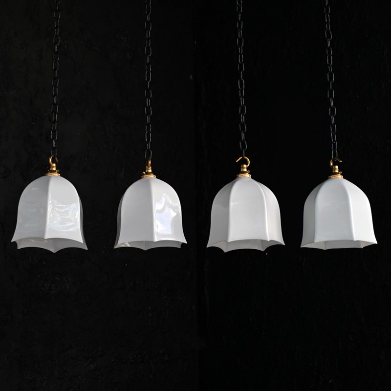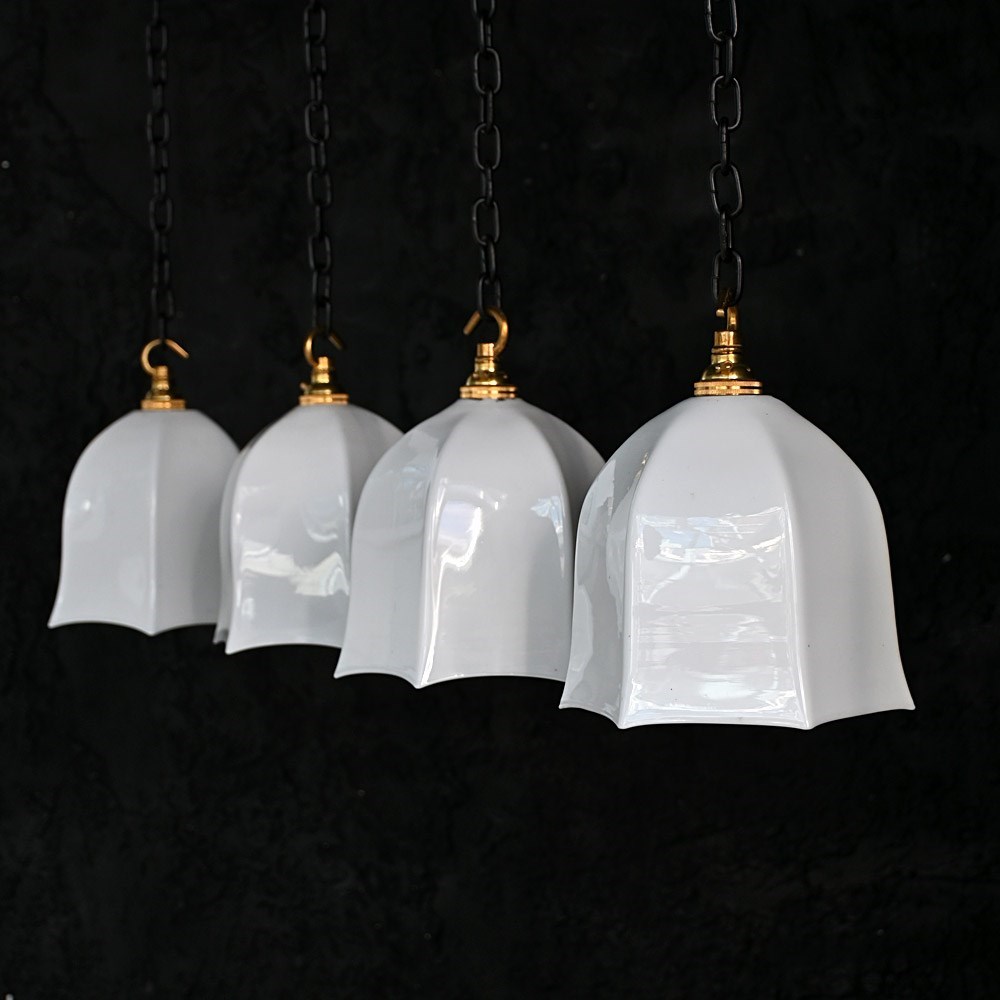 A highly decorative set of four English milk glass tulip shaped lights, with new brass light fittings and ready to be wired and used.