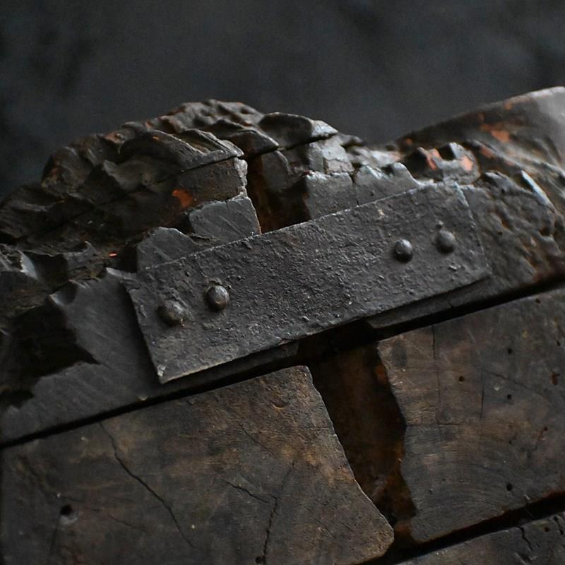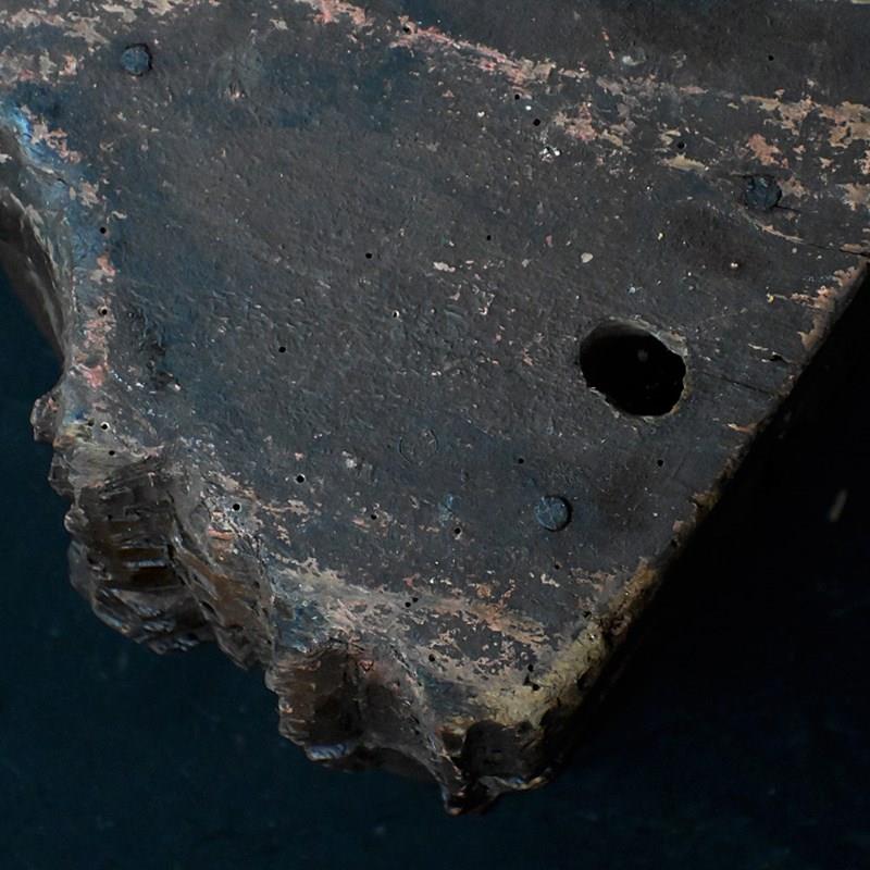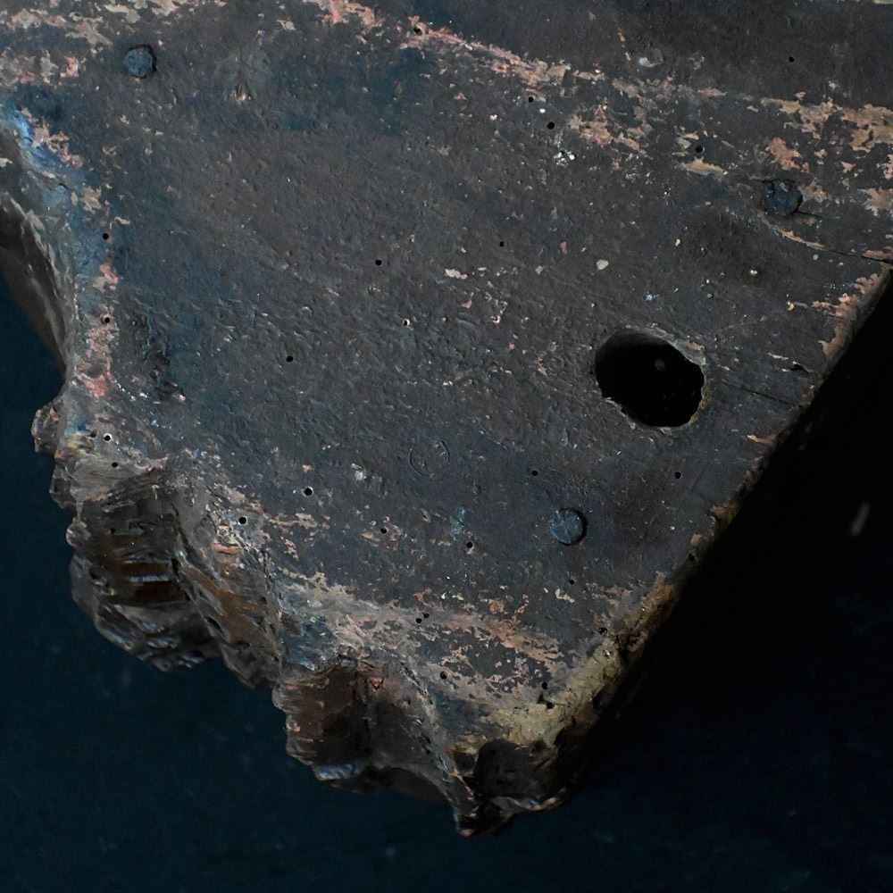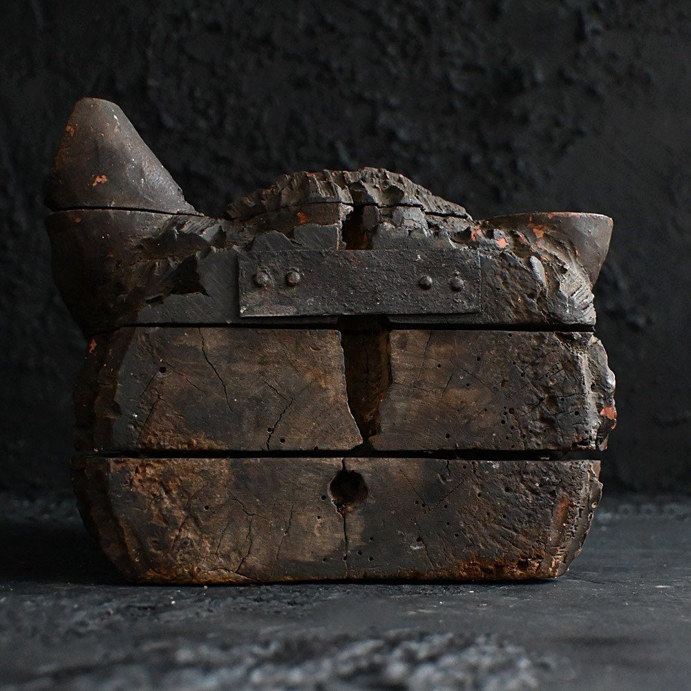 An amazing artifact uncovered from a private collection in Paris earlier this month. A handcrafted section wood wolfs head. With its original mounting bracket still in place, hand painted detail with lots of natural age. We have been informed this artifact was originally discovered in a hunting lodge where this object was displayed at the main entrance hallway.