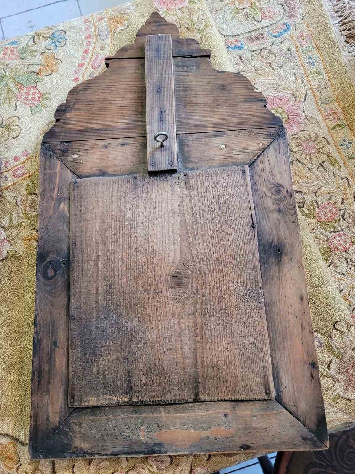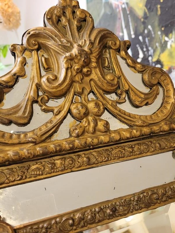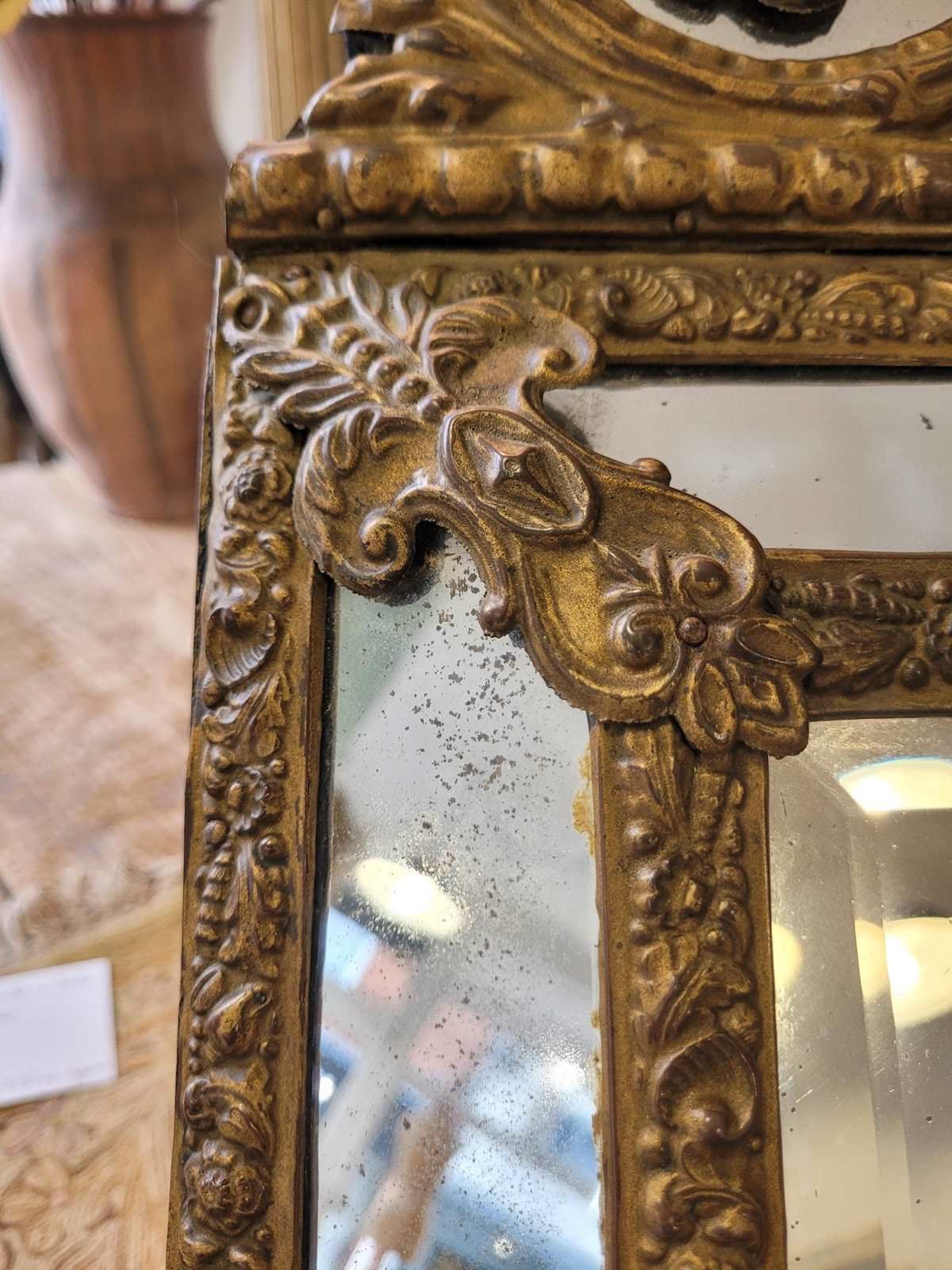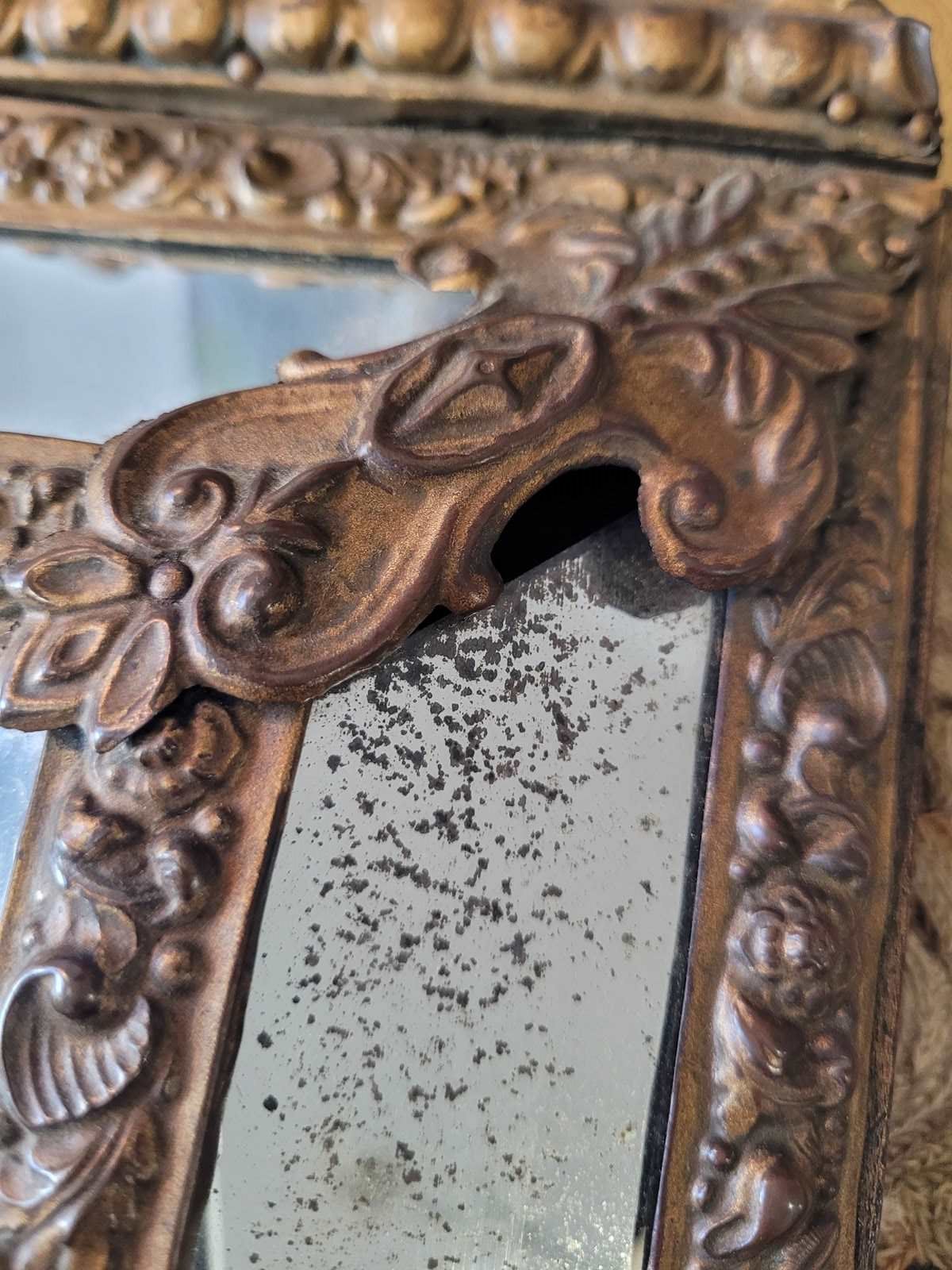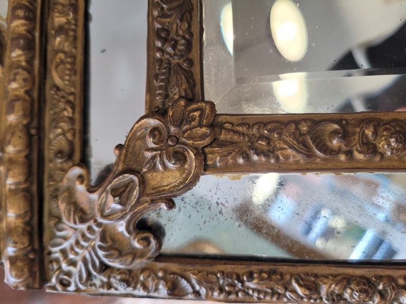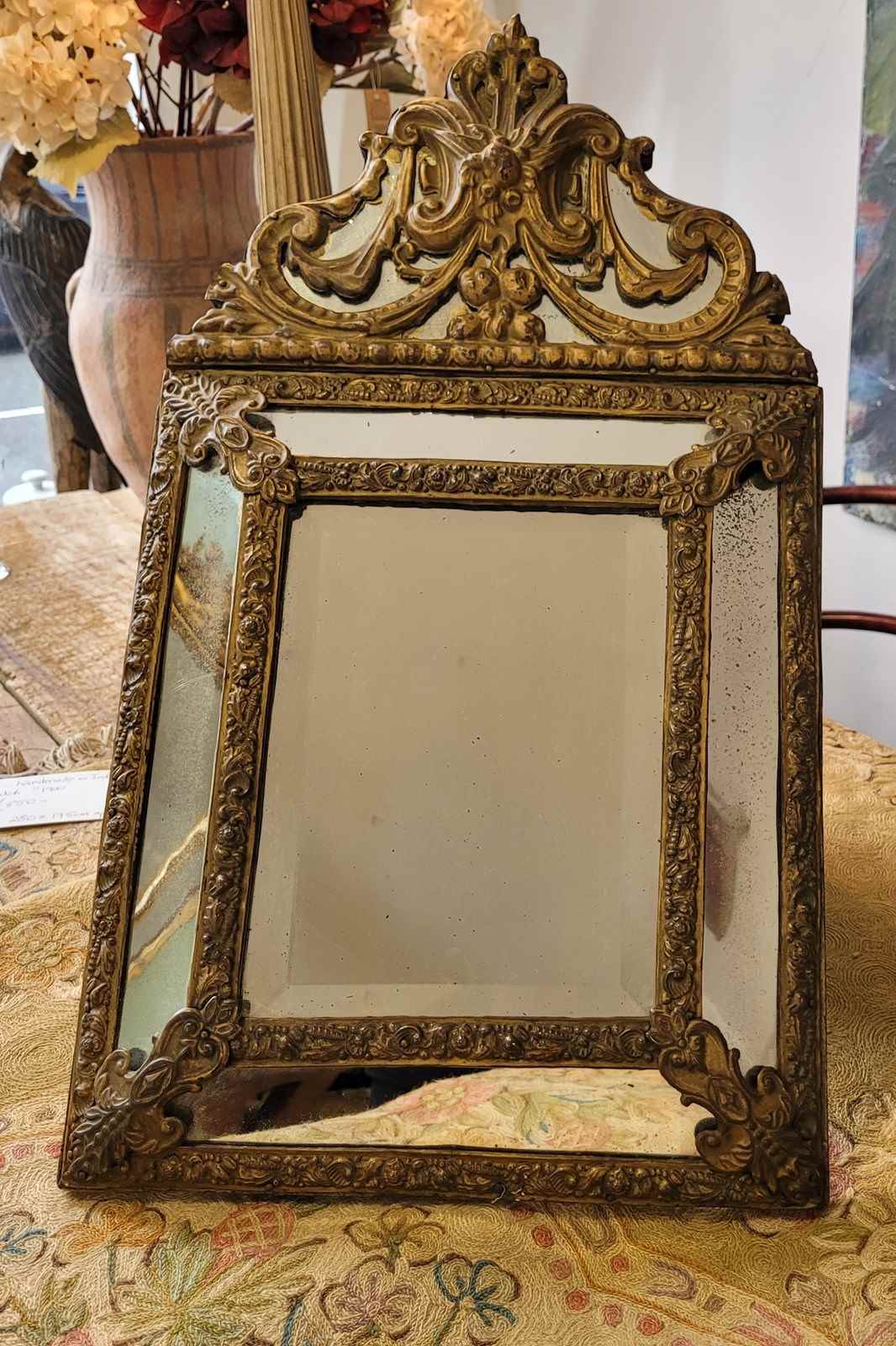 19th century brass repousse cushion mirror from France. It is in overall excellent condition with some foxing to the glass. One of the side panels of glass has been cut slightly short in the making, last photo, but this does not show when hanging. A very decorative little mirror perfect for a smaller space, measuring 58cm x 32 cm.