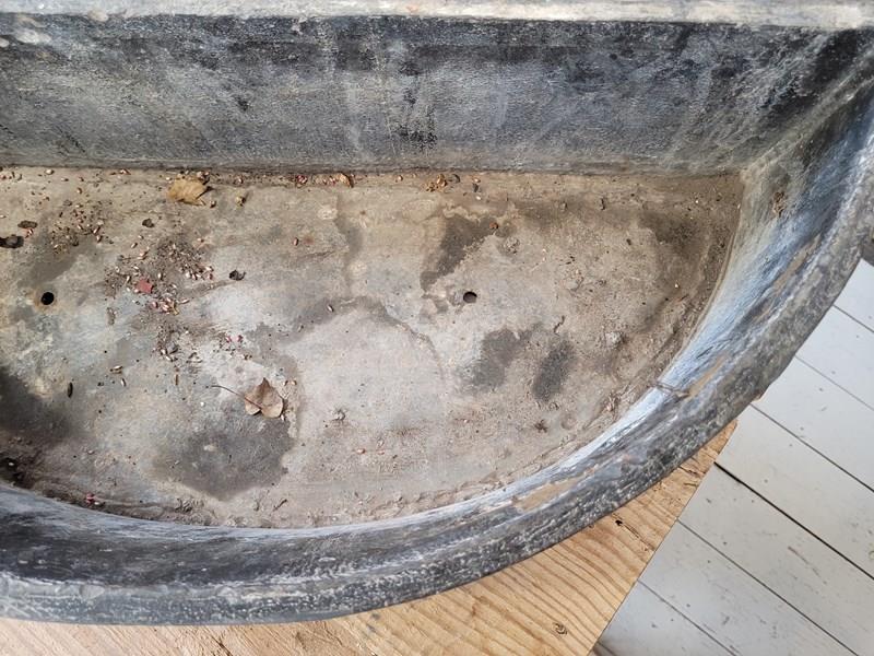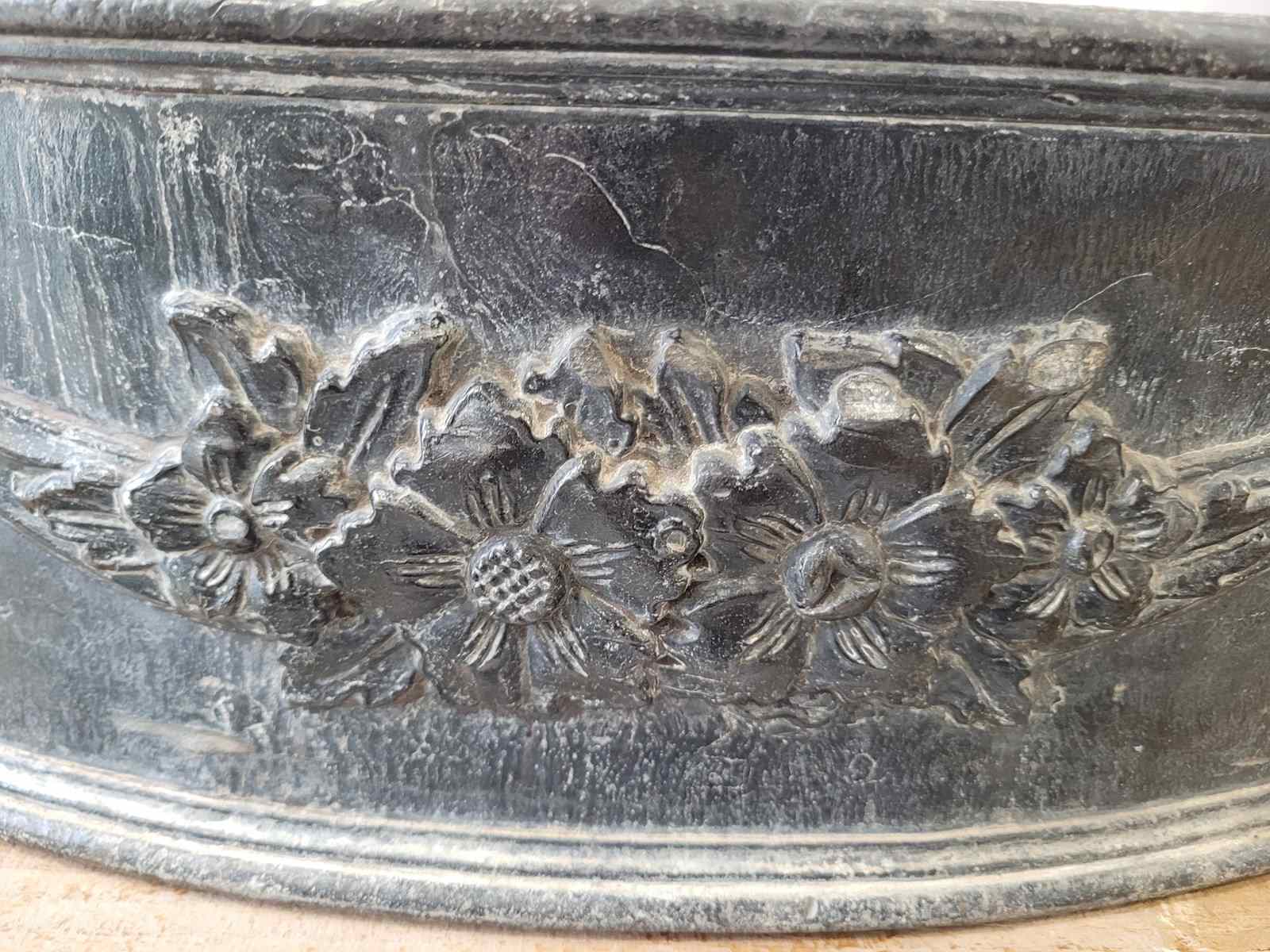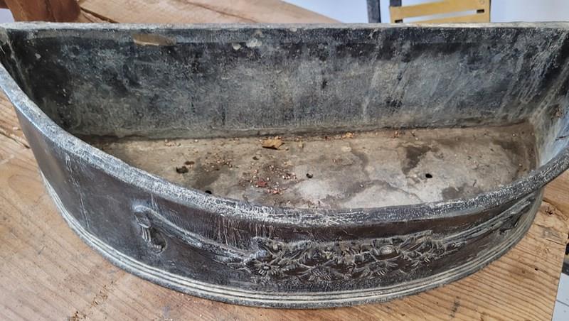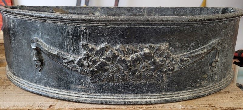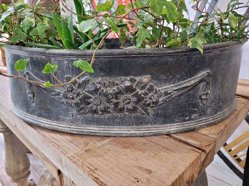 This 19th century cast lead planter sourced from France has a lovely patina and is in wonderful condition, its flat back making it suitable for a windowsill position either indoors or outdoors. Measuring 15cm high, 60cm wide and 23cm deep. It has a pretty flower and swag design on the front. Lead planters are resistant to frost and erosion making them a great choice for outdoors. It is very heavy and has drilled drainage holes.