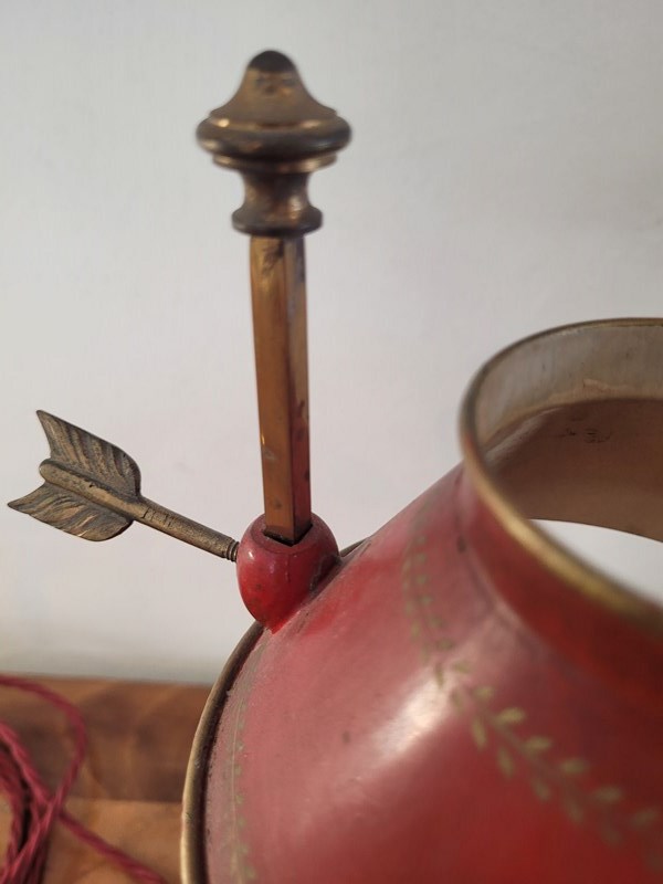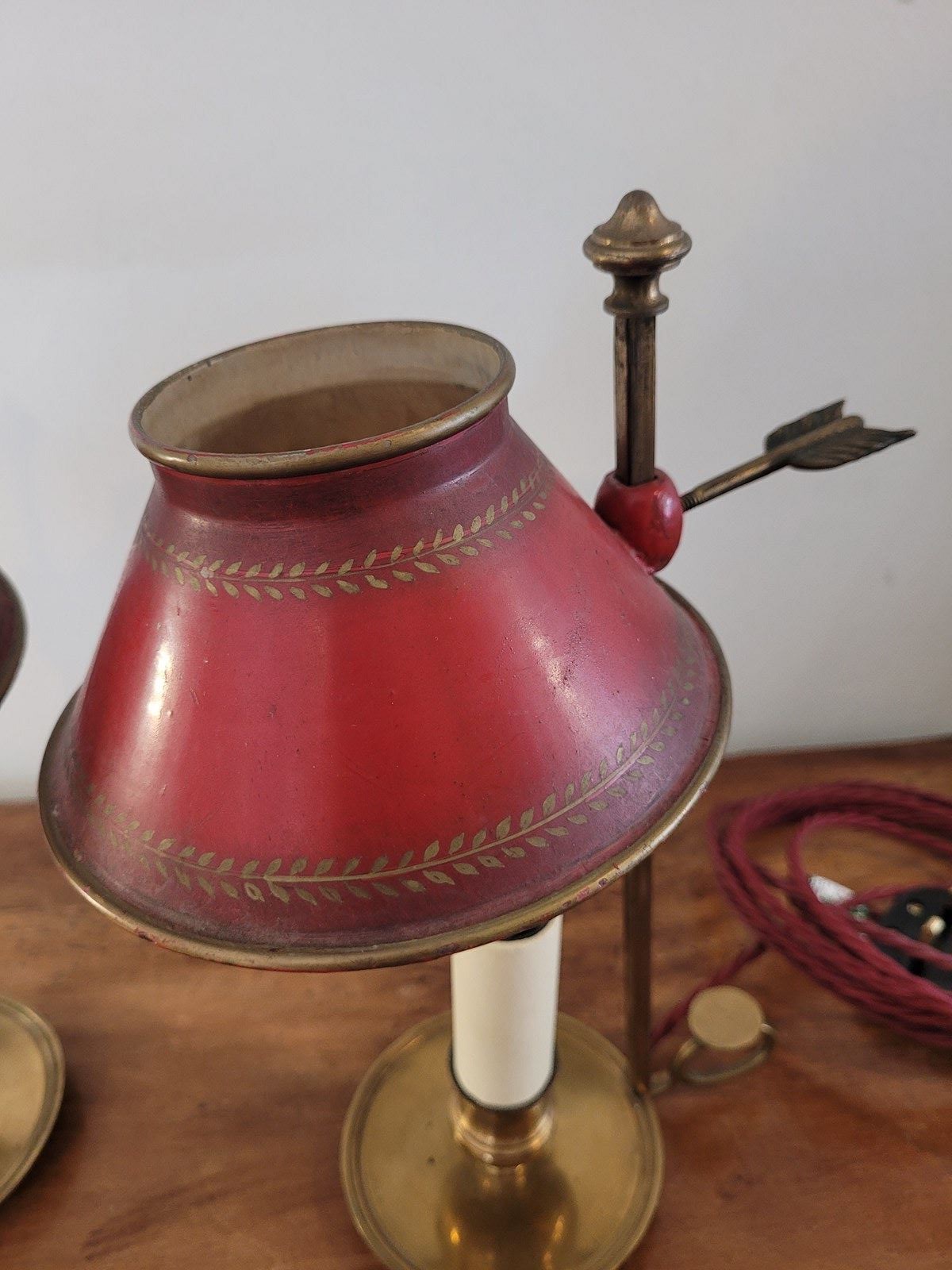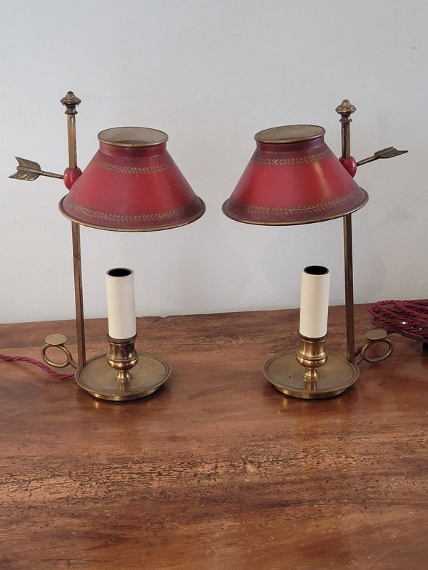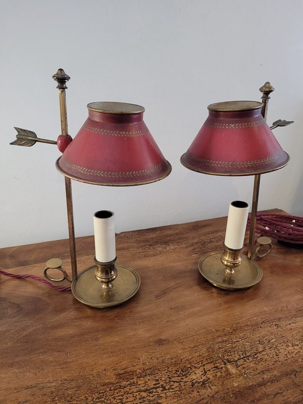A delightful pair of petite bouillotte lamps, ideal for side tables, bedsides or desk. Brass with tole shades in red with gold painted design dating from 1900/1920, fully rewired and tested. overall height 29cm