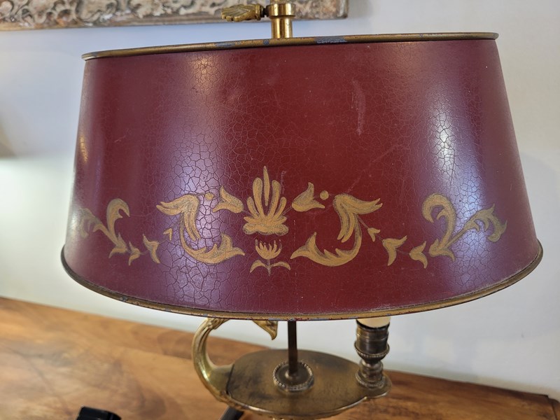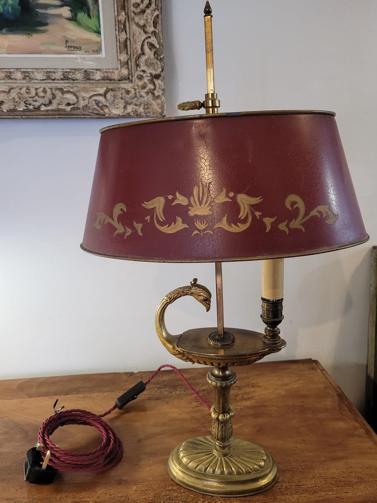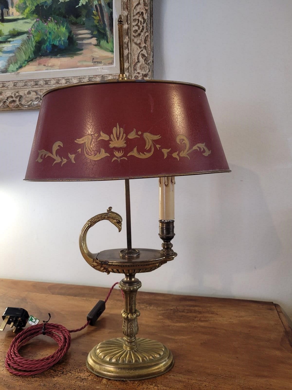 Empire style Bouillotte lamp rewired and tested. A handsome lamp sourced in France on a recent trip, this lamp has the lovely feature of a griffin head curved over forming the handle of an oil lamp which forms part of the base. Its red tole shade painted with a gold design is oval in shape and measures 35 cm x 23 cm at it's widest point ,the height of the shade is adjustable.