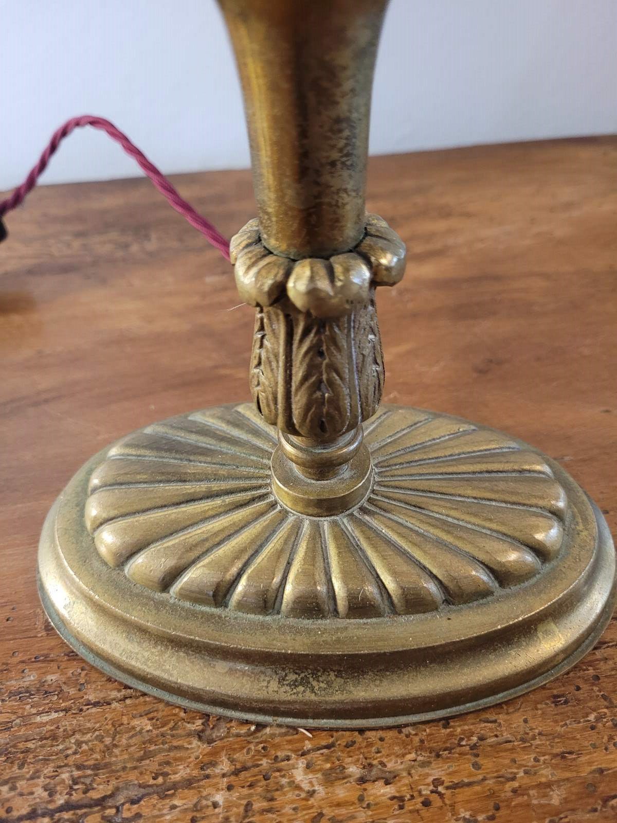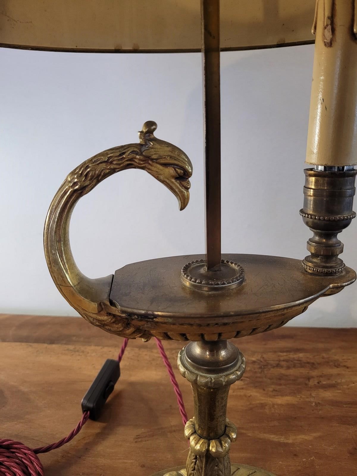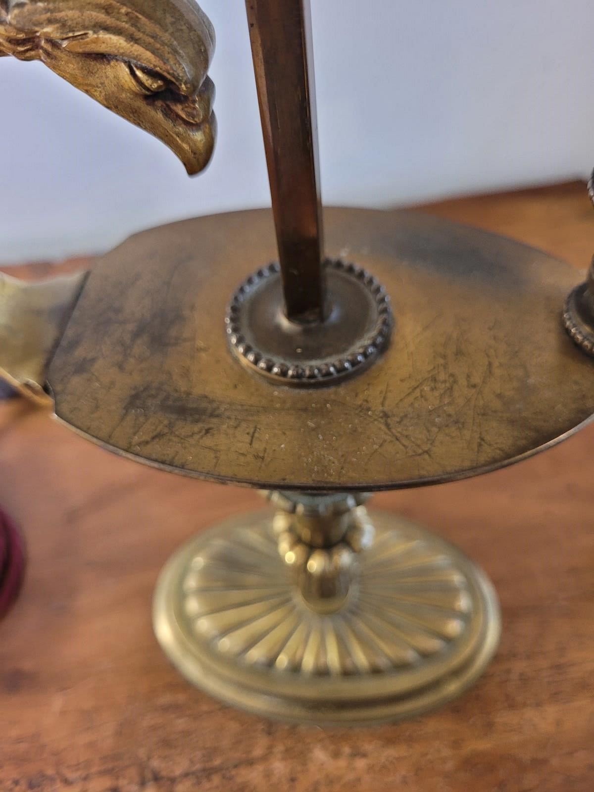 Empire style Bouillotte lamp rewired and tested. A handsome lamp sourced in France on a recent trip, this lamp has the lovely feature of a griffin head curved over forming the handle of an oil lamp which forms part of the base. Its red tole shade painted with a gold design is oval in shape and measures 35 cm x 23 cm at it's widest point ,the height of the shade is adjustable.
