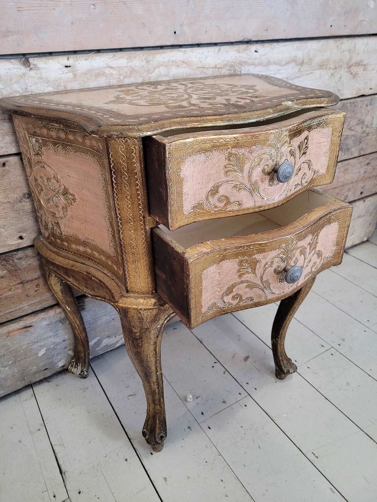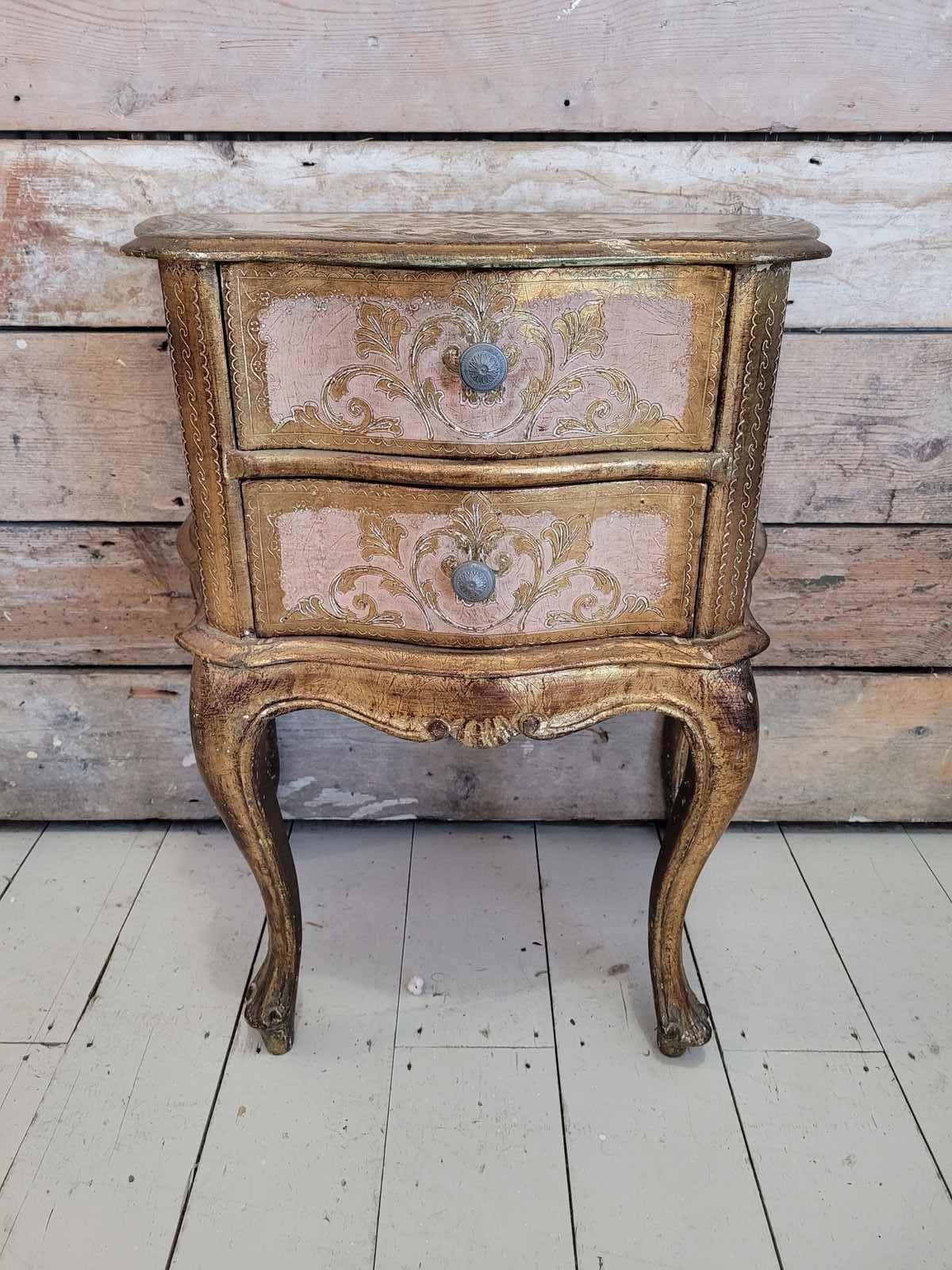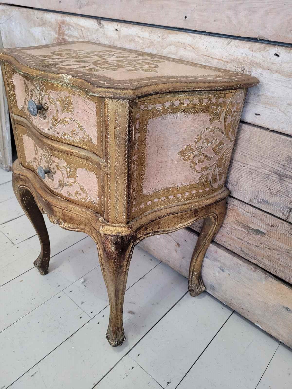 A very pretty Florentine nightstand hand crafted and decorated in a soft pink and gold, an unusual and rare combination. A versatile statement piece which would a touch of Italian style and glamour to any room or space not just as a bedside. Dating from the 1940s it is in wonderful condition, some natural signs of age and wear which are inevitable.