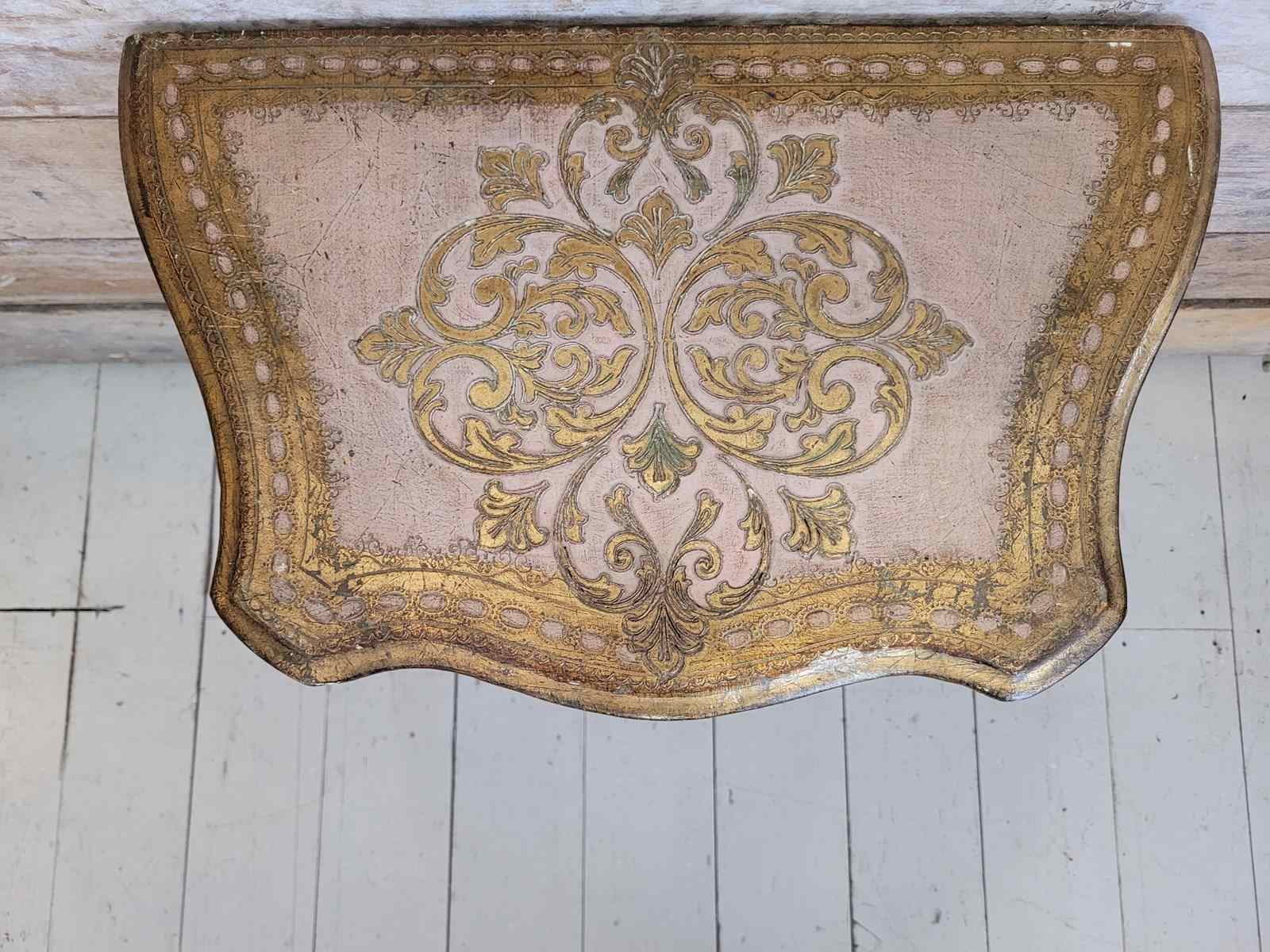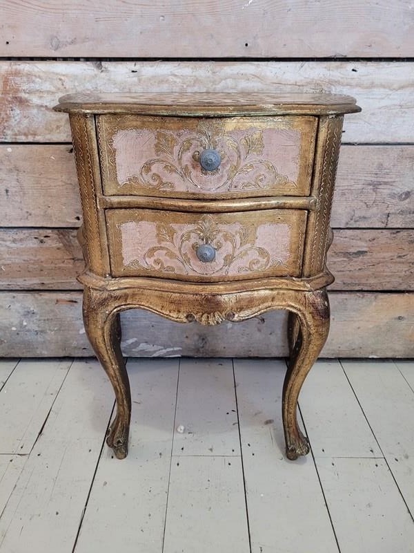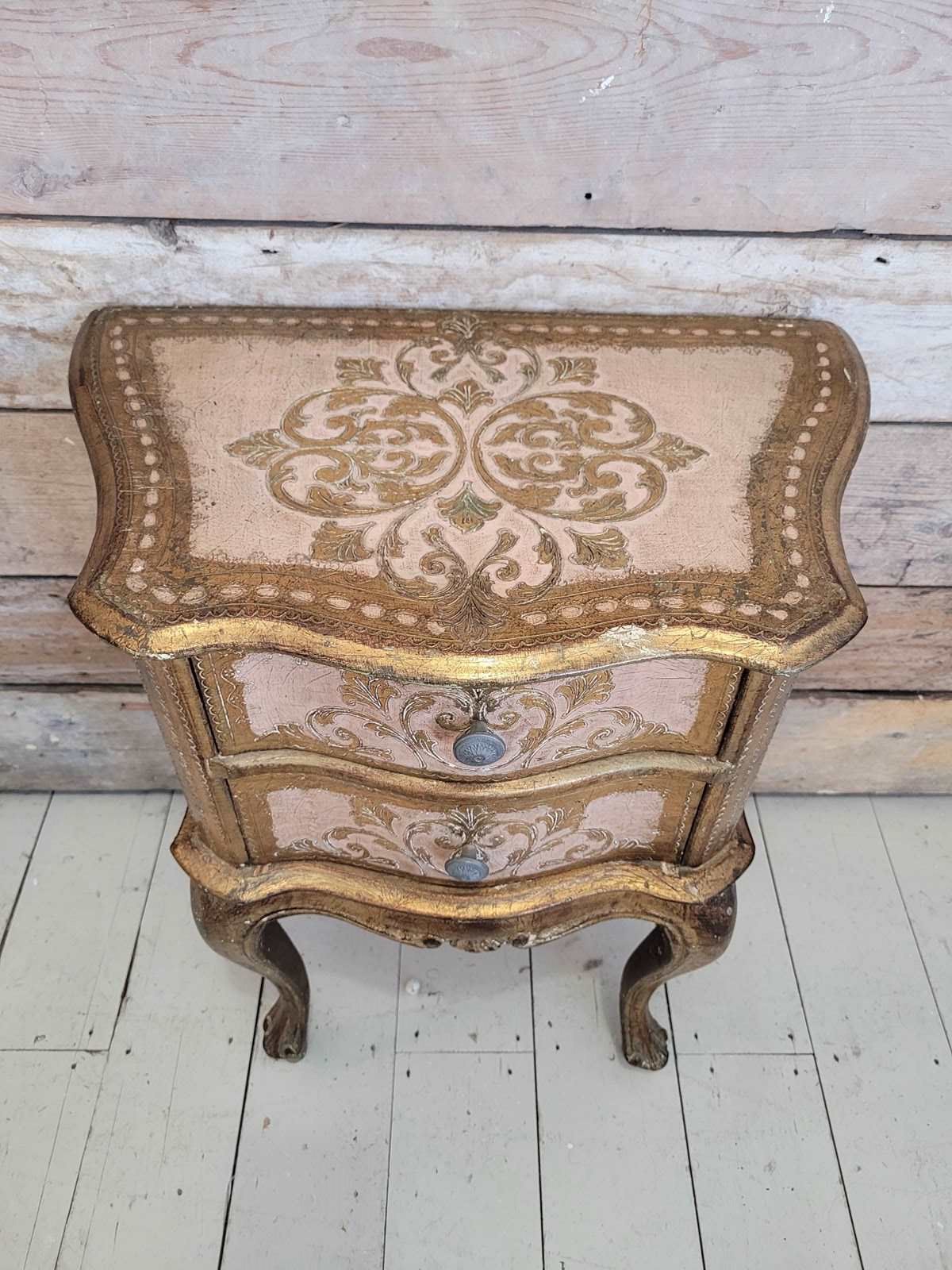 A very pretty Florentine nightstand hand crafted and decorated in a soft pink and gold, an unusual and rare combination. A versatile statement piece which would a touch of Italian style and glamour to any room or space not just as a bedside. Dating from the 1940s it is in wonderful condition, some natural signs of age and wear which are inevitable.
