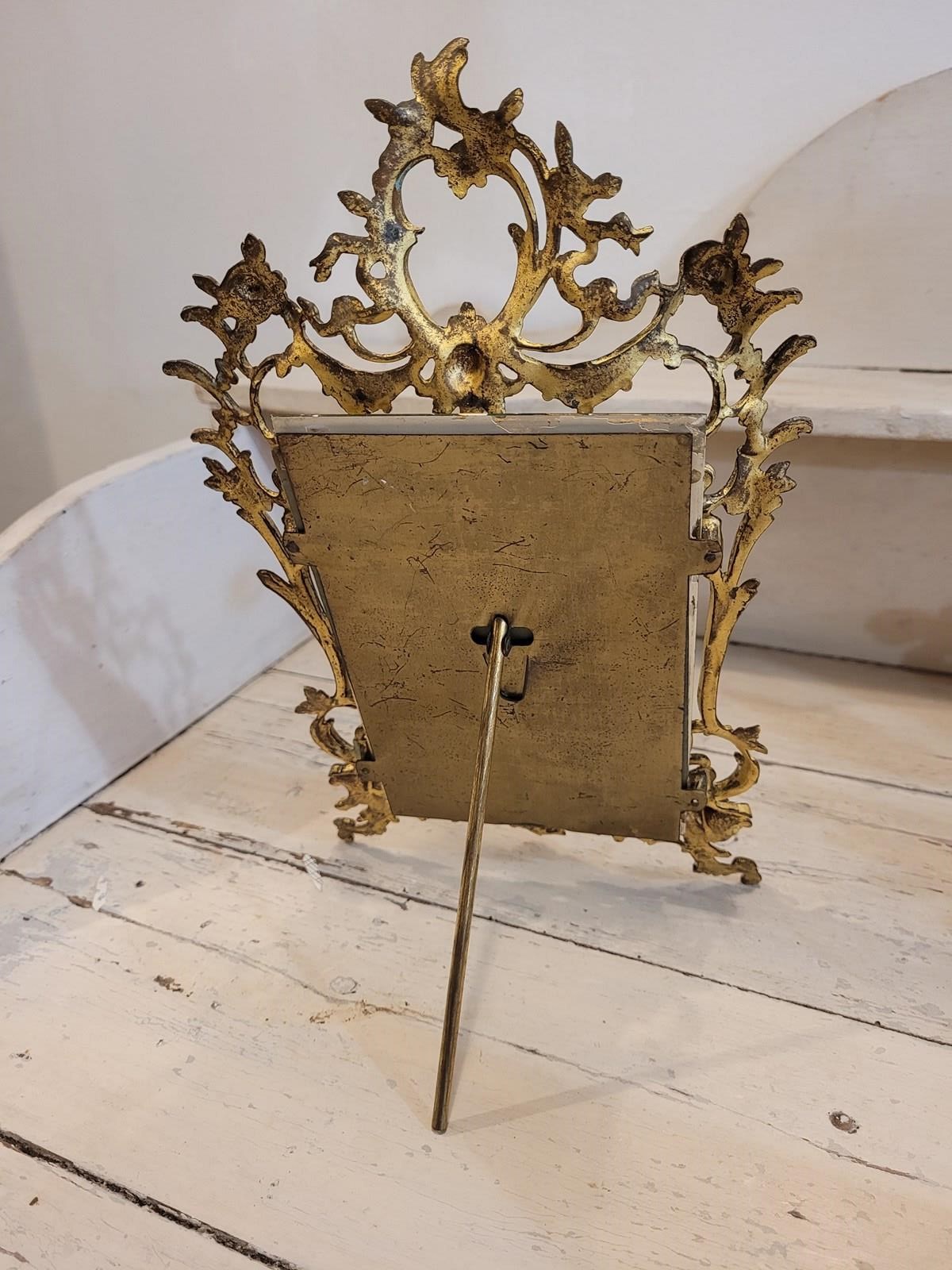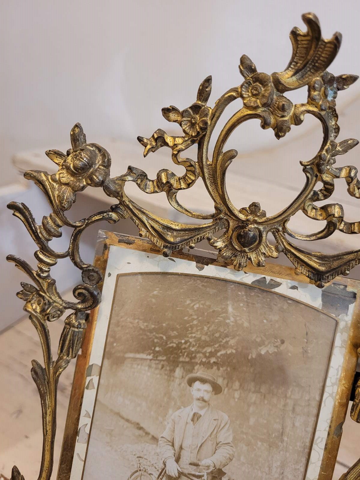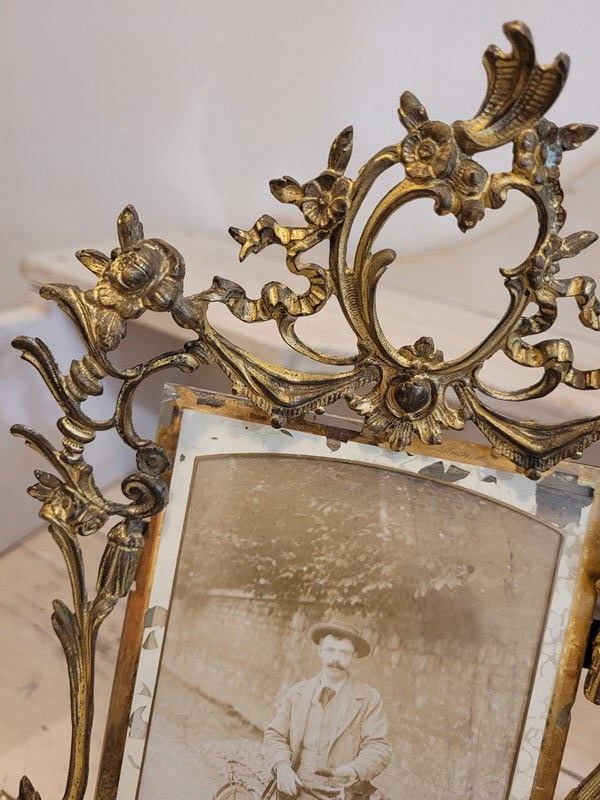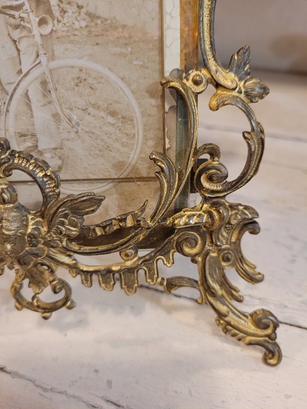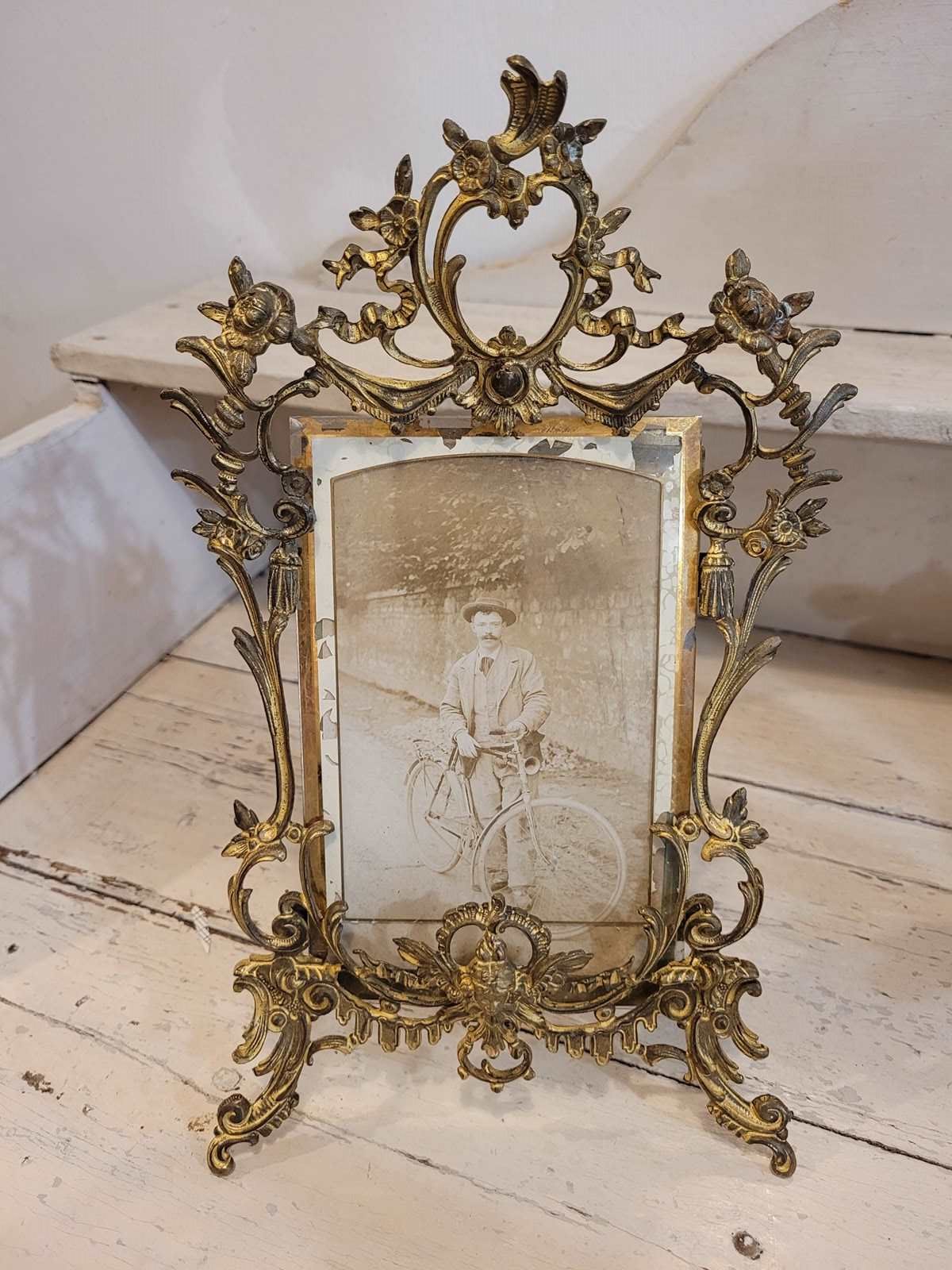 A very elegant French metalwork frame with floral and scrollwork. Late 19th century, it holds a sepia photograph of a gentleman with his bicycle in the attire of the day. A fine decorative piece with authentic French Character. This would make a wonderful gift. This item was sourced in France.