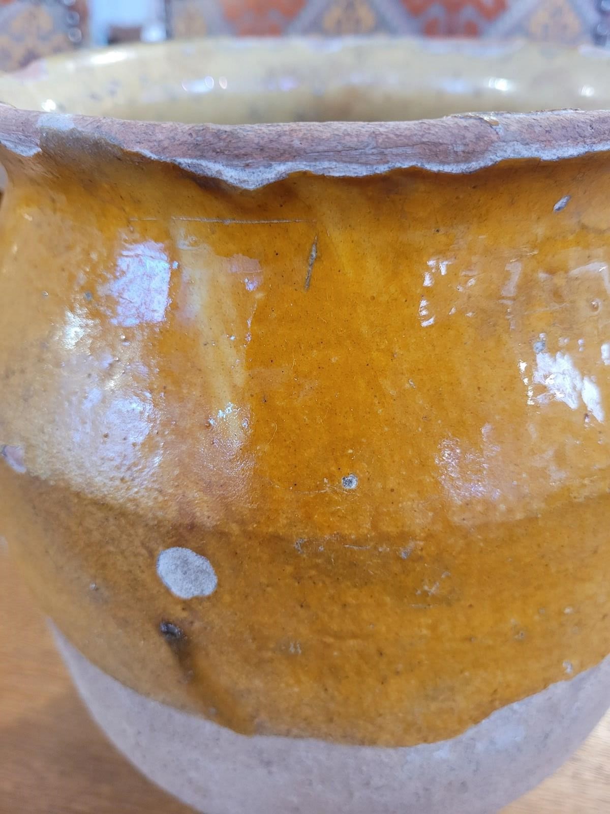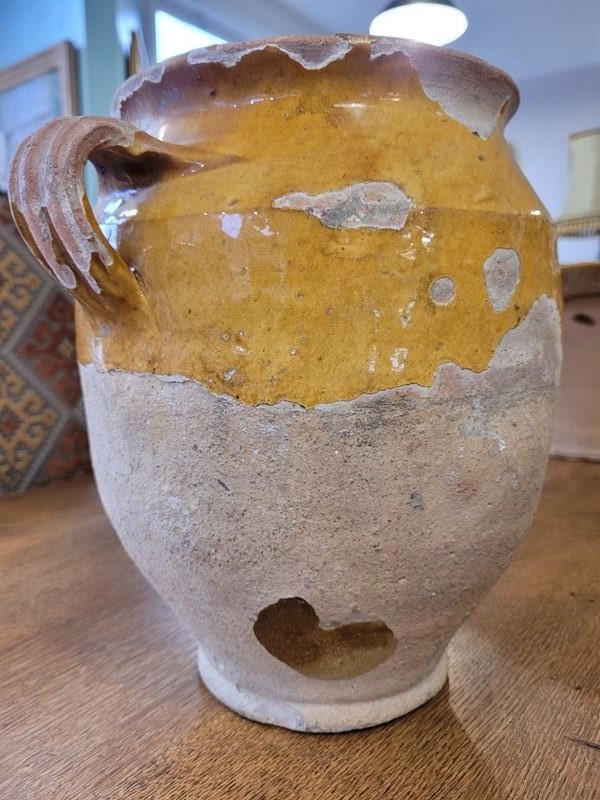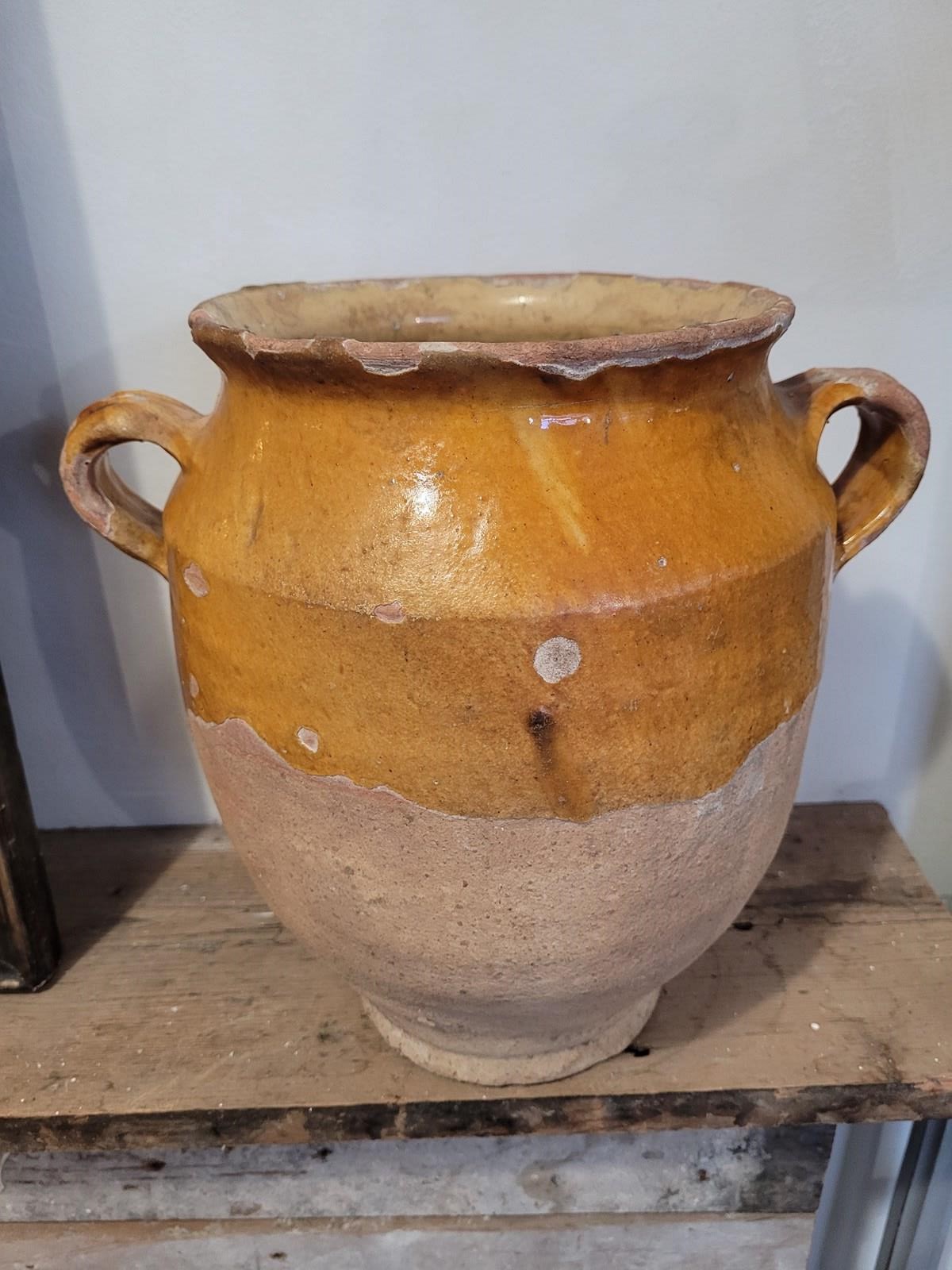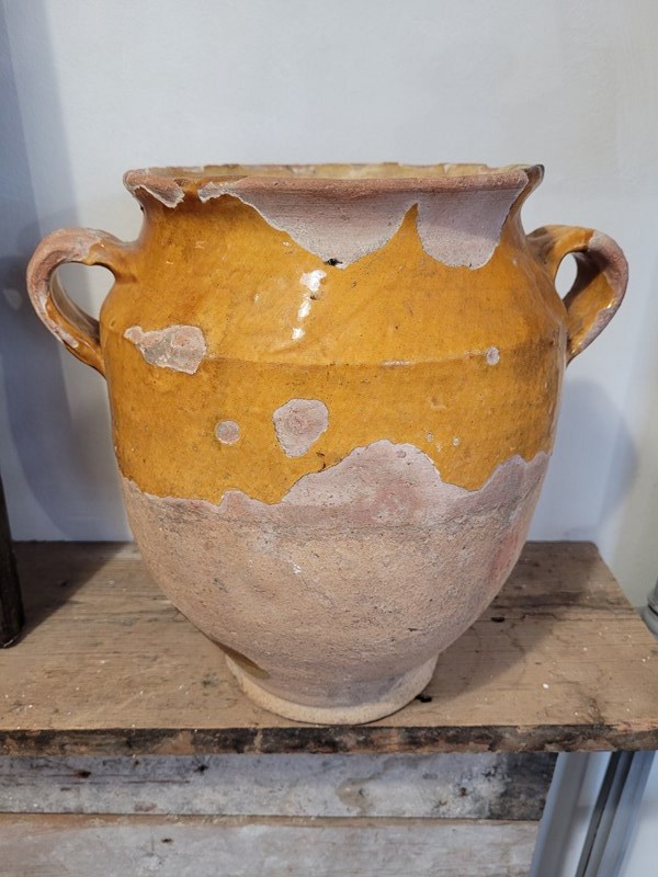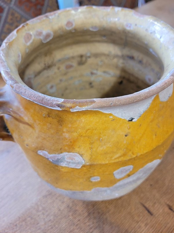 Lovely 19th century confit pot, mustard yellow glaze over it's upper half, timeworn beautifully giving it real character. The lower half remains unglazed, showcasing the pot's original function - storing meats in cool cellar conditions. Sourced in France, a lovely decorative piece. it stands 26 cm tall and measures 17 cm across the top.