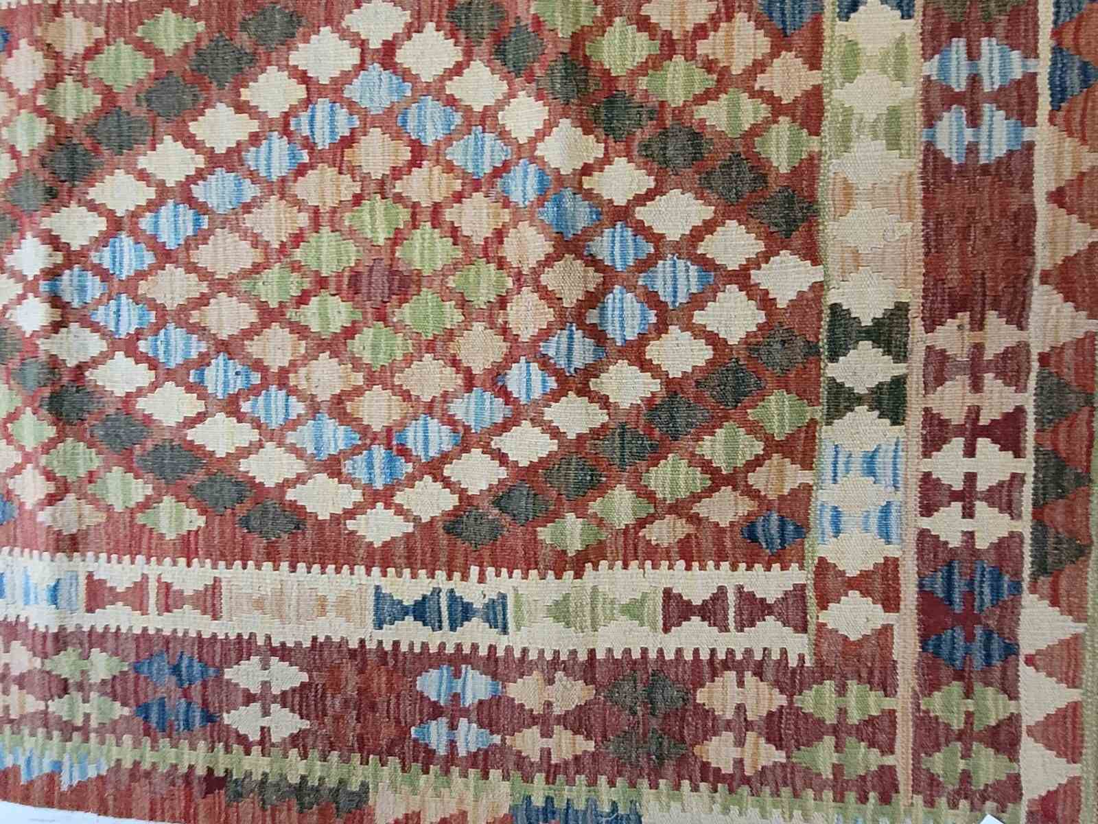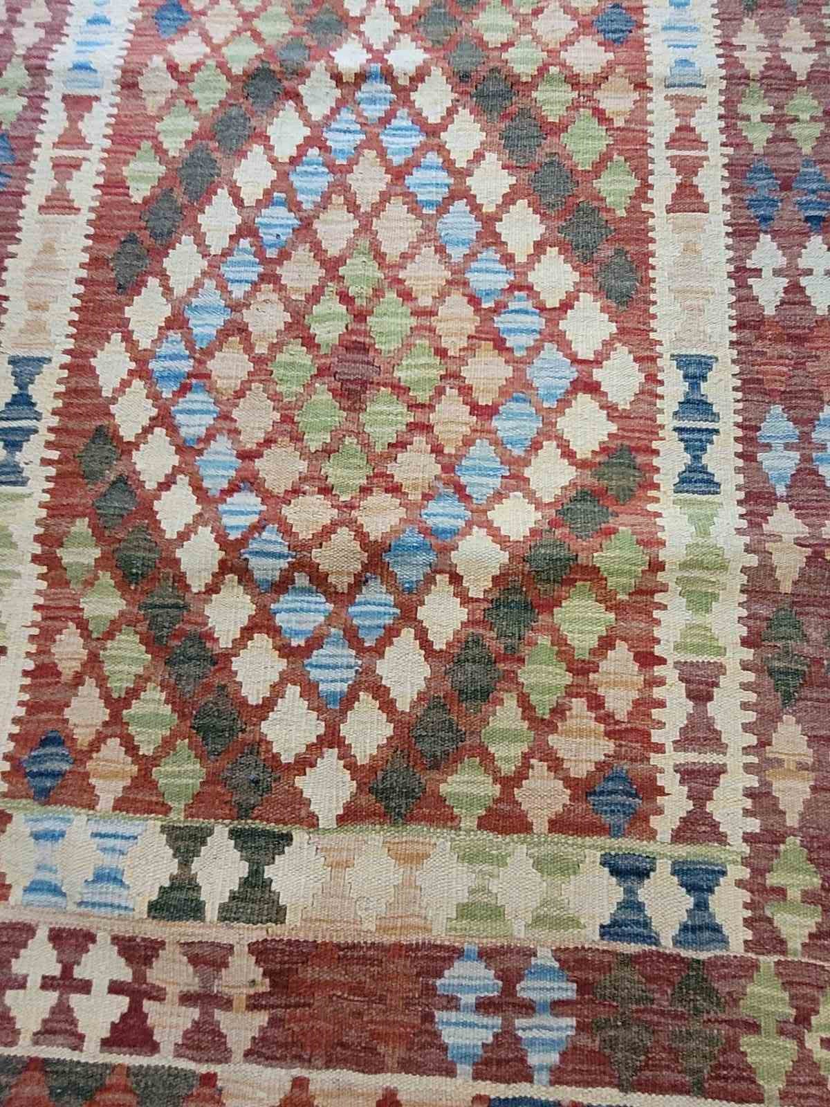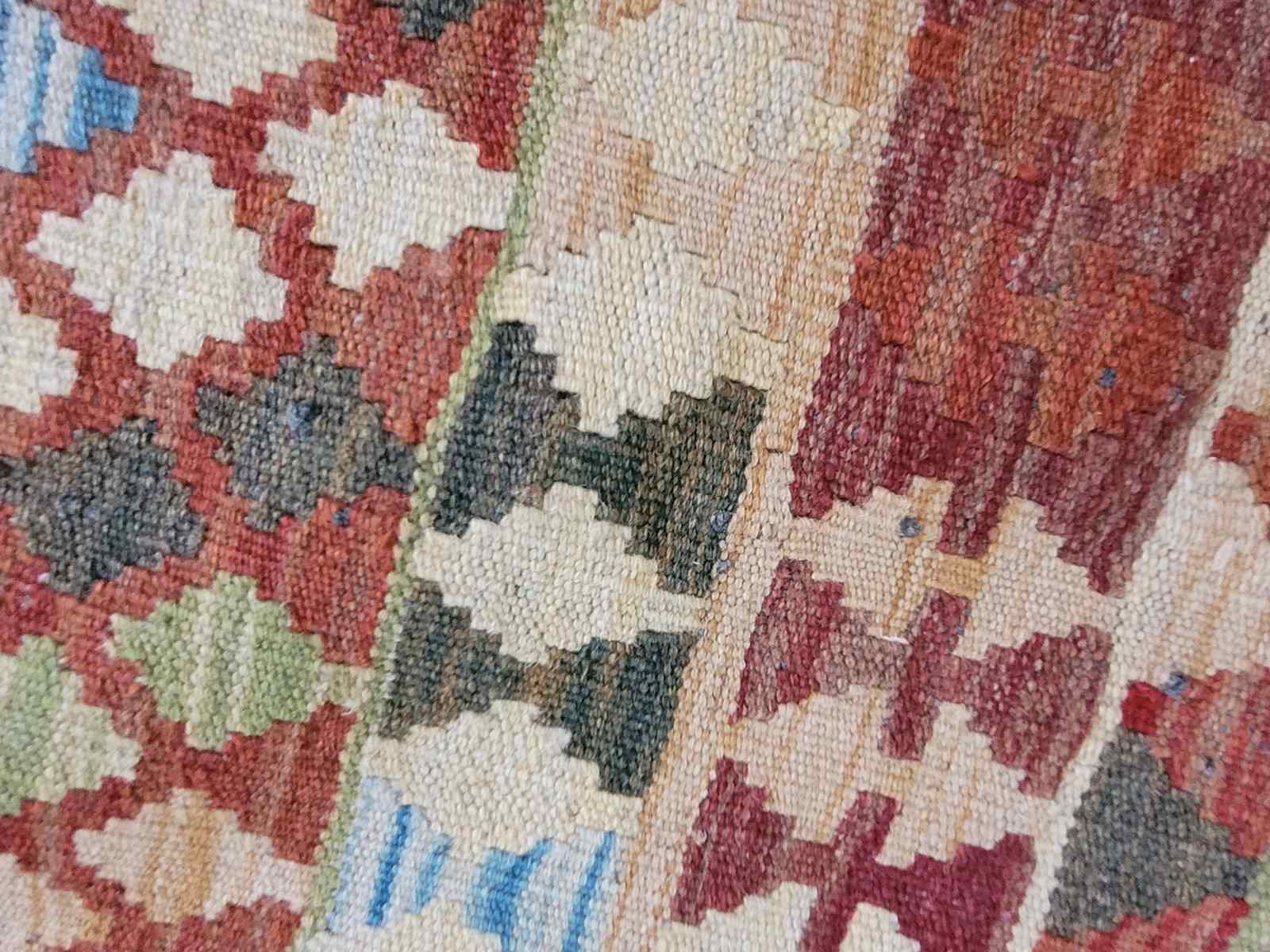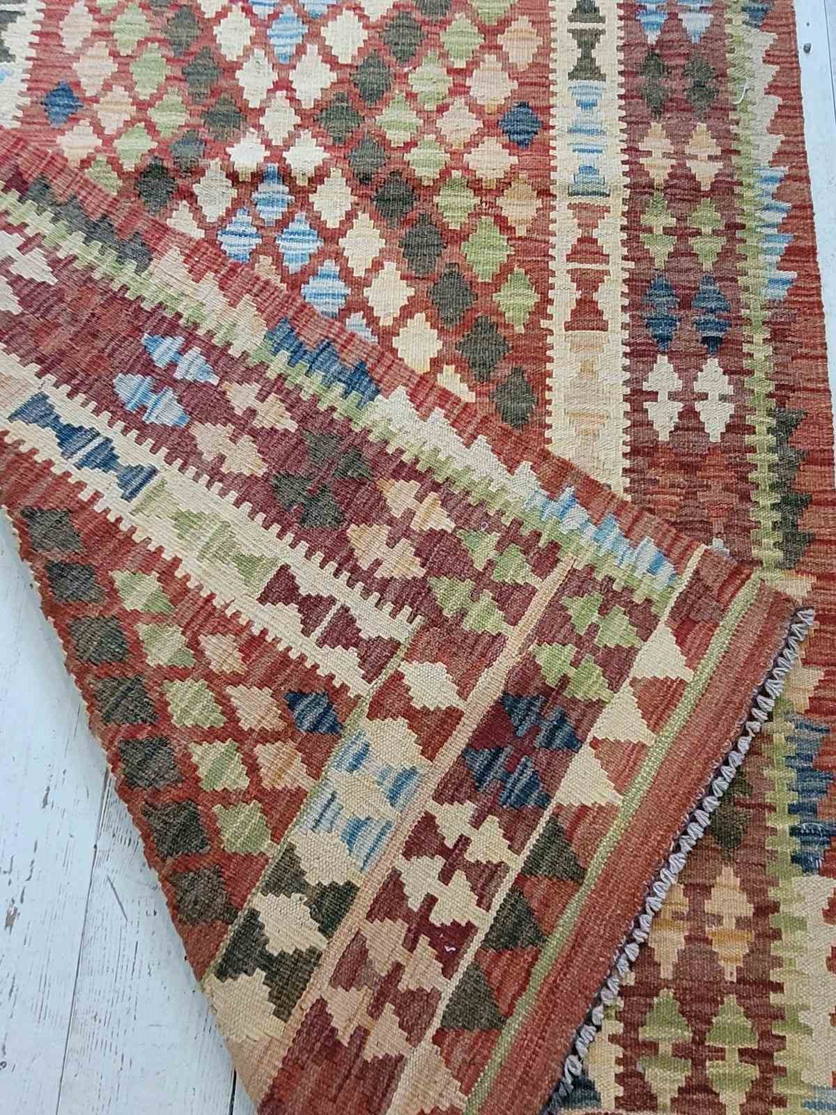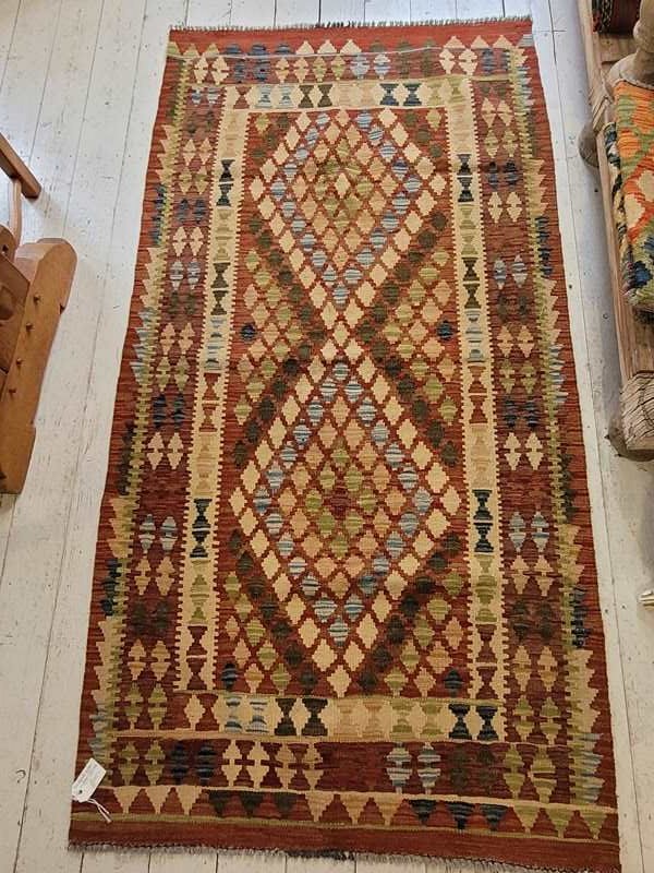 Vintage handmade Afghan kilim made from pure wool measuring 100 x 194 cm in lovely warm colours. Kilim's fit well into modern or more rustic settings adding colour, warmth and texture. This is a great size for a hallway, hearth or in front of a sofa.