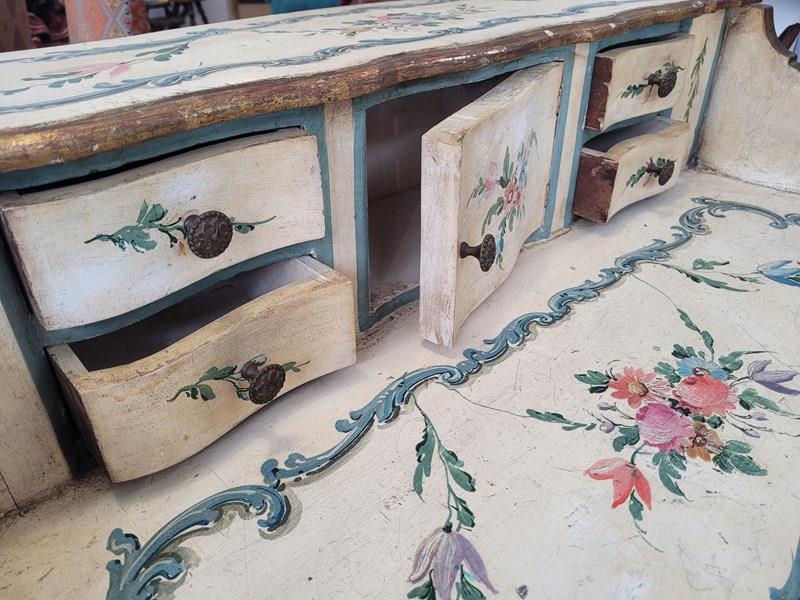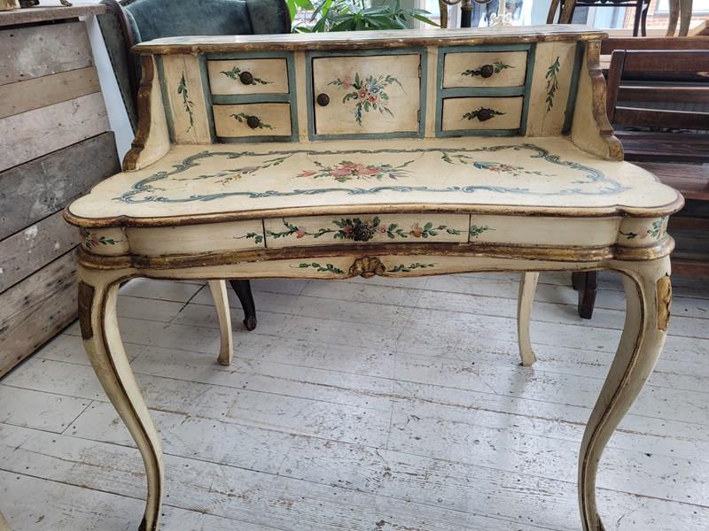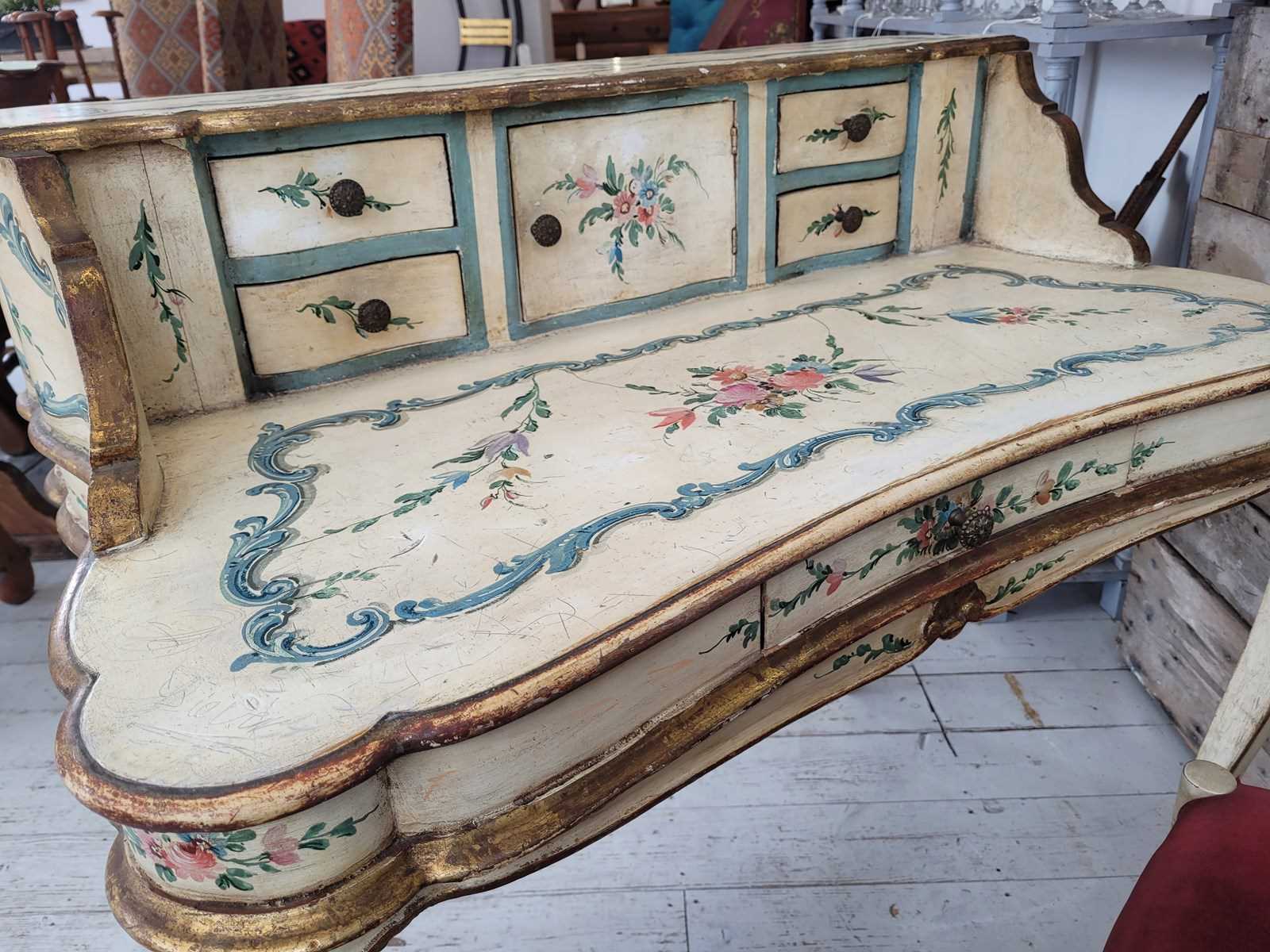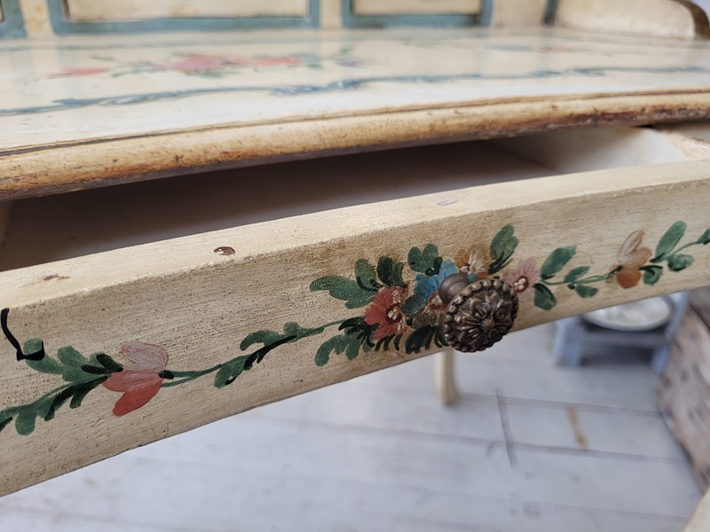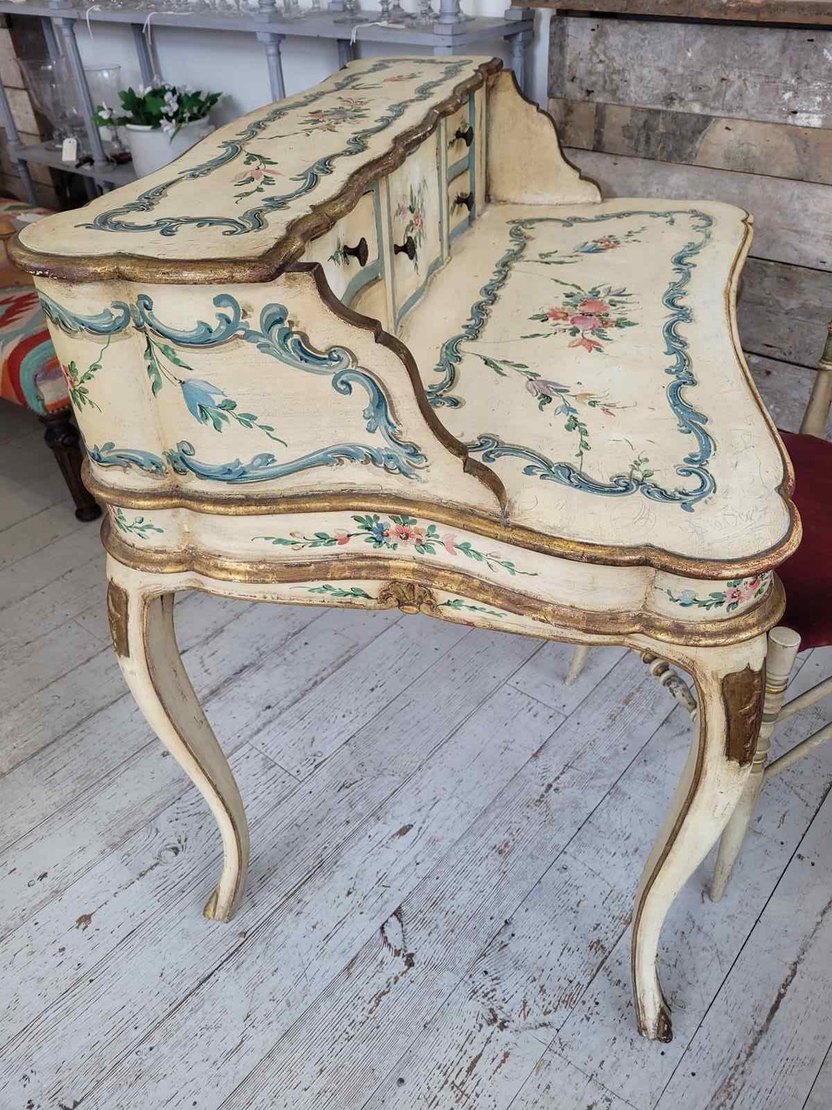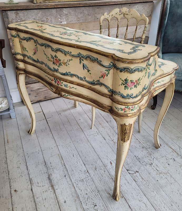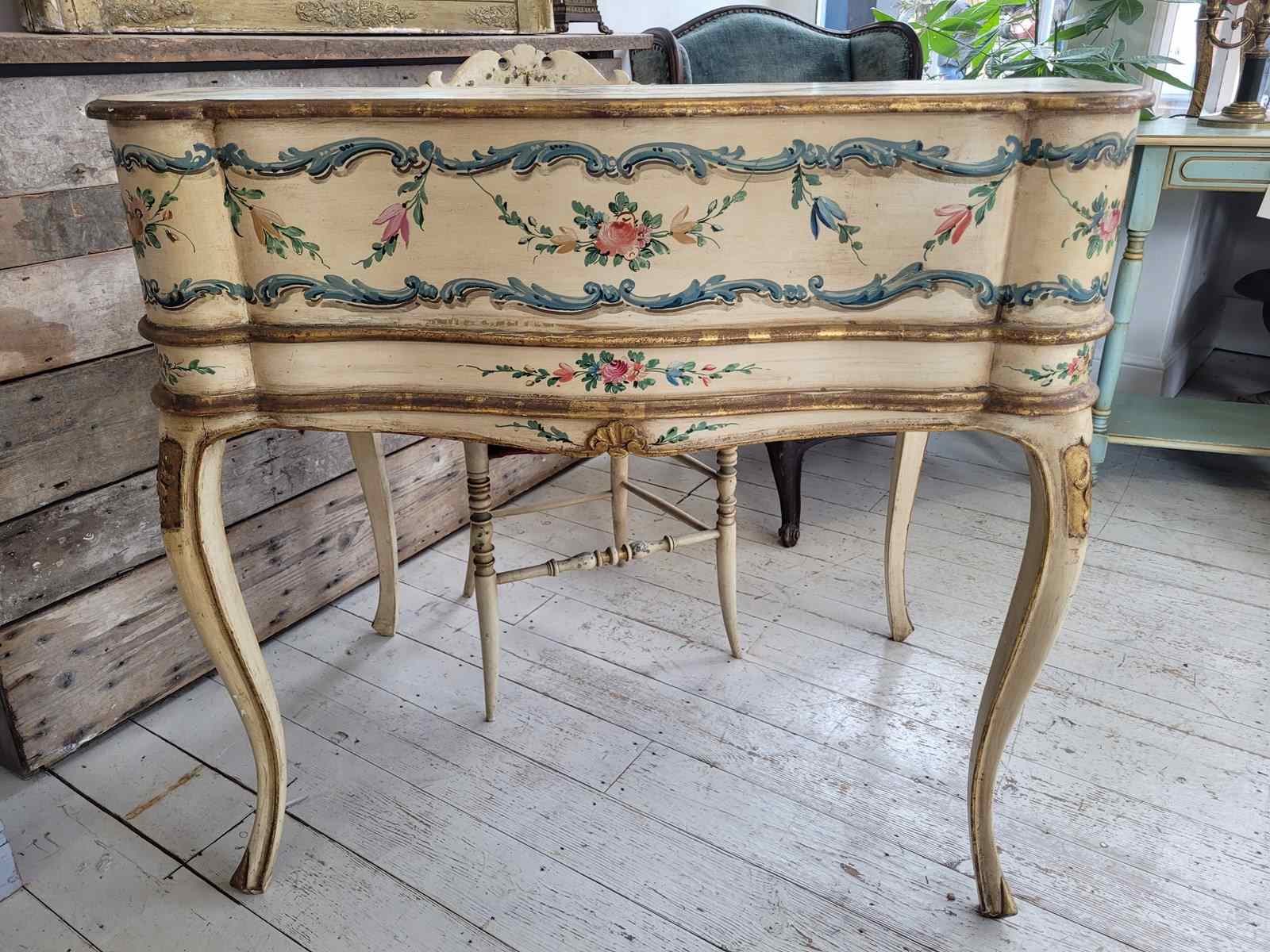 For me this was a Coup de Coeur, a rare find and so pretty. Hand painted with flowers swags and gold highlights this ladies desk is stunning .Standing on its pretty elegant cabriole legs and curvy shape it is a truly feminine piece. It has sadly suffered from being written on over the years but it has been priced accordingly and its beauty still shines, I have shown this in the photographs. A real interior design piece as well as practical, a real statement piece.