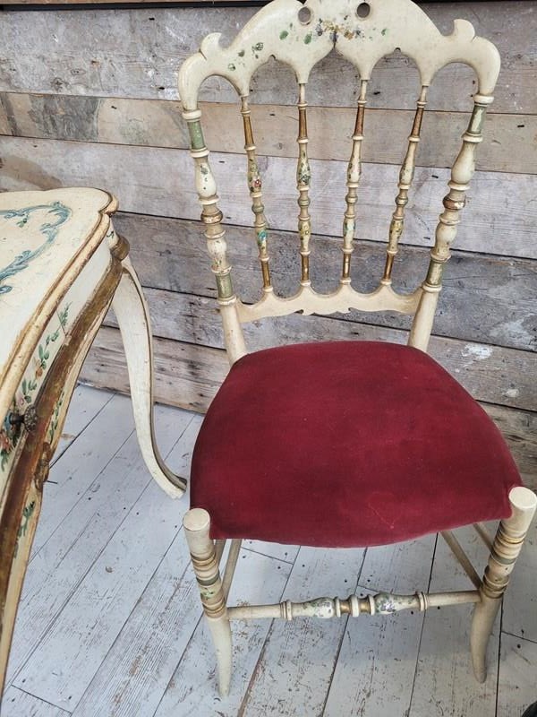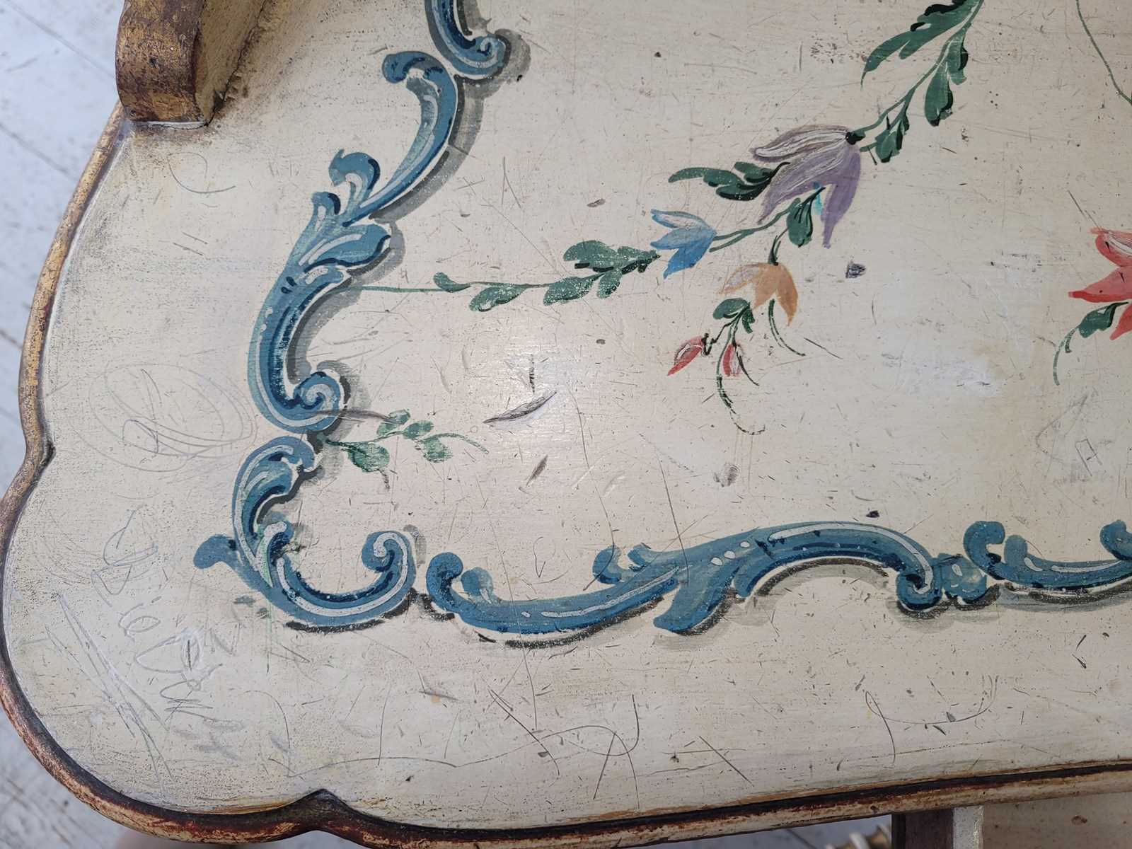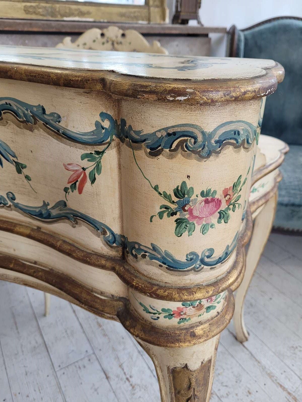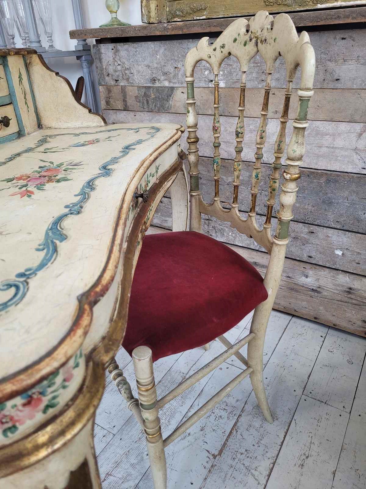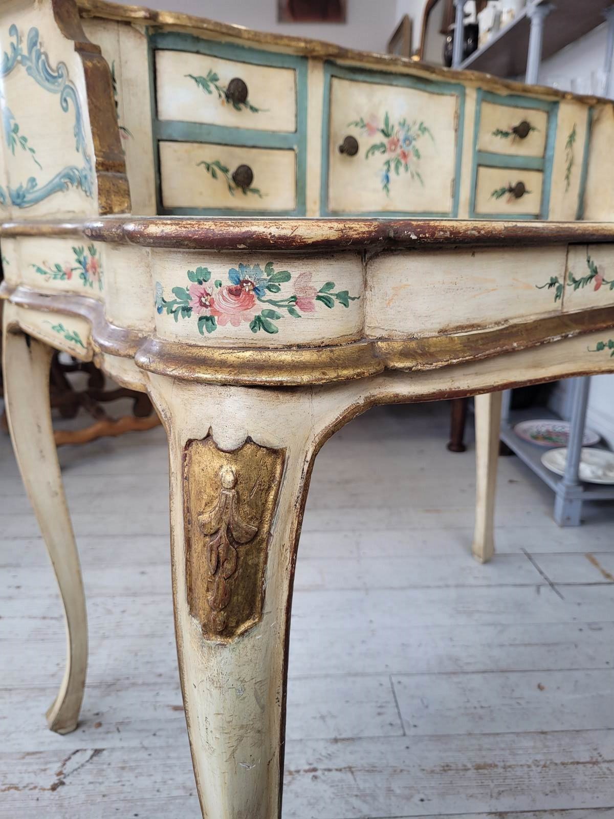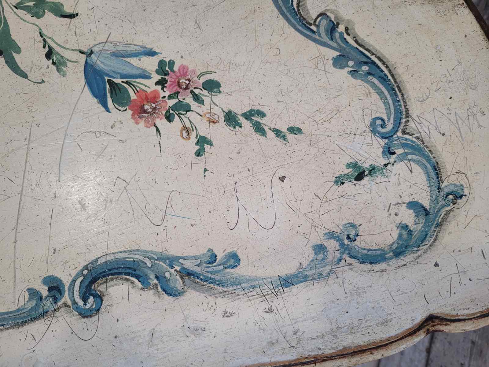 For me this was a Coup de Coeur, a rare find and so pretty. Hand painted with flowers swags and gold highlights this ladies desk is stunning .Standing on its pretty elegant cabriole legs and curvy shape it is a truly feminine piece. It has sadly suffered from being written on over the years but it has been priced accordingly and its beauty still shines, I have shown this in the photographs. A real interior design piece as well as practical, a real statement piece.