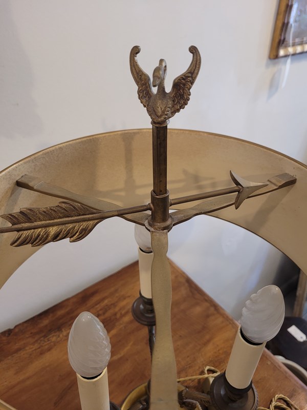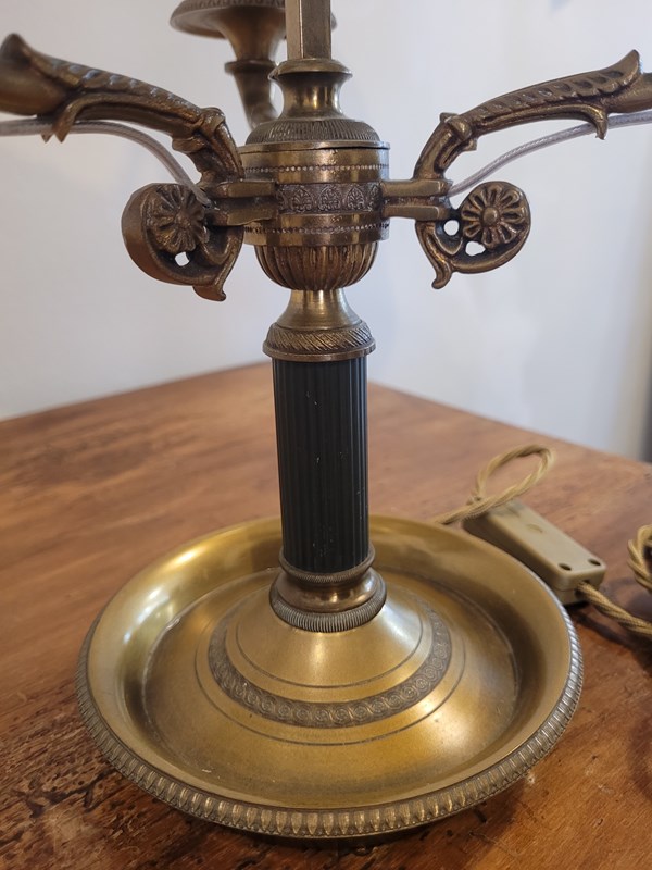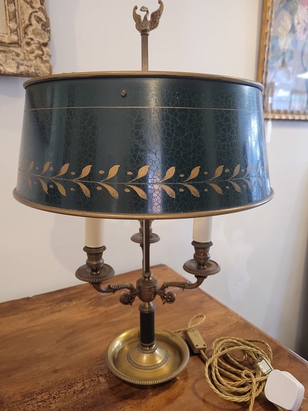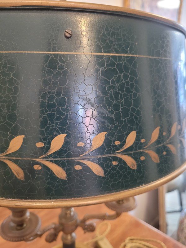 A very chic antique bouillotte lamp that has a tole shade with hand painted gold leaf design.