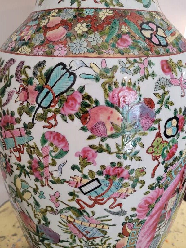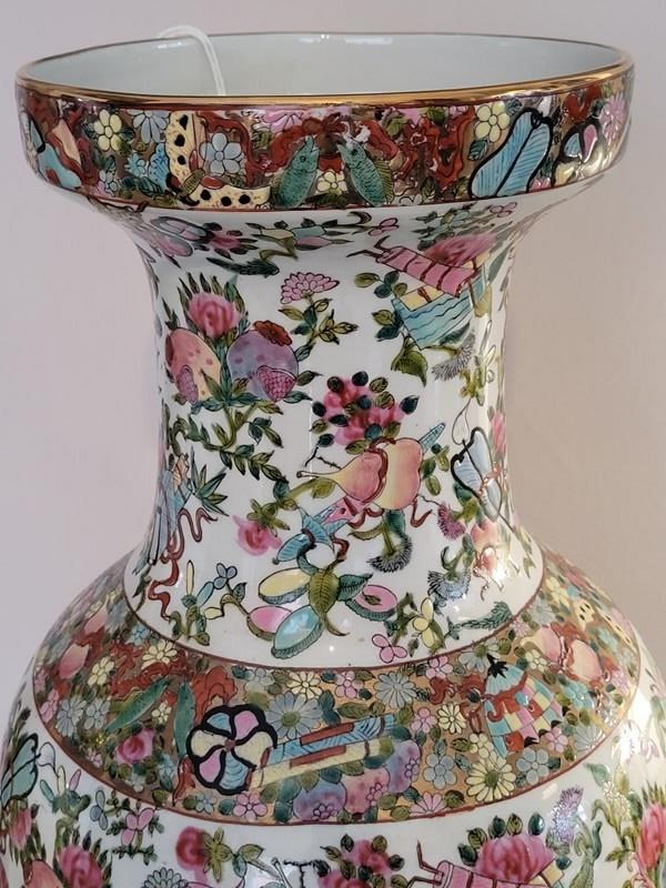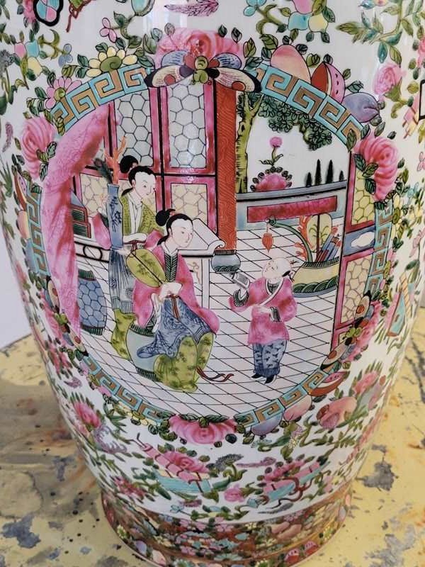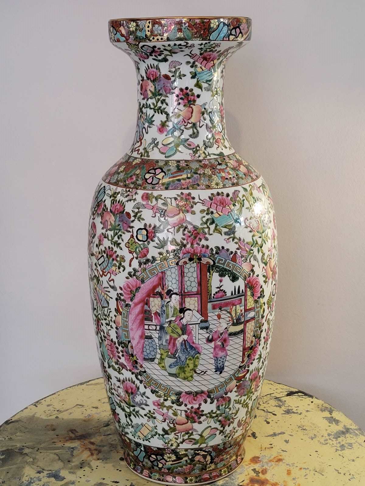 A beautifully decorated famille rose vase in perfect condition, standing 62 cm tall. This is a real statement piece with a lovely colour palette of pinks, soft blues and greens with a pictorial panel on either side of the vase depicting ladies in traditional dress and a boy. I have not been able to date the vase precisely by its mark to the base.