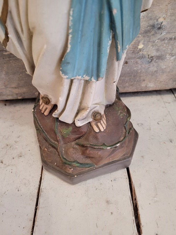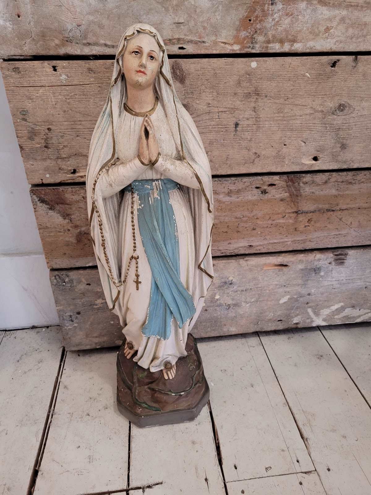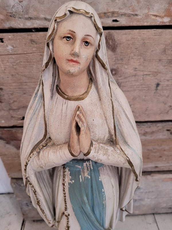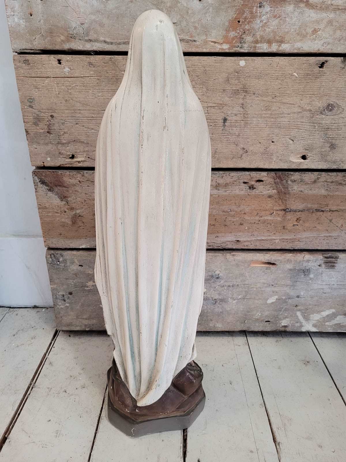 A serene mid 20th century French Madonna in the classic Lourdes style, beautifully modelled in plaster with hand painted details. She wears the traditional white robes with blue sash, with delicate gold edging. The rocky grotto style base is typical of French devotional pieces linked to Lourdes pilgrimage shops of the 50s -70s. At 52 cm tall, she has a real presence. A gentle contemplative figure that works equally well as a devotional piece or as part of a French country or rustic interior scheme. The paintwork is soft, the overall condition is very good for age.