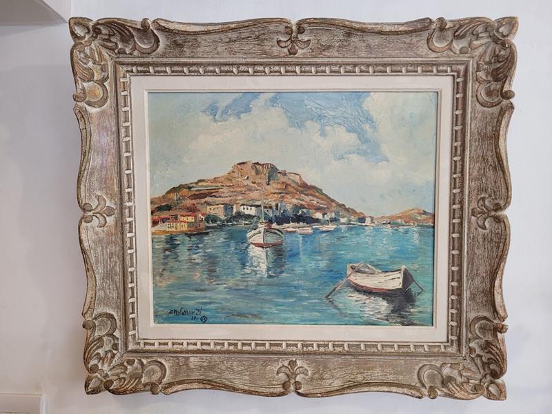 A lovely painting depicting boats in a calm cove off a rocky coastline with its charming village. Could this be a Greek island ? one can only guess.