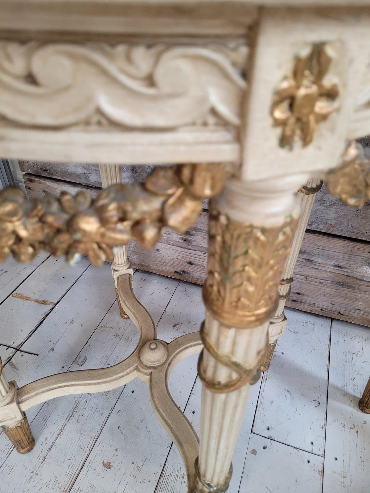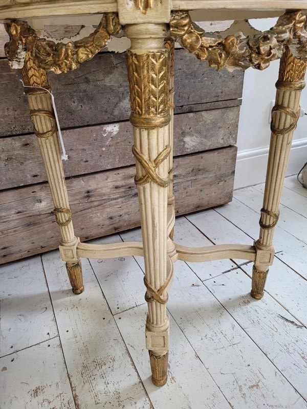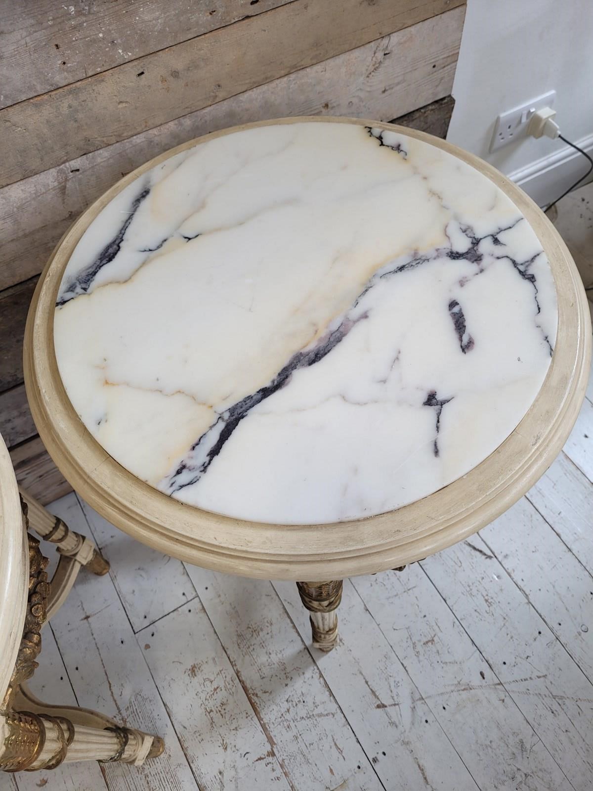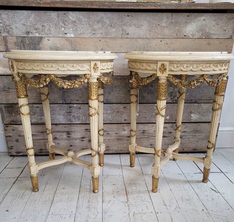 A pair of French neo classical side tables with marble tops and gilded swags of flowers dating from the 1920s.