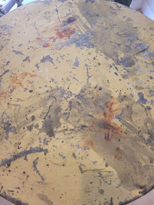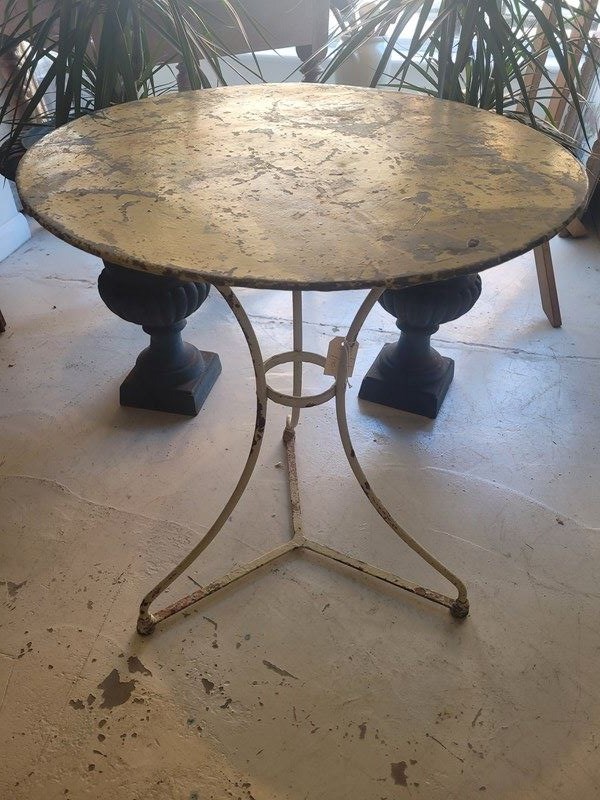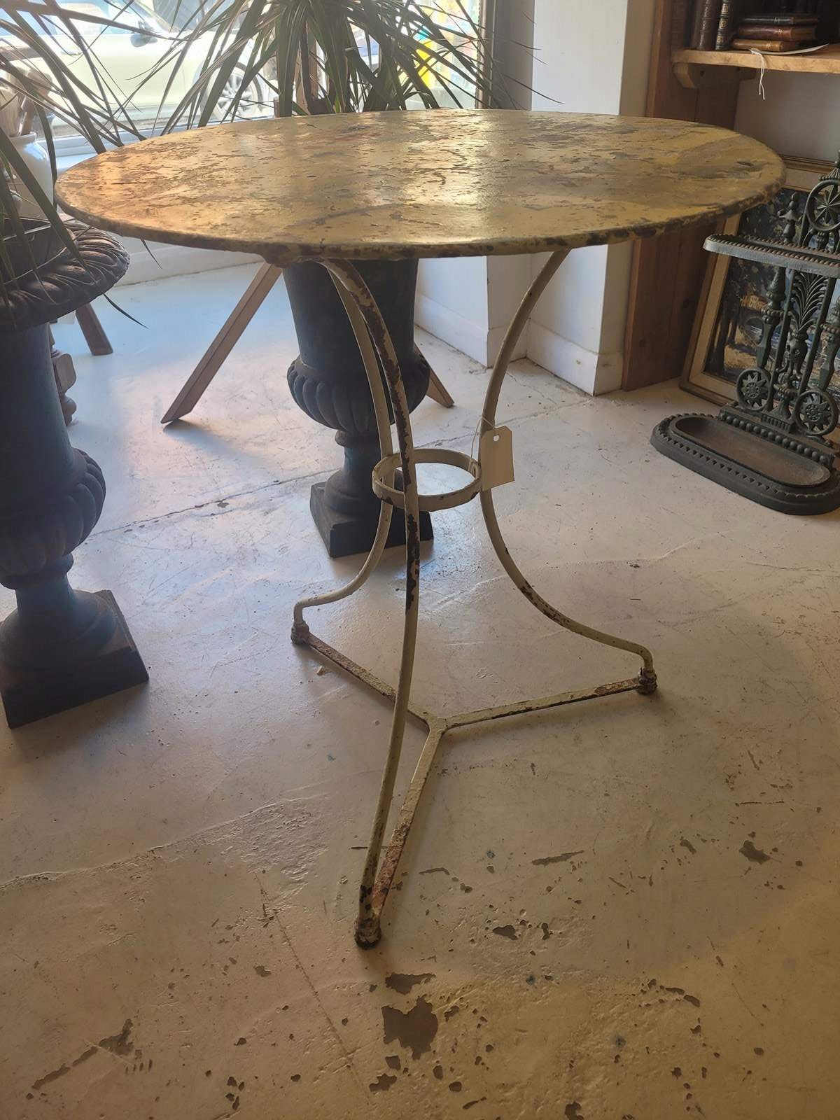A pretty little French metal gueridon table measuring 60cm across and 70cm high. The top is like a work of art with its natural wear of the paint. The table is a good weight, completely sound and stable.