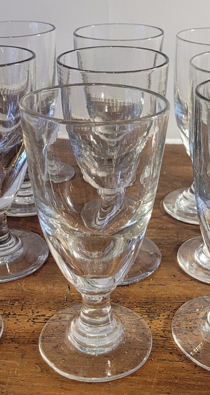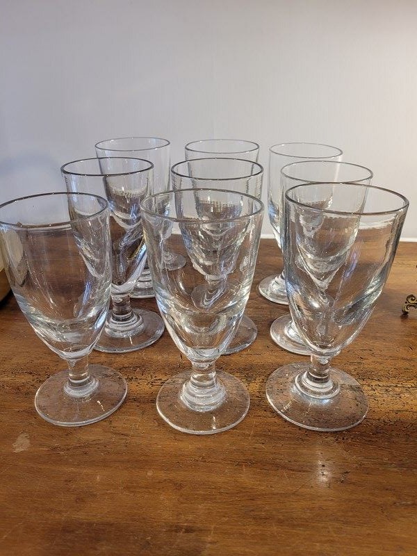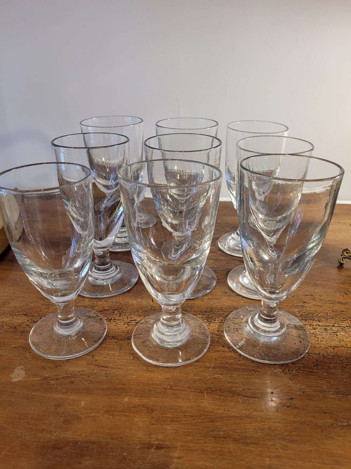 A beautiful and rare set of nine antique glasses. There are subtle variations in form confirming hand blown origins, adding character and authenticity. Excellent condition throughout, with clear glass and no chips. Sourced in France full of Belle Epoque charm.