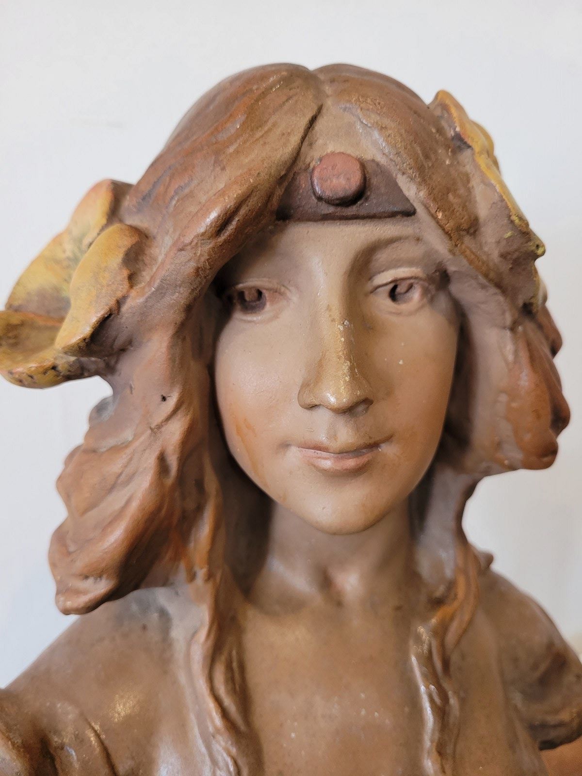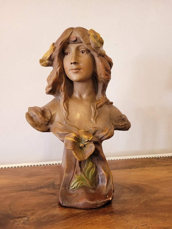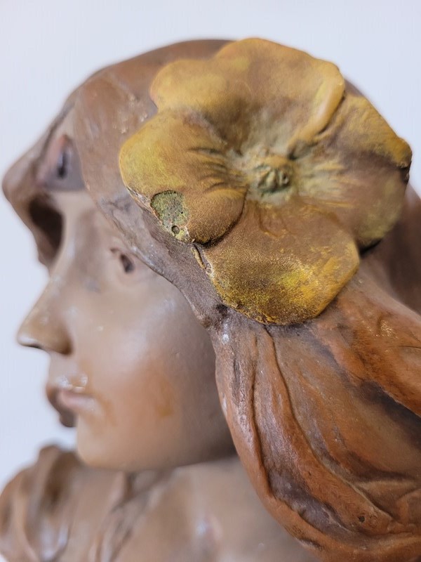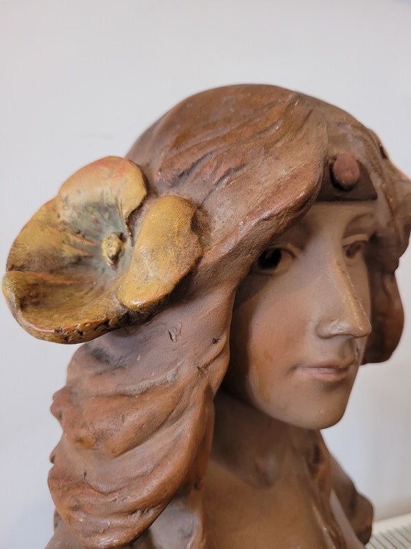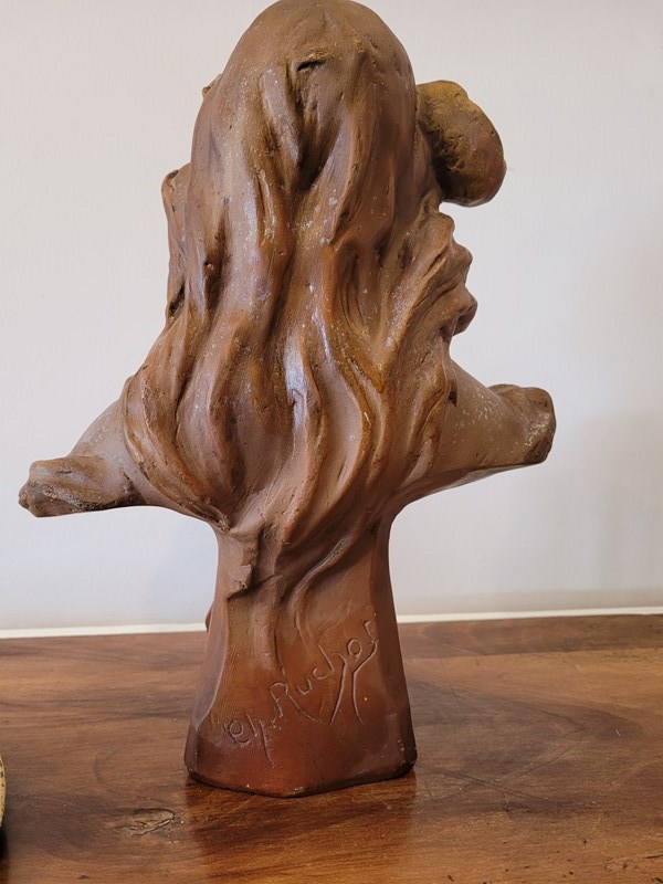 This very pretty Art Nouveau bust is signed to the back Ch Ruchot, Charles Ruchot was a famous French sculptor born in 1871 deceased 1954. The bust is made of terracotta and is in very good condition for its age, just a few signs of wear. Standing 37 cm tall by 30 cm wide, she is a very decorative item from the Art Nouveau period. A wonderful gift for someone who loves this period.