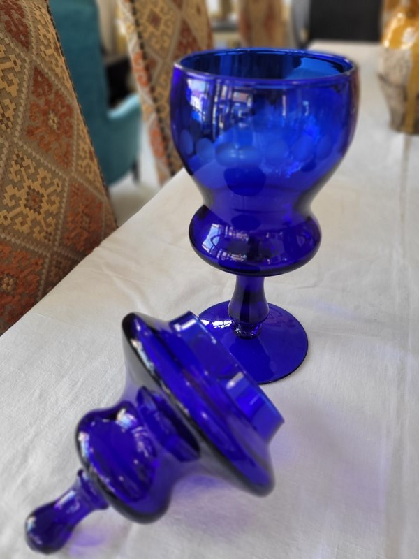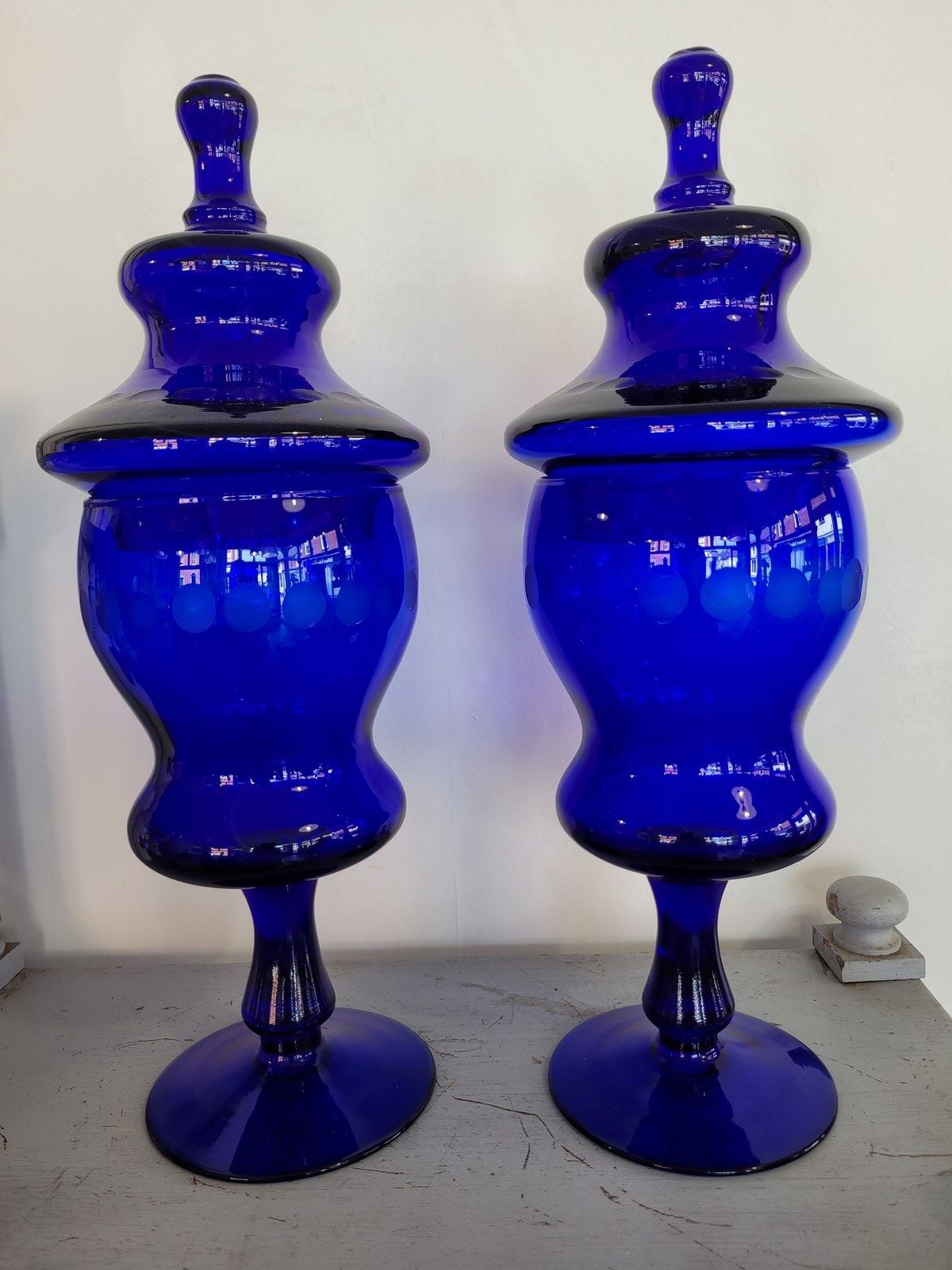 An absolutely stunning pair of cobalt blue Murano lidded glass jars.