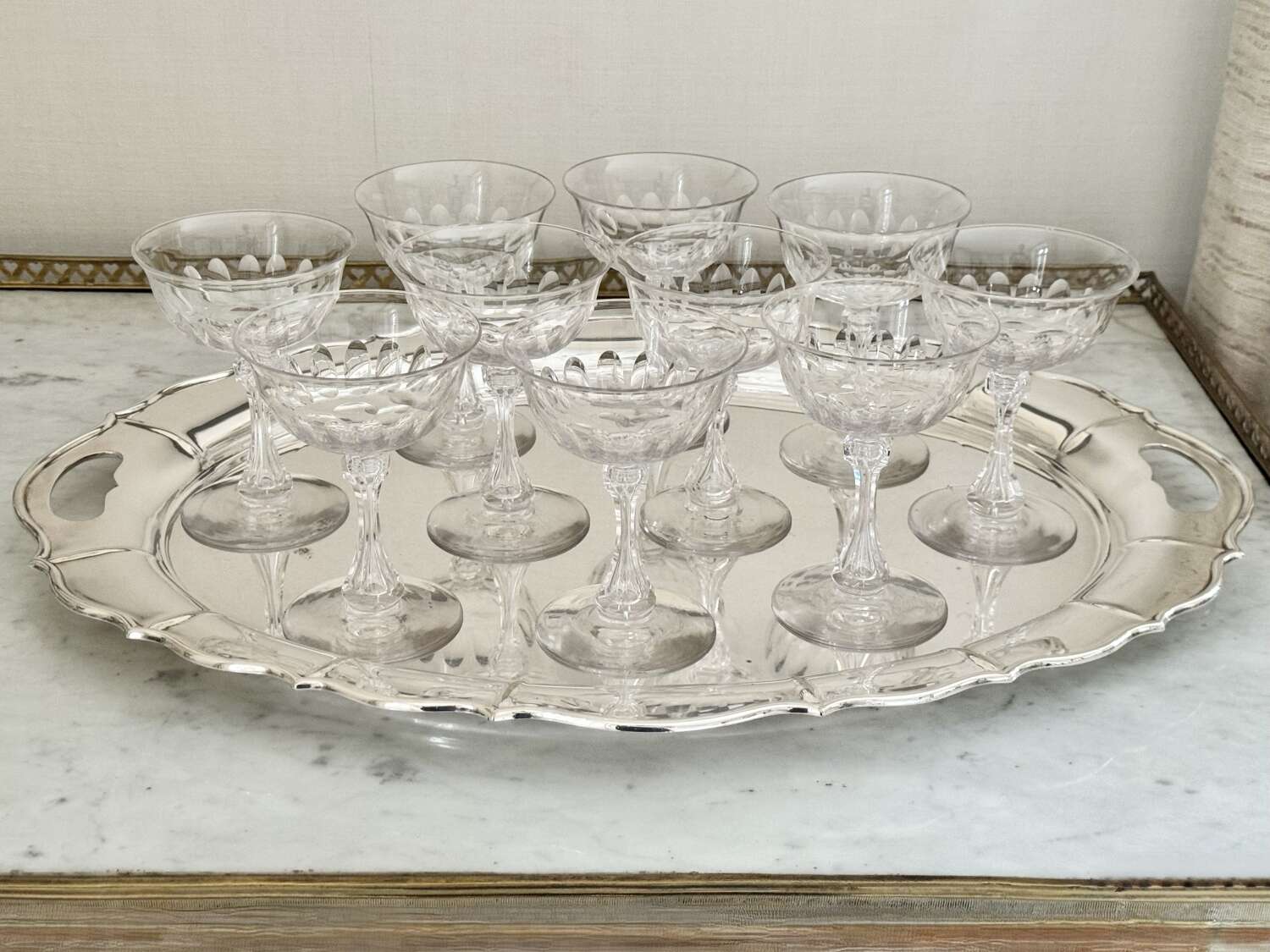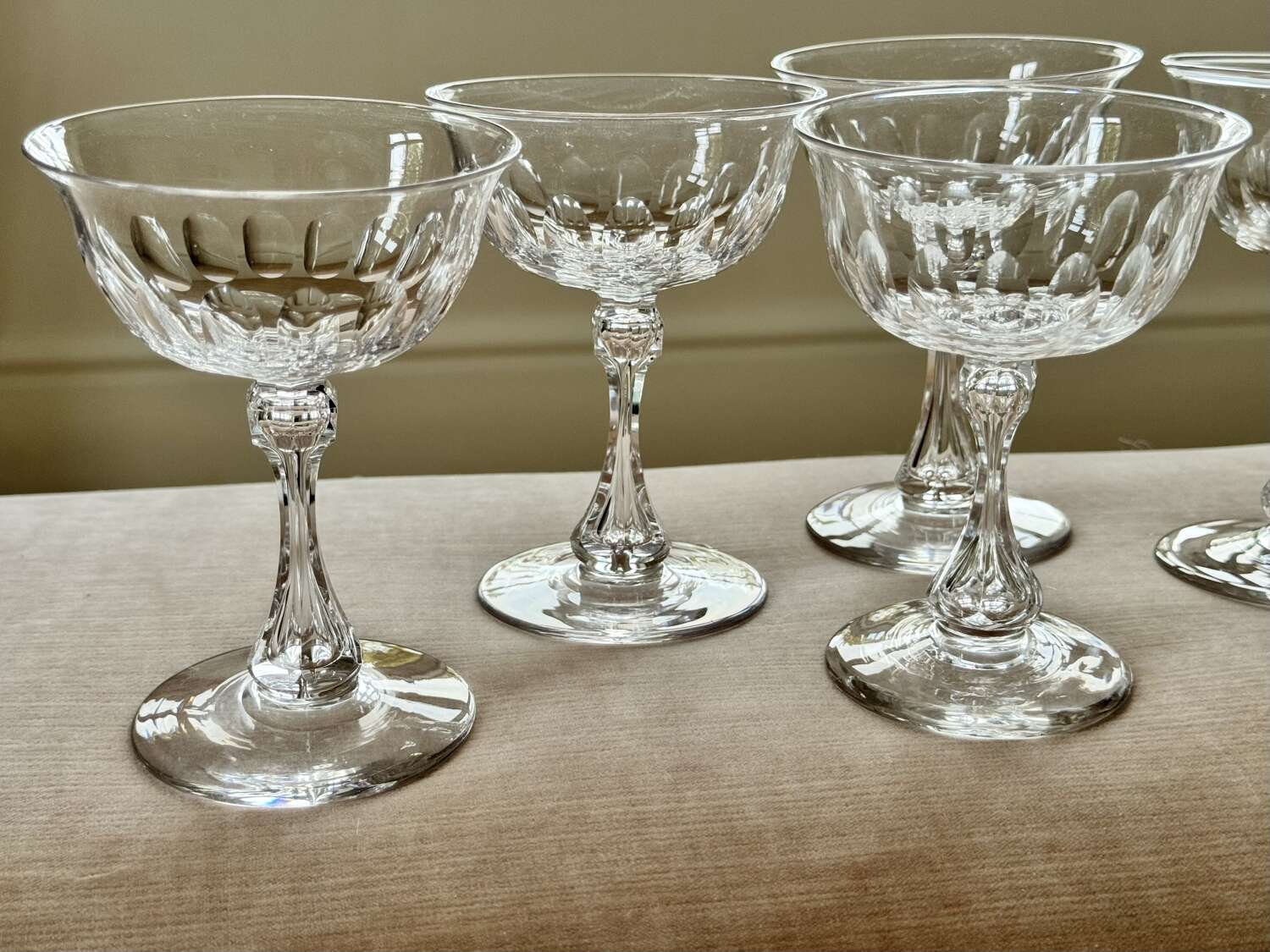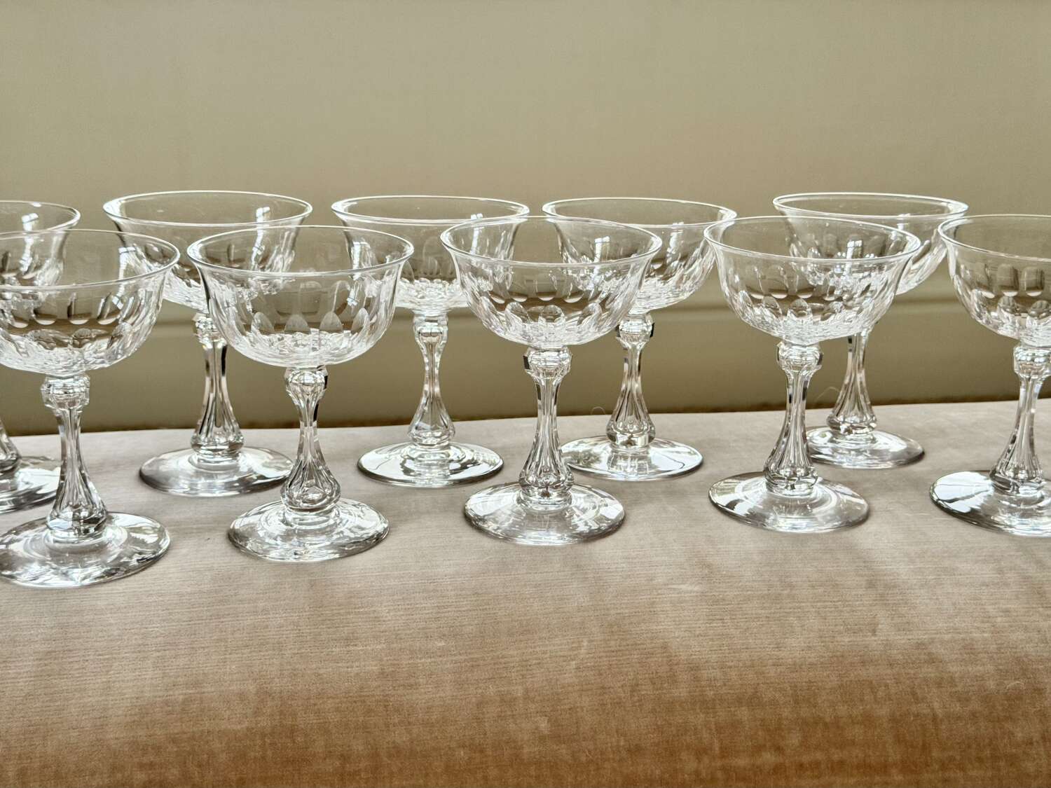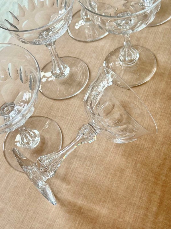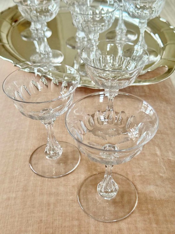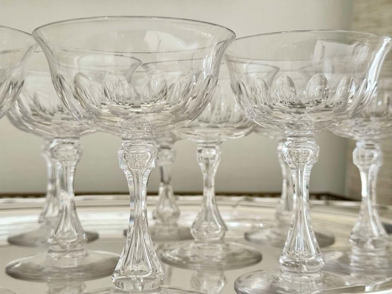 A superb quality set of ten 19th Century Victorian champagne coupes, Circa 1880s, likely to be by Richardson of Stourbridge. Expertly hand crafted, these champagne saucers have carved and air blown bubble stems, thumb print cuts to the bowl, which gently flares to the rim, polished pontil to the base. Perfect for cocktails or champagne, this is an excellent set of antique glasses. Max capacity 150ml.