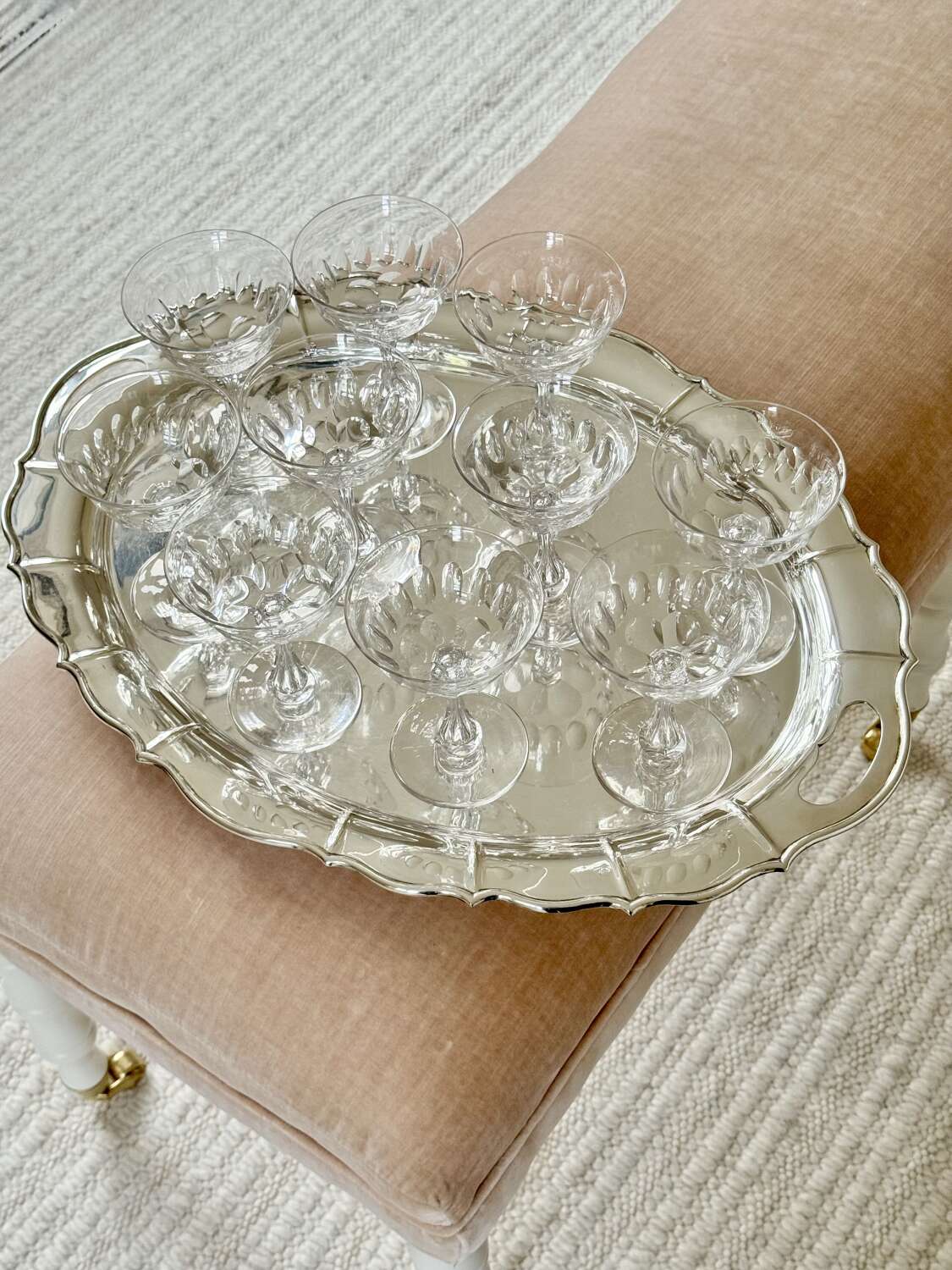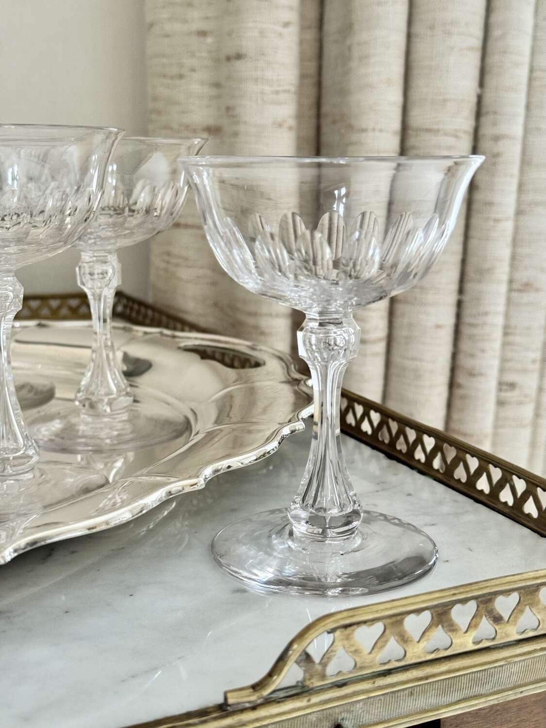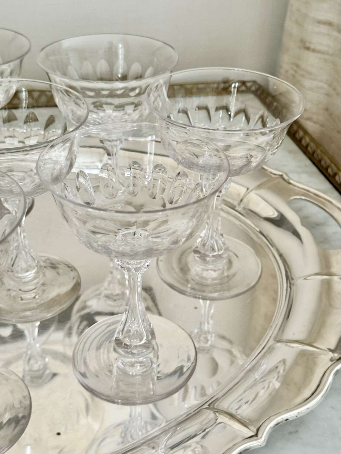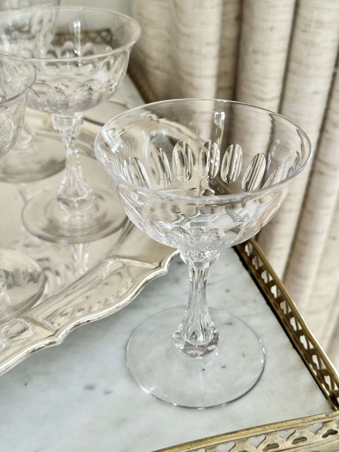 A superb quality set of ten 19th Century Victorian champagne coupes, Circa 1880s, likely to be by Richardson of Stourbridge. Expertly hand crafted, these champagne saucers have carved and air blown bubble stems, thumb print cuts to the bowl, which gently flares to the rim, polished pontil to the base. Perfect for cocktails or champagne, this is an excellent set of antique glasses. Max capacity 150ml.