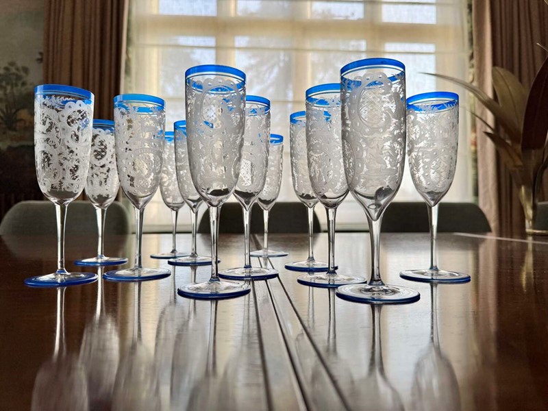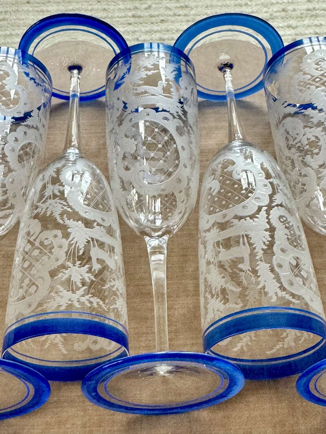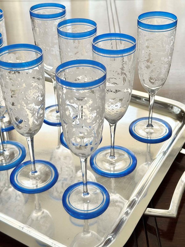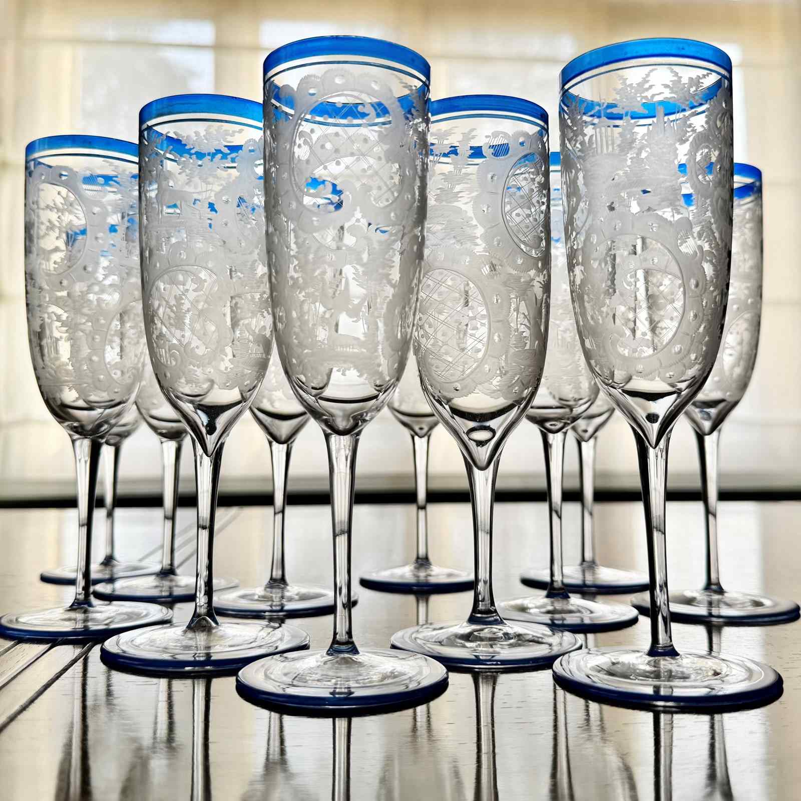 An outstanding set of a dozen Art Deco Bohemian wheel etched champagne fluteswith hand applied blue enamel rims, Circa 1920s. Each superb glasshas been hand crafted, with individually engraved scrolled patterns and charming forest scenes including Stags, Pagodas and birds. Generous in size, these glasses hold a maximum of 170ml. All in all, a splendid and rare set which would work well for champagne or cocktails.
