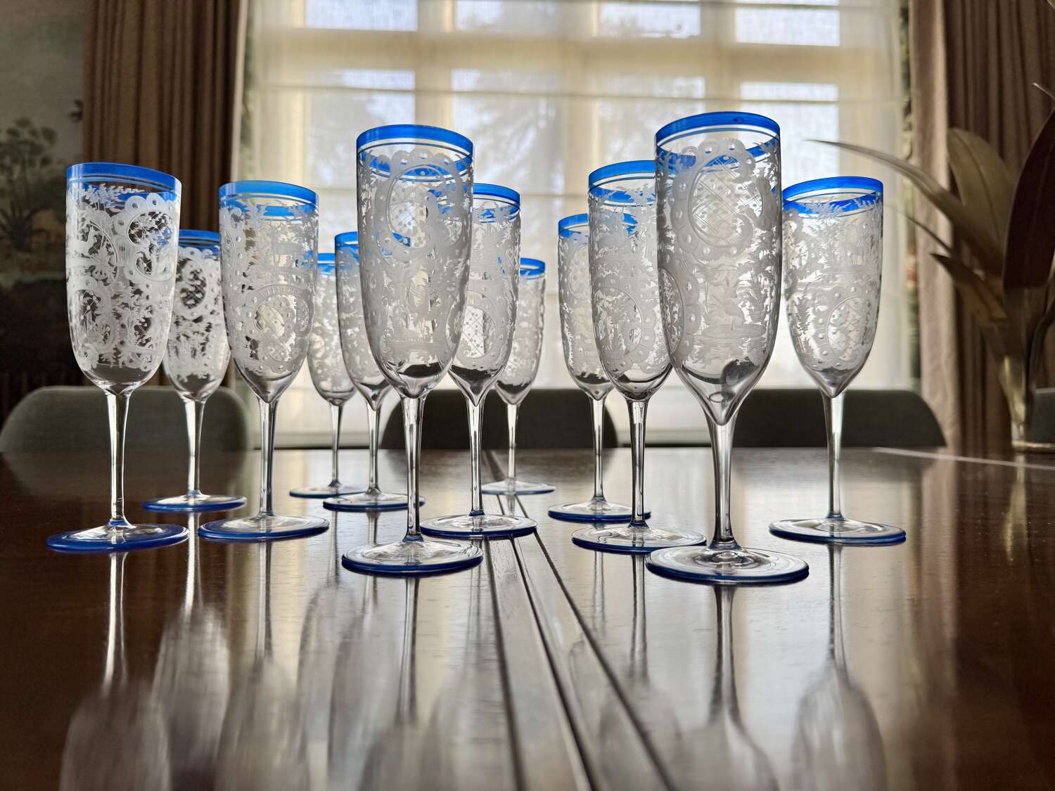 12 Art Deco Bohemian Etched Champagne Flutes With Blue Enamel Rims