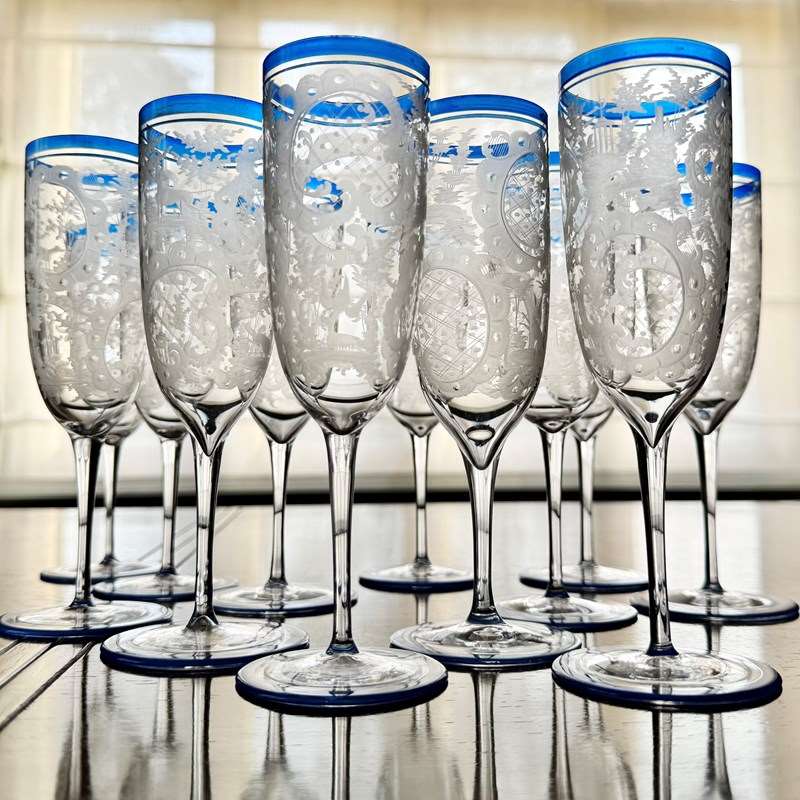 https://www.thehoarde.com/dealers/the-vintage-entertainerAn outstanding set of a dozen Art Deco Bohemian wheel etched champagne fluteswith hand applied blue enamel rims, Circa 1920s. Each superb glasshas been hand crafted, with individually engraved scrolled patterns and charming forest scenes including Stags, Pagodas and birds. Generous in size, these glasses hold a maximum of 170ml. All in all, a splendid and rare set which would work well for champagne or cocktails.