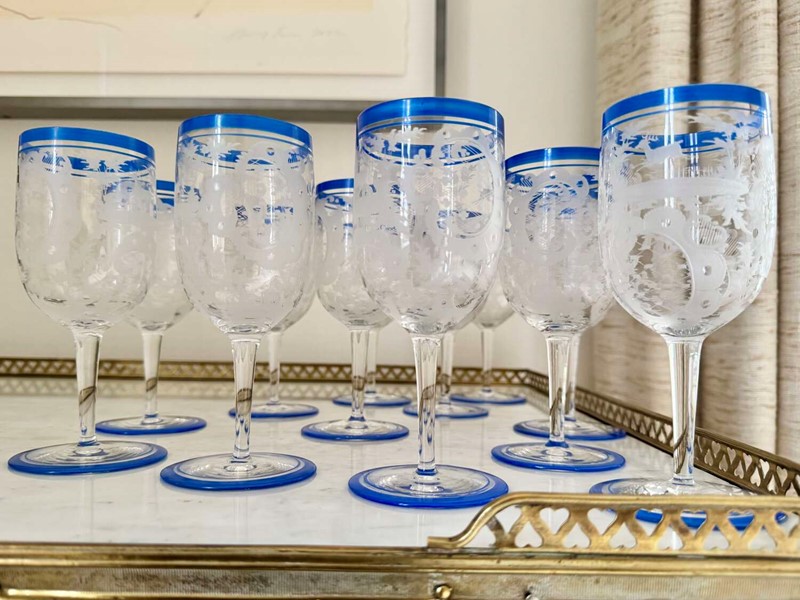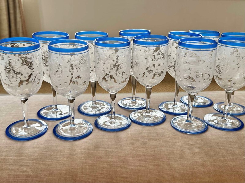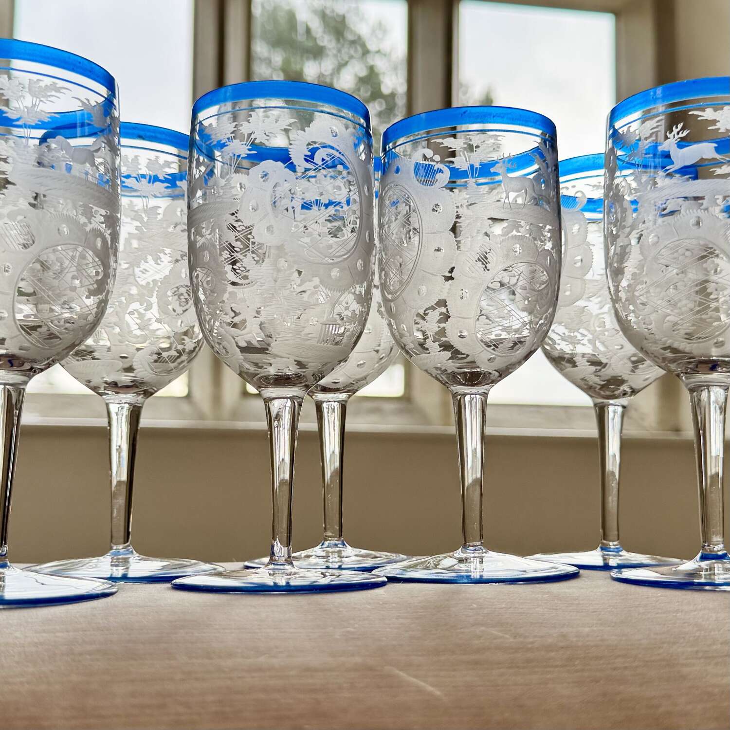 An outstanding set of 13Art Deco Bohemian wheel etched wine glasseswith hand applied blue enamel rims, Circa 1920s. Each superb goblet has been hand crafted, with individually engraved scrolled patterns and charming forest scenes including Stags, Pagodas and birds. Generous in size, these glasses hold a maximum of 220ml. All in all, a splendid and rare set which would work well for red or white wine.