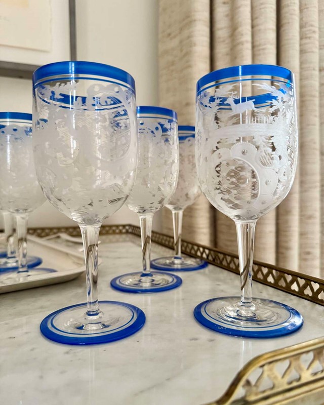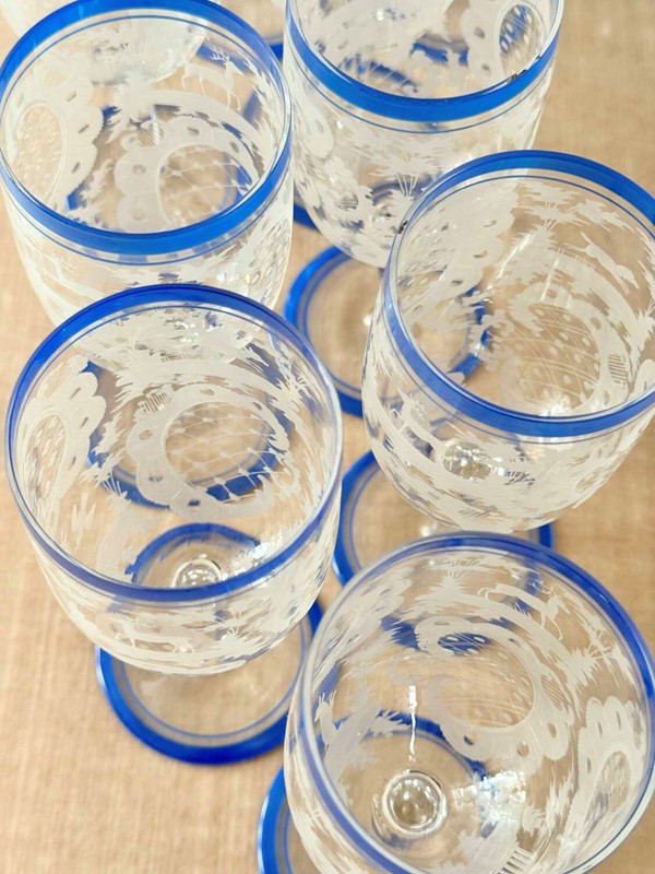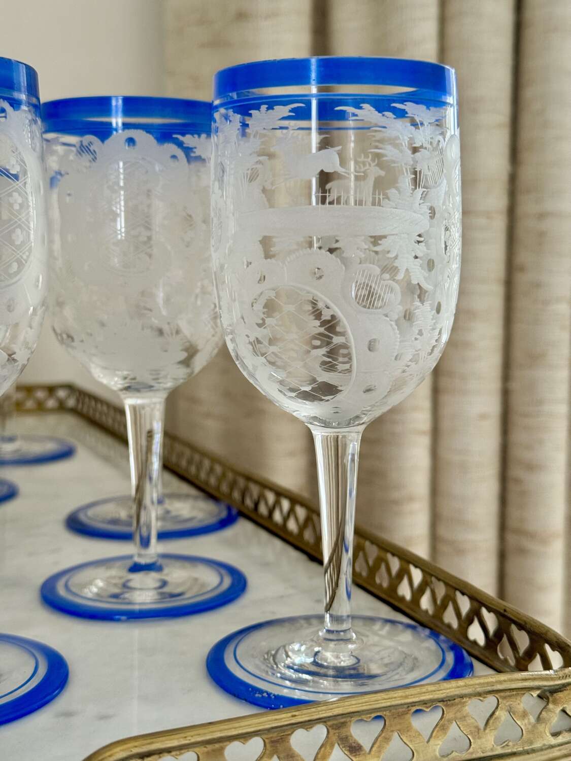 13 Art Deco Bohemian etched wine glasses with blue enamel rims