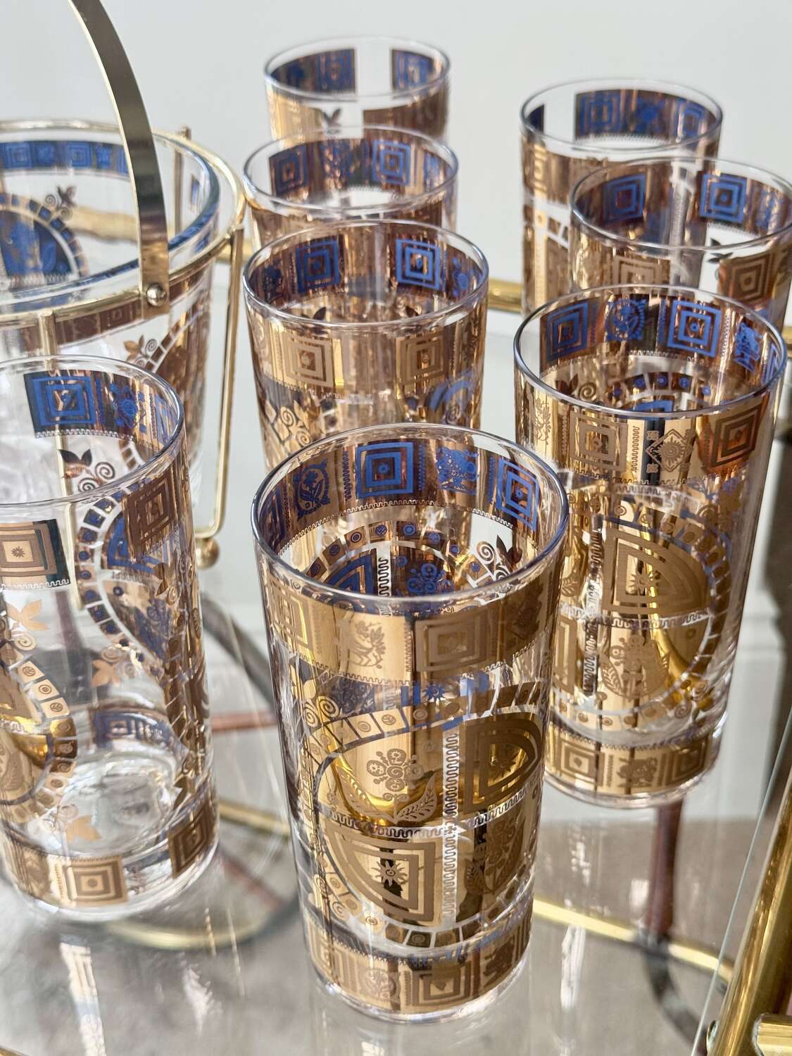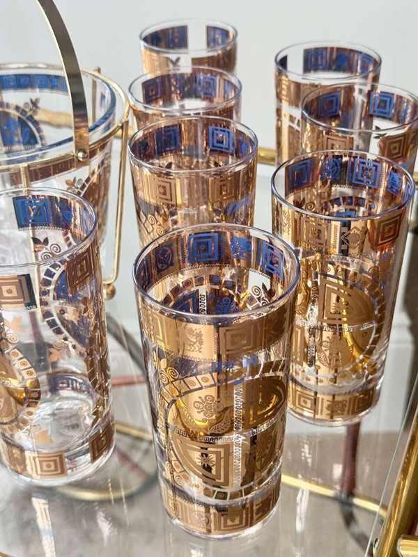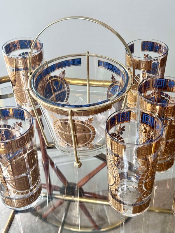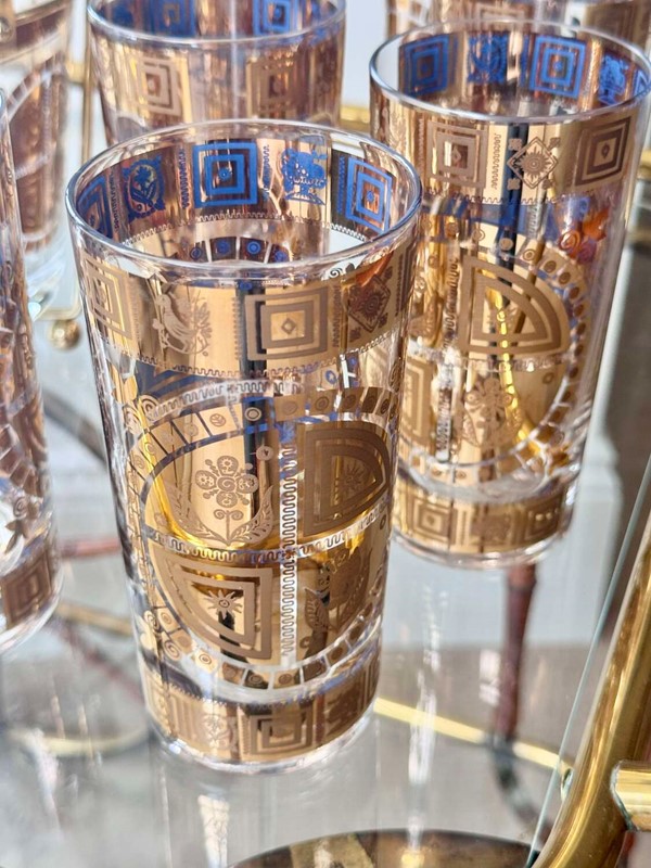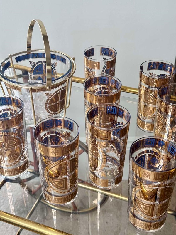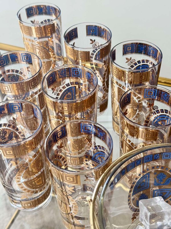 For the discerning collector of Mid-Century Modern barware, anopportunity to acquire a complete, museum-quality set from the legendary Culver Glass Company, USA. Dating to the late 1950s, this set features the iconic "Coronet" pattern in an early iteration, adorned with embossed 22ct gold flower and sunburst motifs overlaid on translucent mid-blue enamel.This rare set is in pristine, "unused" condition. Unlike many pieces from this era, the 22ct gold detailing is still vibrant and shows no signs of wear or fading.Each piece is clearly signed with the authentic "Culver" script signature. (Notably, this set does not have the later "Ltd." and copyright symbols, identifying it as a highly desirable early production run, from 1950s (certainly before 1961)).Set comprises:8 Highball Glasses: 14cm height, 12oz capacity.Matching Glass Ice Bucket complete with original gold plated cradle caddy.For shipping these pieces will be carefully wrapped and packed and sent using UK Royal Mail Tracked delivery to ensure safe delivery.