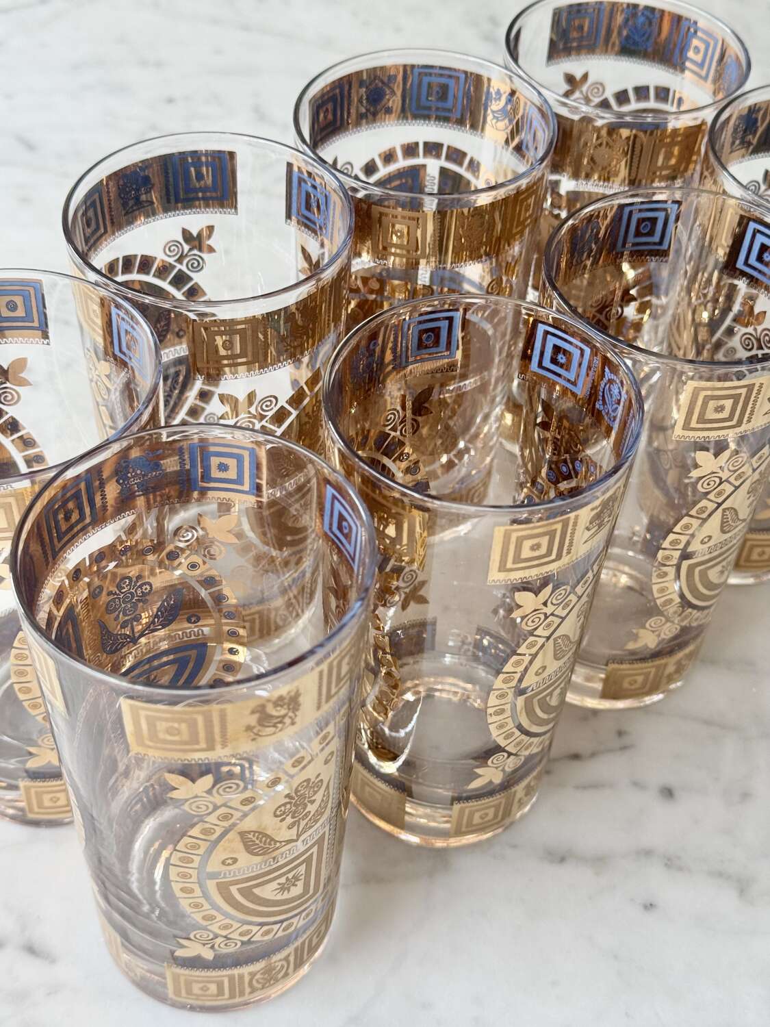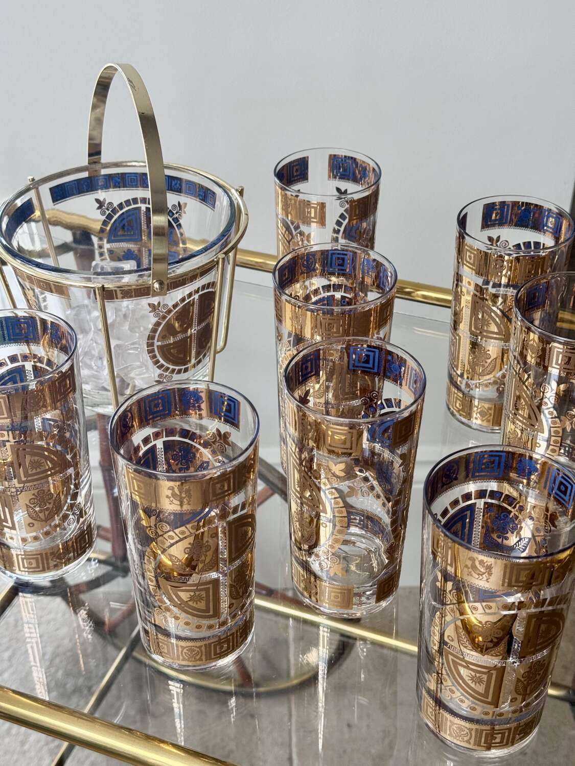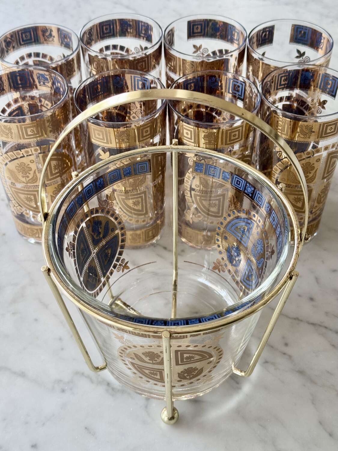 For the discerning collector of Mid-Century Modern barware, anopportunity to acquire a complete, museum-quality set from the legendary Culver Glass Company, USA. Dating to the late 1950s, this set features the iconic "Coronet" pattern in an early iteration, adorned with embossed 22ct gold flower and sunburst motifs overlaid on translucent mid-blue enamel.This rare set is in pristine, "unused" condition. Unlike many pieces from this era, the 22ct gold detailing is still vibrant and shows no signs of wear or fading.Each piece is clearly signed with the authentic "Culver" script signature. (Notably, this set does not have the later "Ltd." and copyright symbols, identifying it as a highly desirable early production run, from 1950s (certainly before 1961)).Set comprises:8 Highball Glasses: 14cm height, 12oz capacity.Matching Glass Ice Bucket complete with original gold plated cradle caddy.For shipping these pieces will be carefully wrapped and packed and sent using UK Royal Mail Tracked delivery to ensure safe delivery.