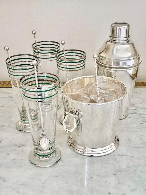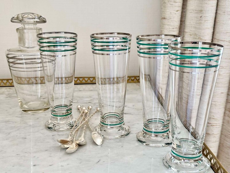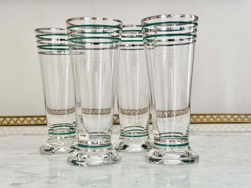 Four fabulous 1950s green enamel and silver ringed tall Pilsner Ale glasses, perfect for long cocktails and other bar duties. Each tumbler has an original 'Foreign' identification sticker, most likely from Czechoslovakia. Shown with a set of Dutch silver spoons and other vintage barware available and listed separately.
