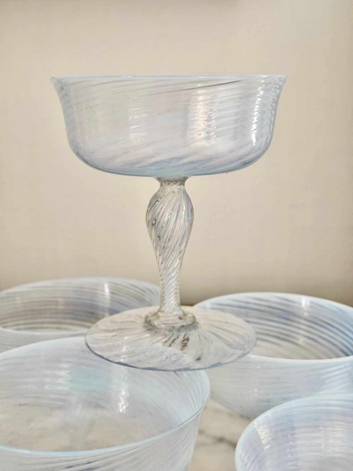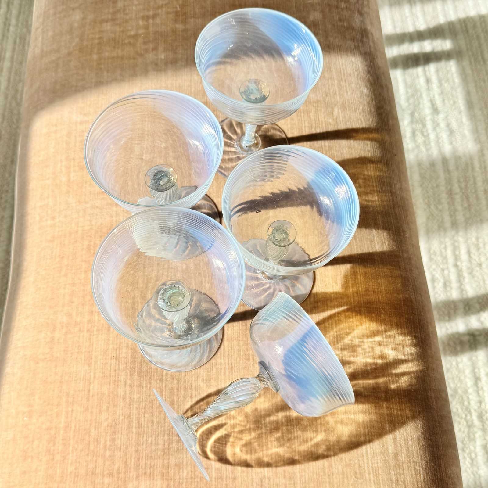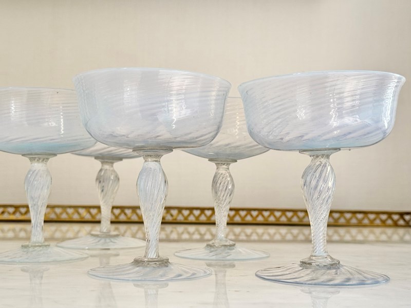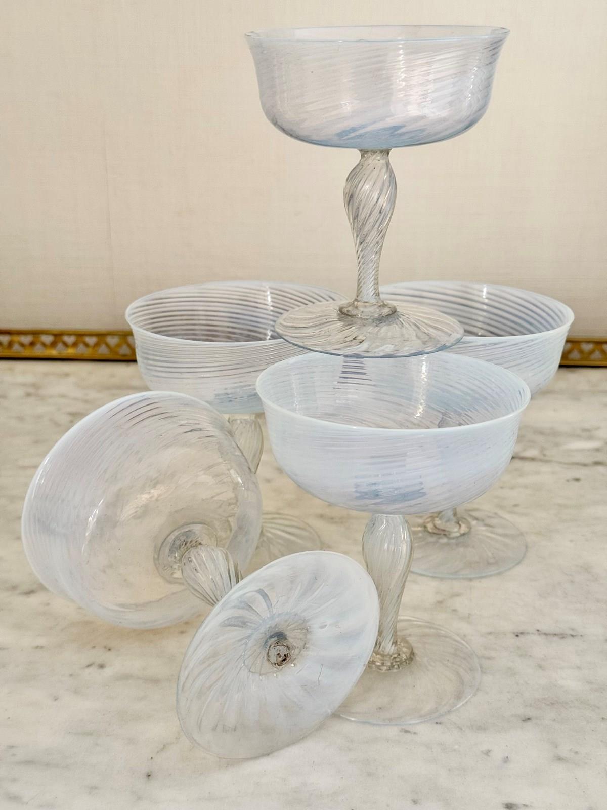 A magnificent and rare set of five 19th Century hand crafted Italian Murano opalescent champagne or cocktail coupe glasses with air bubble twisted glass stems, possibly by Salviati, Circa 1870s. Each exquisite glass has been skilfully hand blown and wrought, the wrythen design is completed by a flared base which has a snapped pontil. Each is in excellent condition. Each holds max 175ml. A rare find!