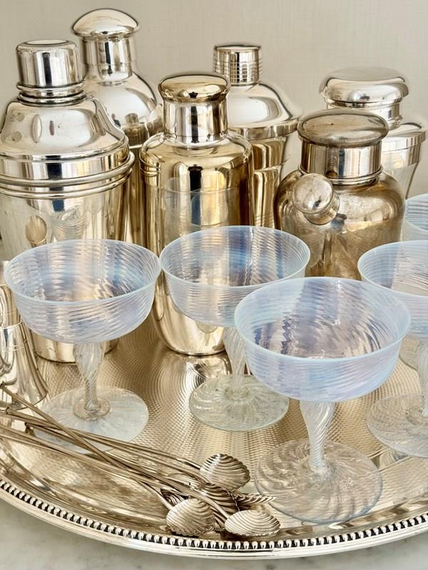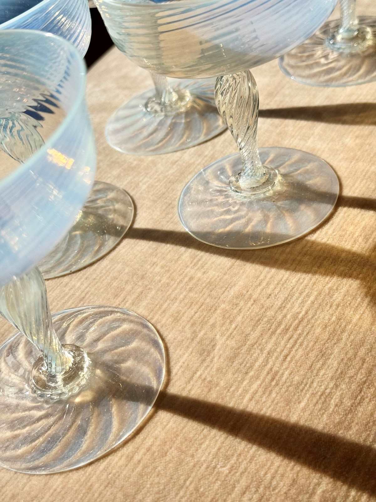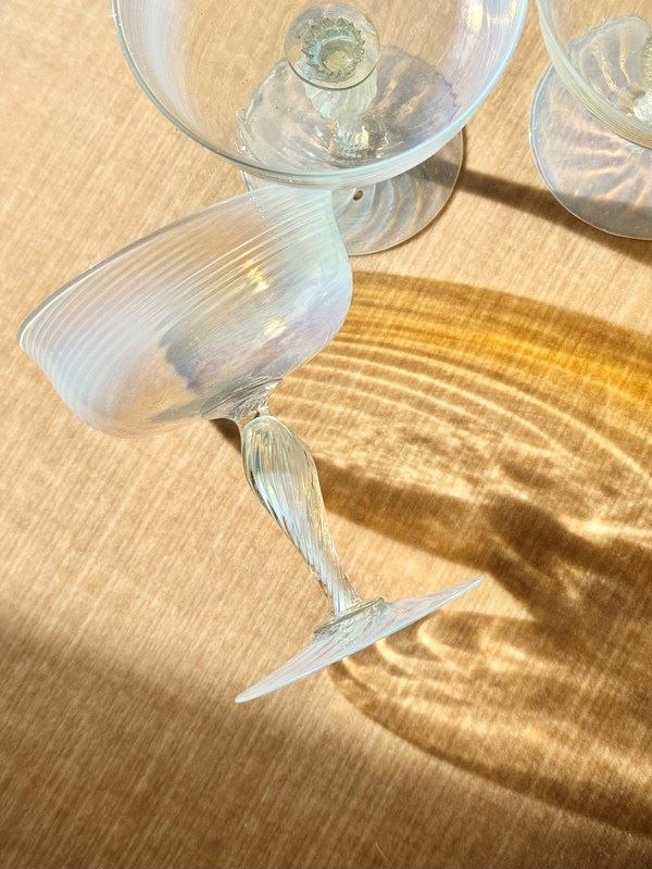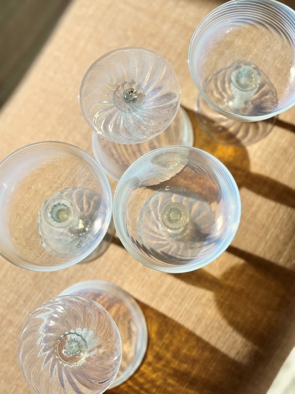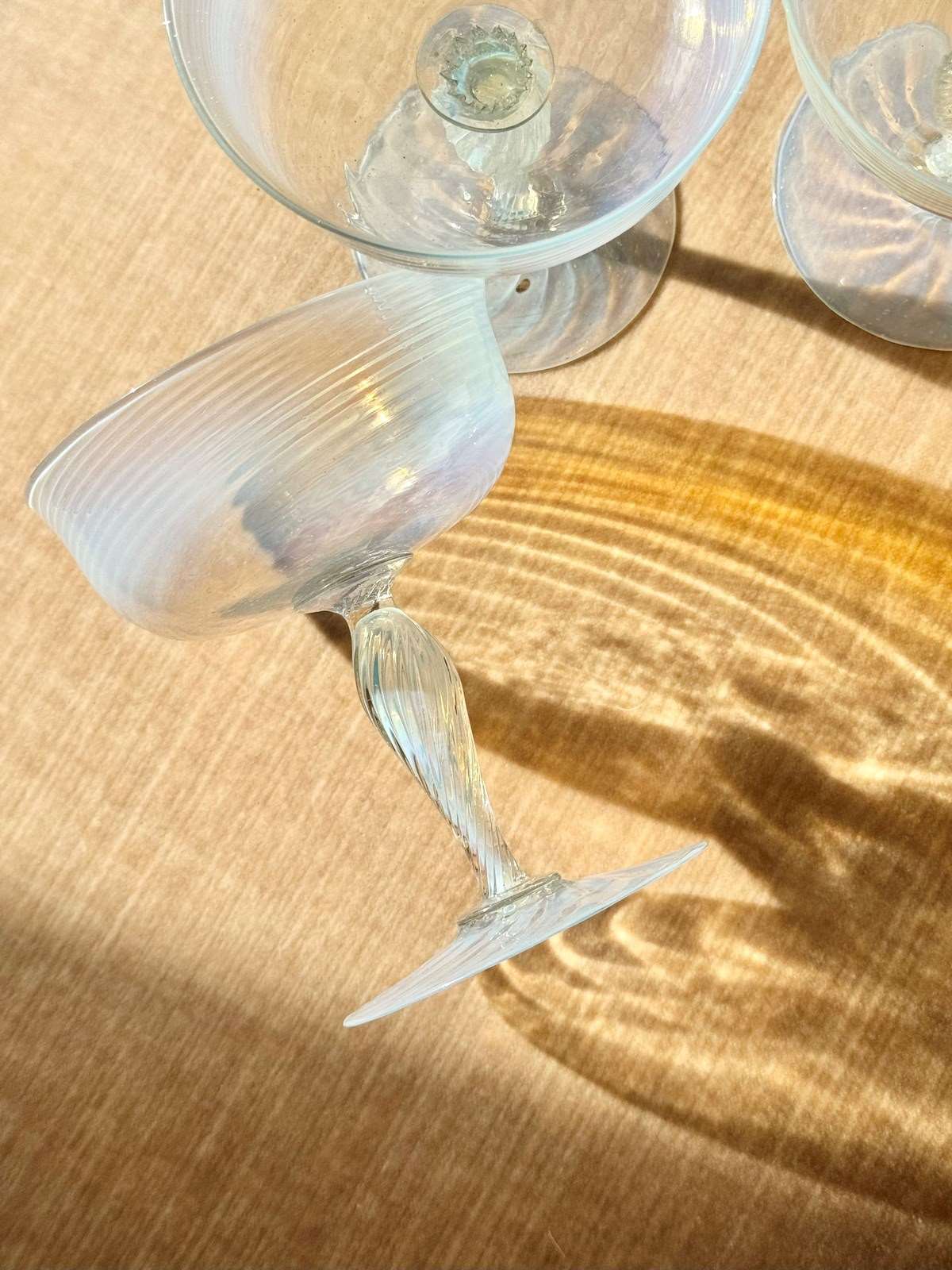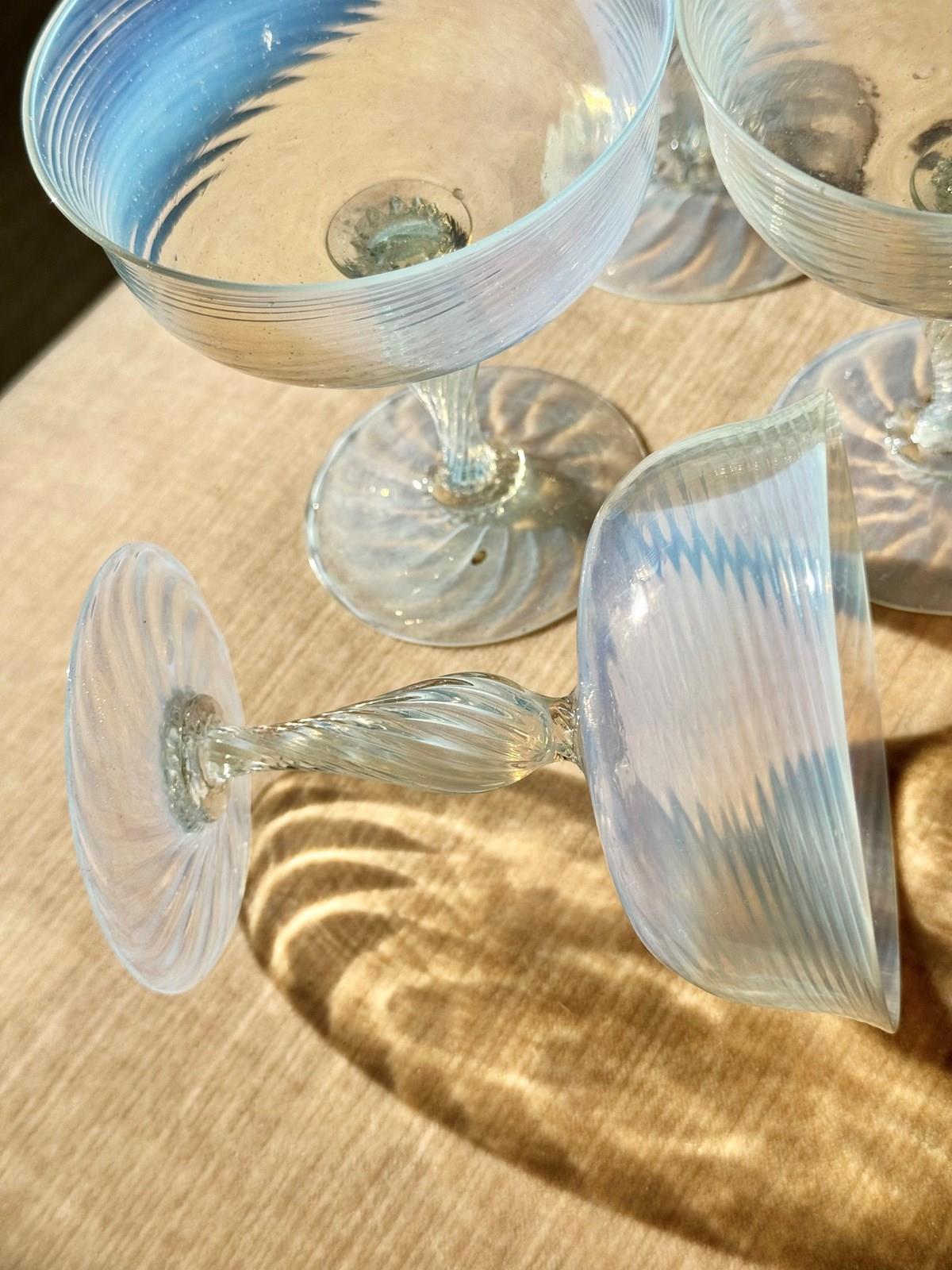 A magnificent and rare set of five 19th Century hand crafted Italian Murano opalescent champagne or cocktail coupe glasses with air bubble twisted glass stems, possibly by Salviati, Circa 1870s. Each exquisite glass has been skilfully hand blown and wrought, the wrythen design is completed by a flared base which has a snapped pontil. Each is in excellent condition. Each holds max 175ml. A rare find!