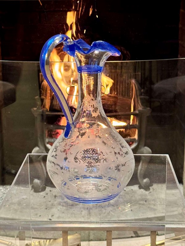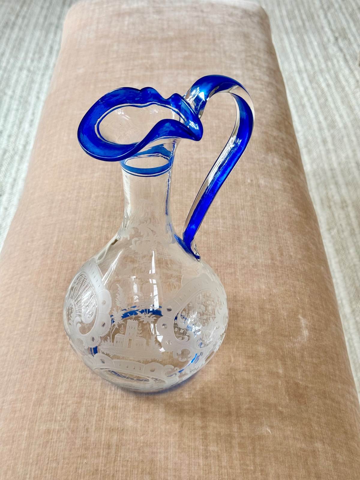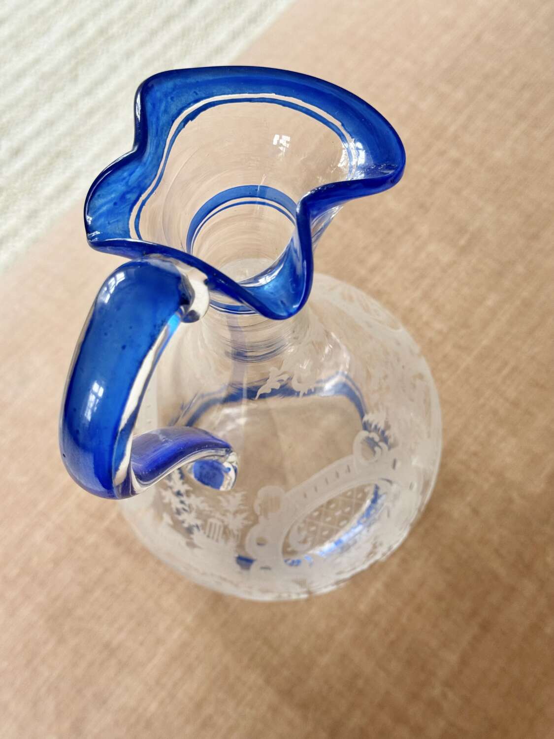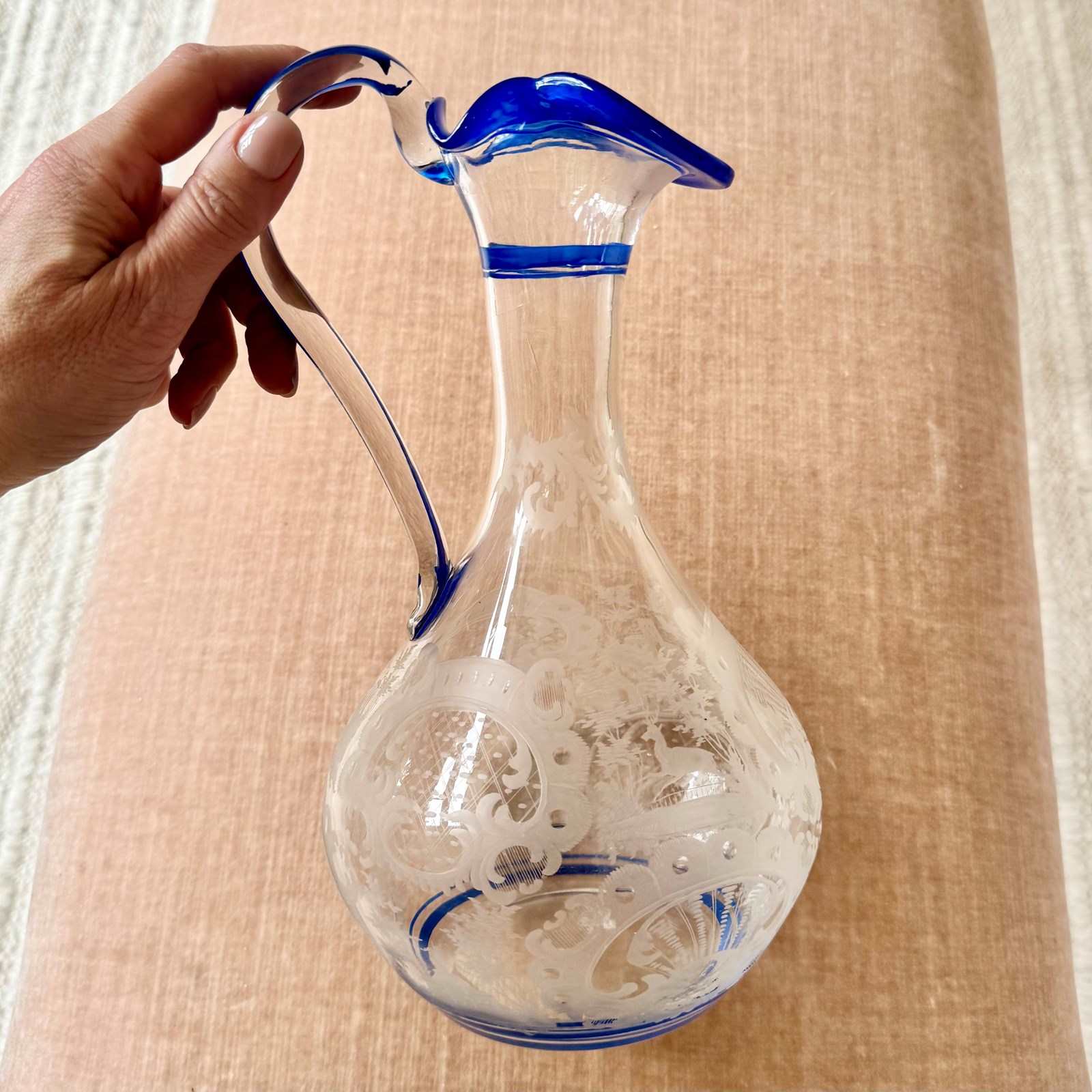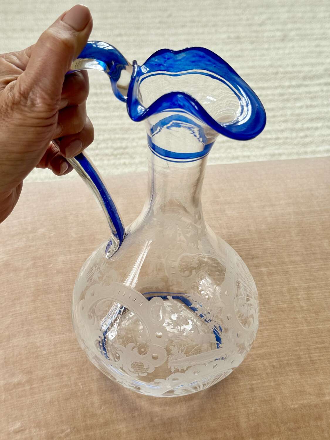 Art Deco Bohemian Etched Claret Jug With Blue Enamel Rims