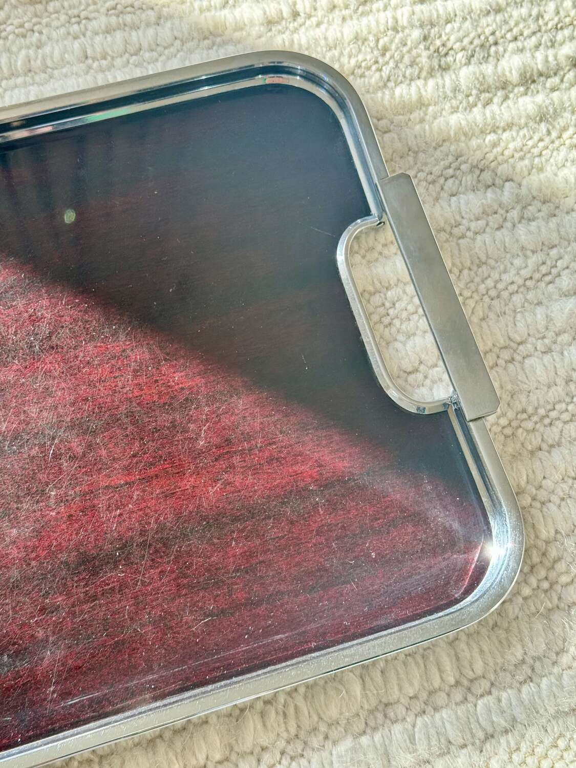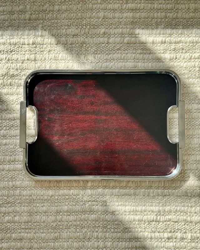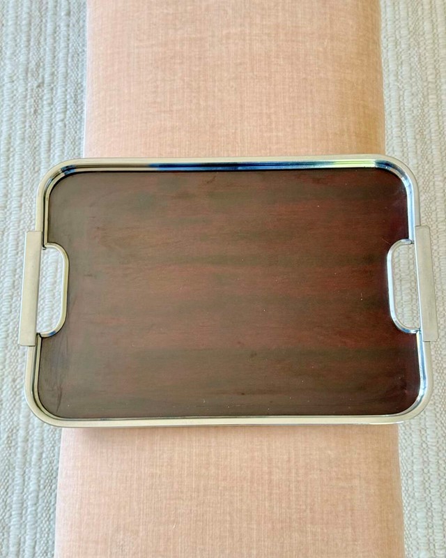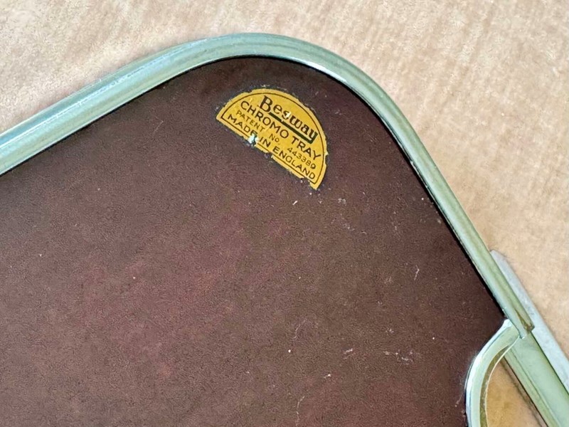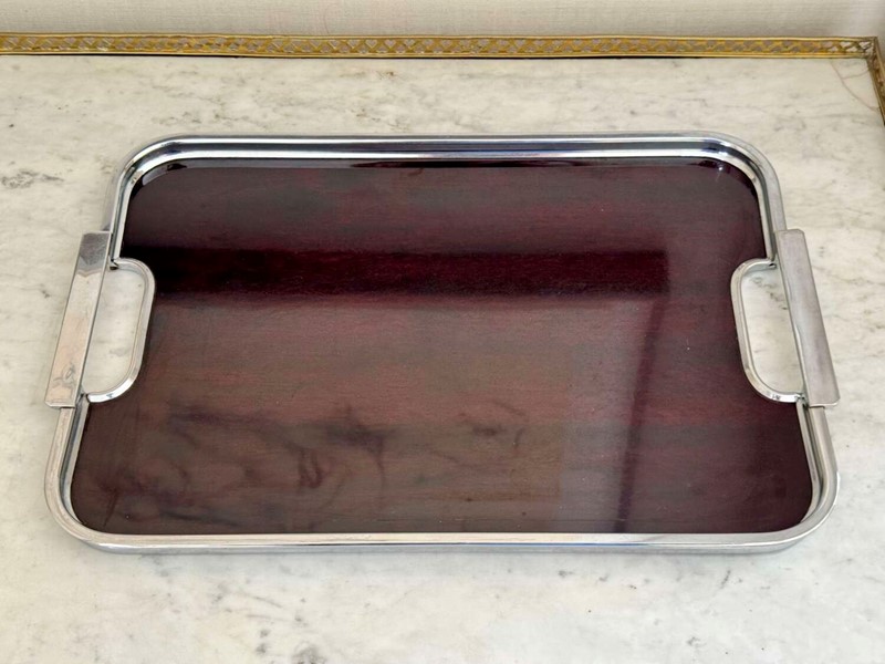 A good quality English Art Deco wooden effect Bakelite and chrome serving tray, Circa 1930s with original makers branding to the base identifying 'Besway Chromo tray' with a Patent number. This stylish tray is perfect for indoor/outdoor use.