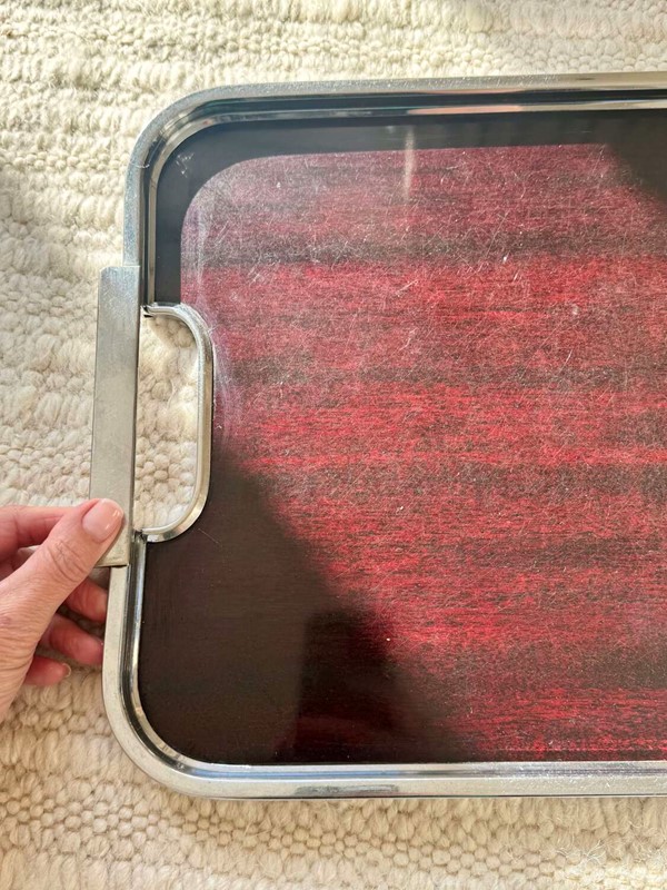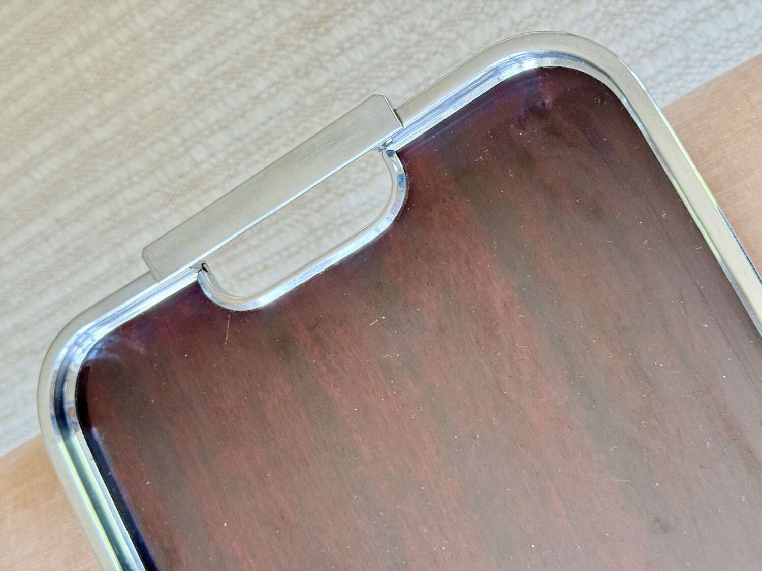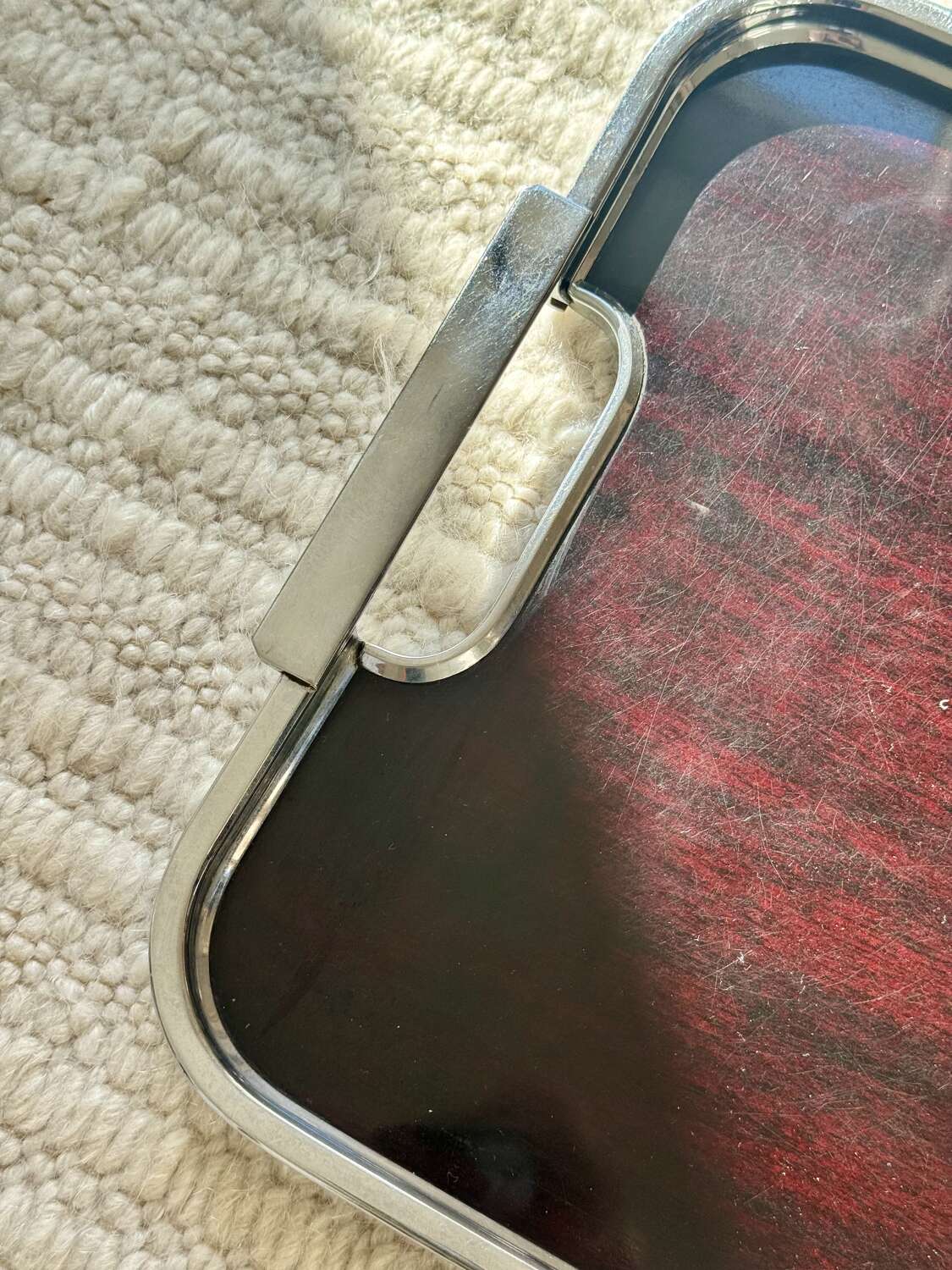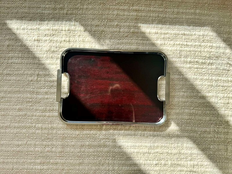 A good quality English Art Deco wooden effect Bakelite and chrome serving tray, Circa 1930s with original makers branding to the base identifying 'Besway Chromo tray' with a Patent number. This stylish tray is perfect for indoor/outdoor use.