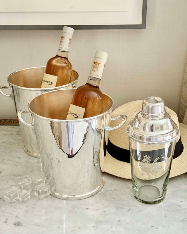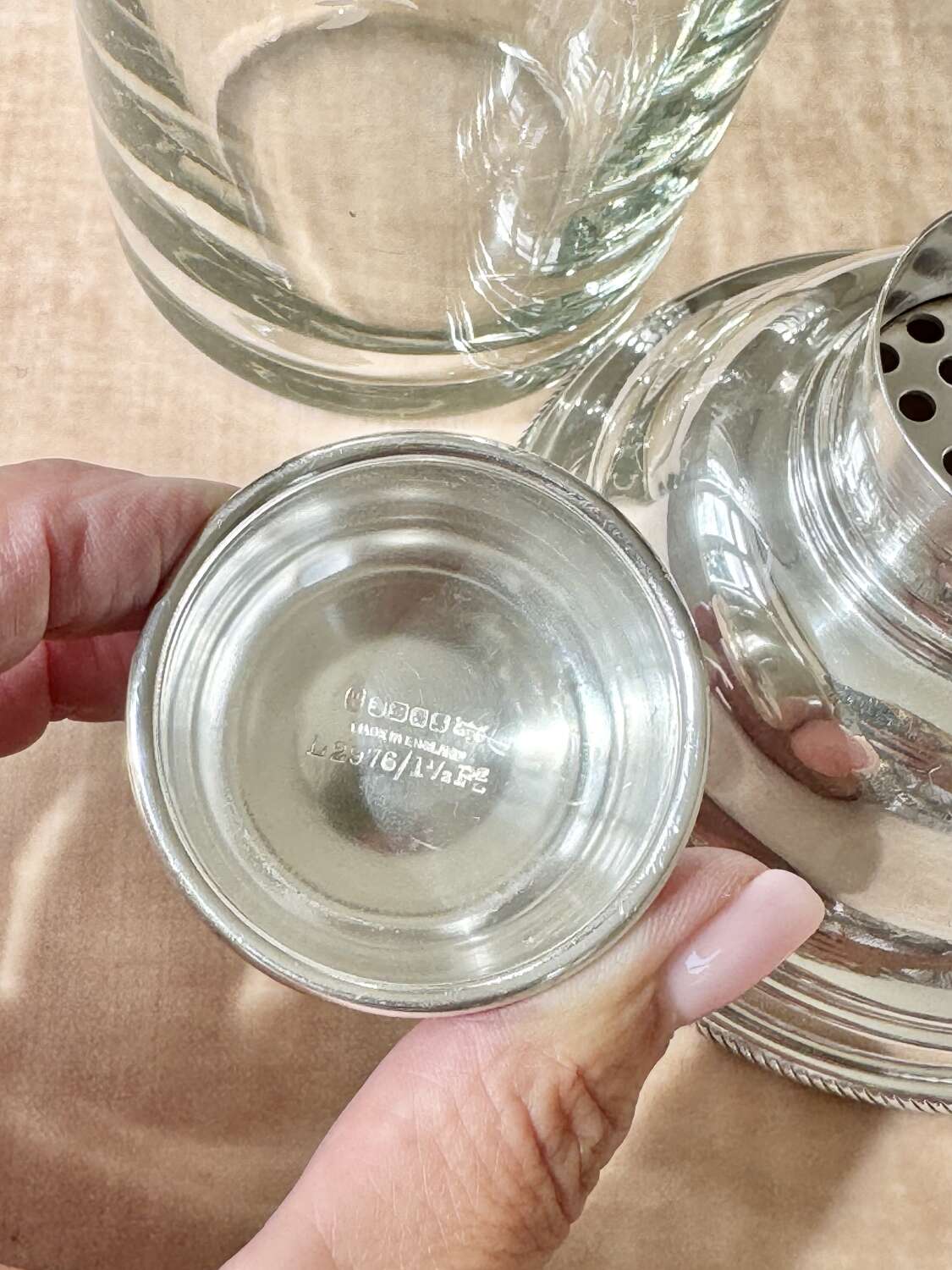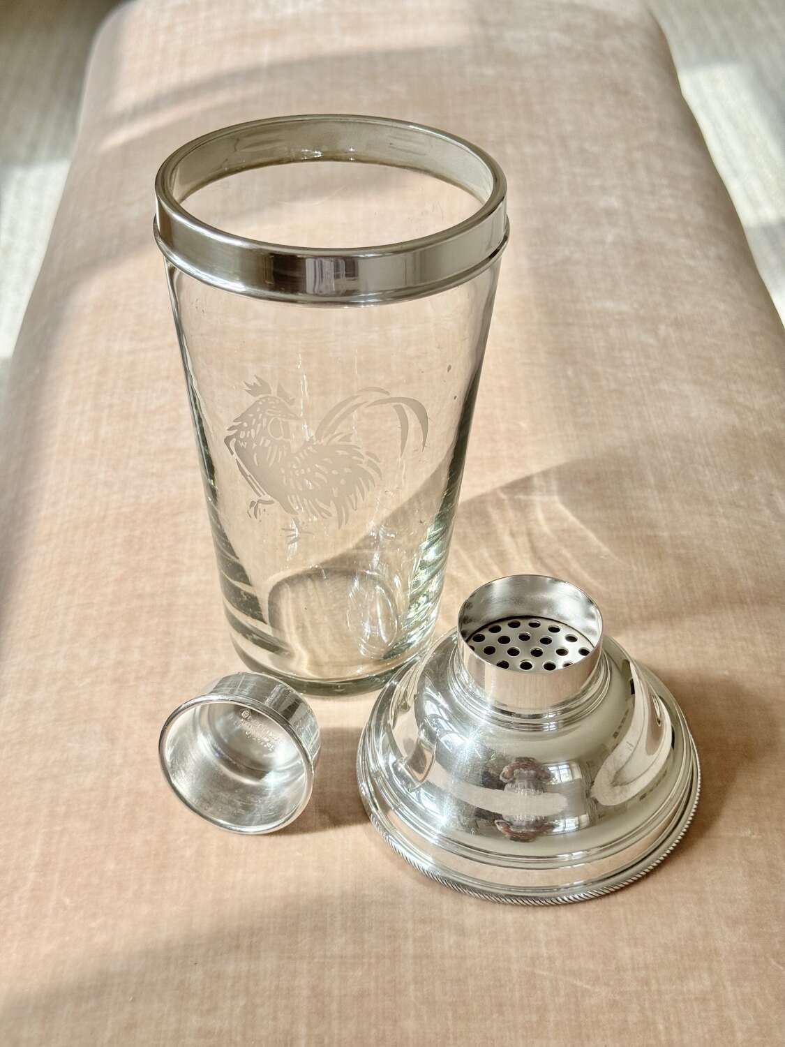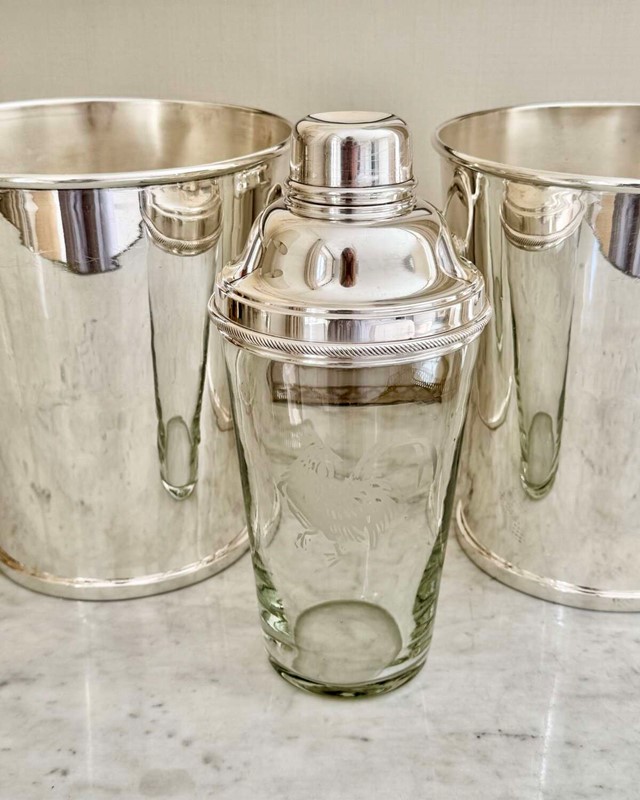An excellent quality original Art Deco English silver plated and glass cocktail shaker acid etched with a cockerel, by James Dixon, Sheffield, Circa 1920. Unusually, James Dixon chose to put his hallmark on the inside of the lid (see images).This smartpiece of vintage barware is stamped to say it holds 1.5 pints of liquid (larger than usual)James Dixon was one of the great English silversmiths of the 19th and early 20th Centuries, renowned for creating good quality barware.