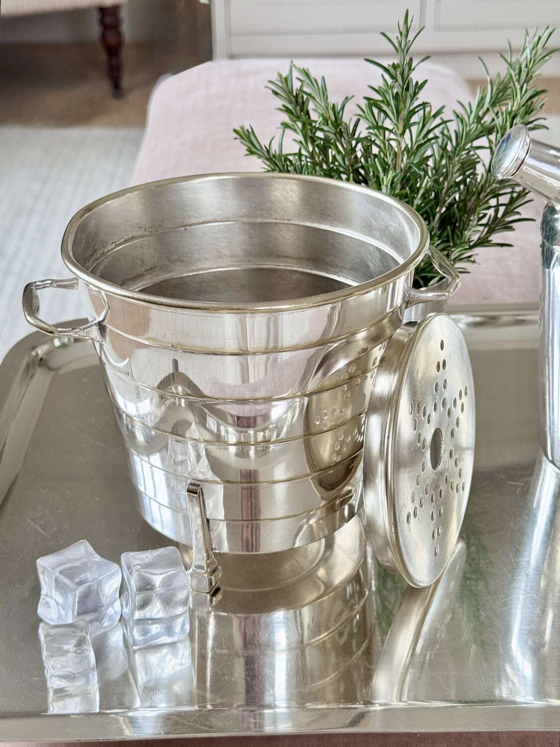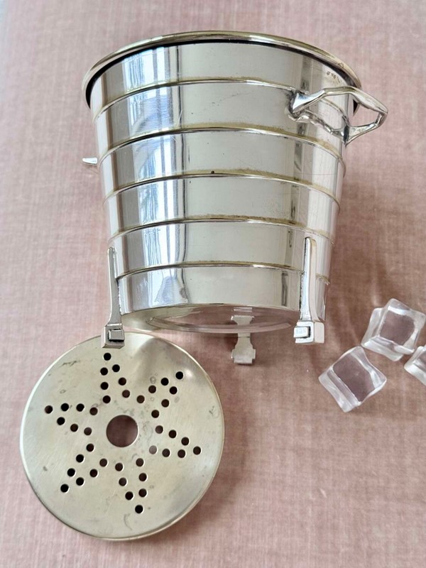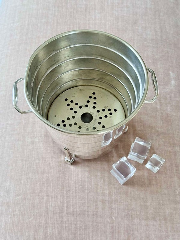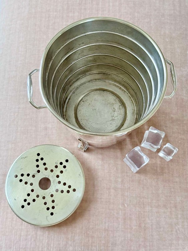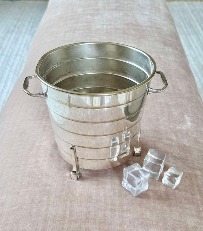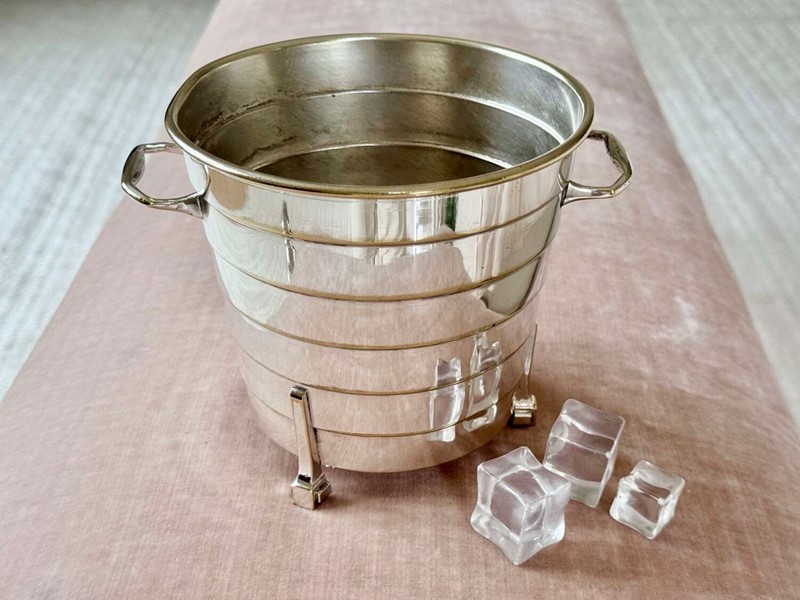 An excellent example of an Art Deco era English silver plated ice bucket, Circa 1920. This smart piece of antique barware is truly evocative of this design period, with stepped sides and three angular feet, along with a removable ice melt tray. The piece has splendid aged patina commensurate with age and use.