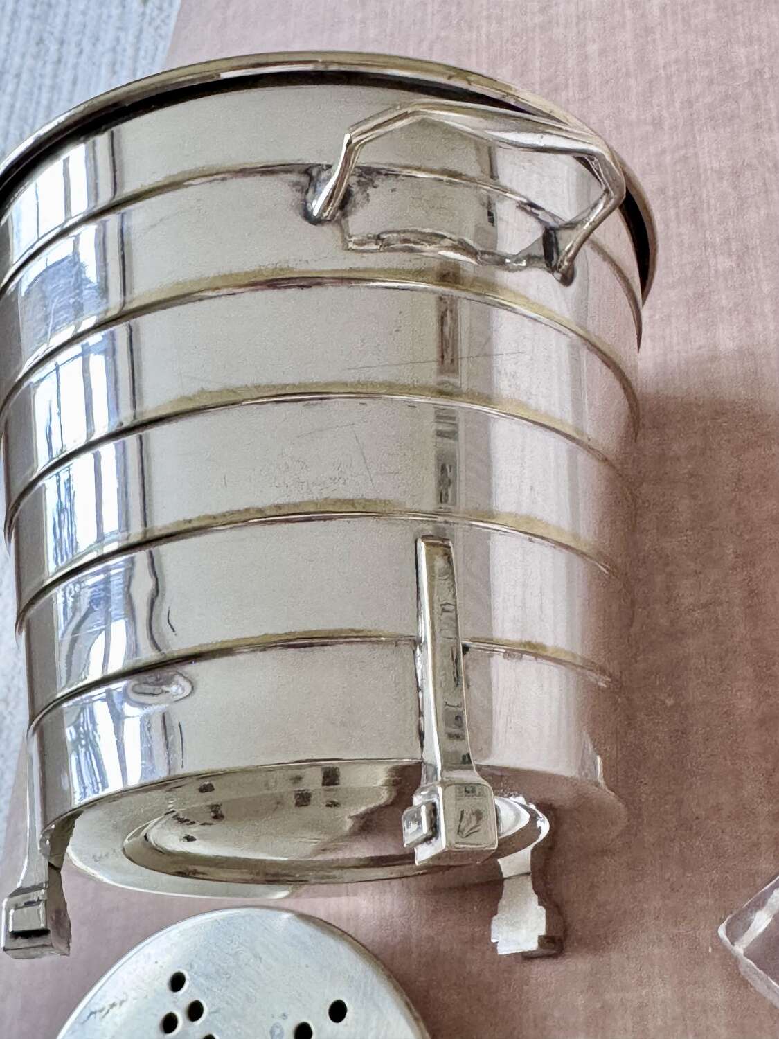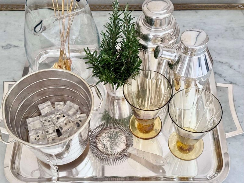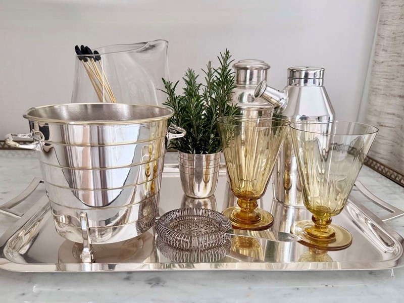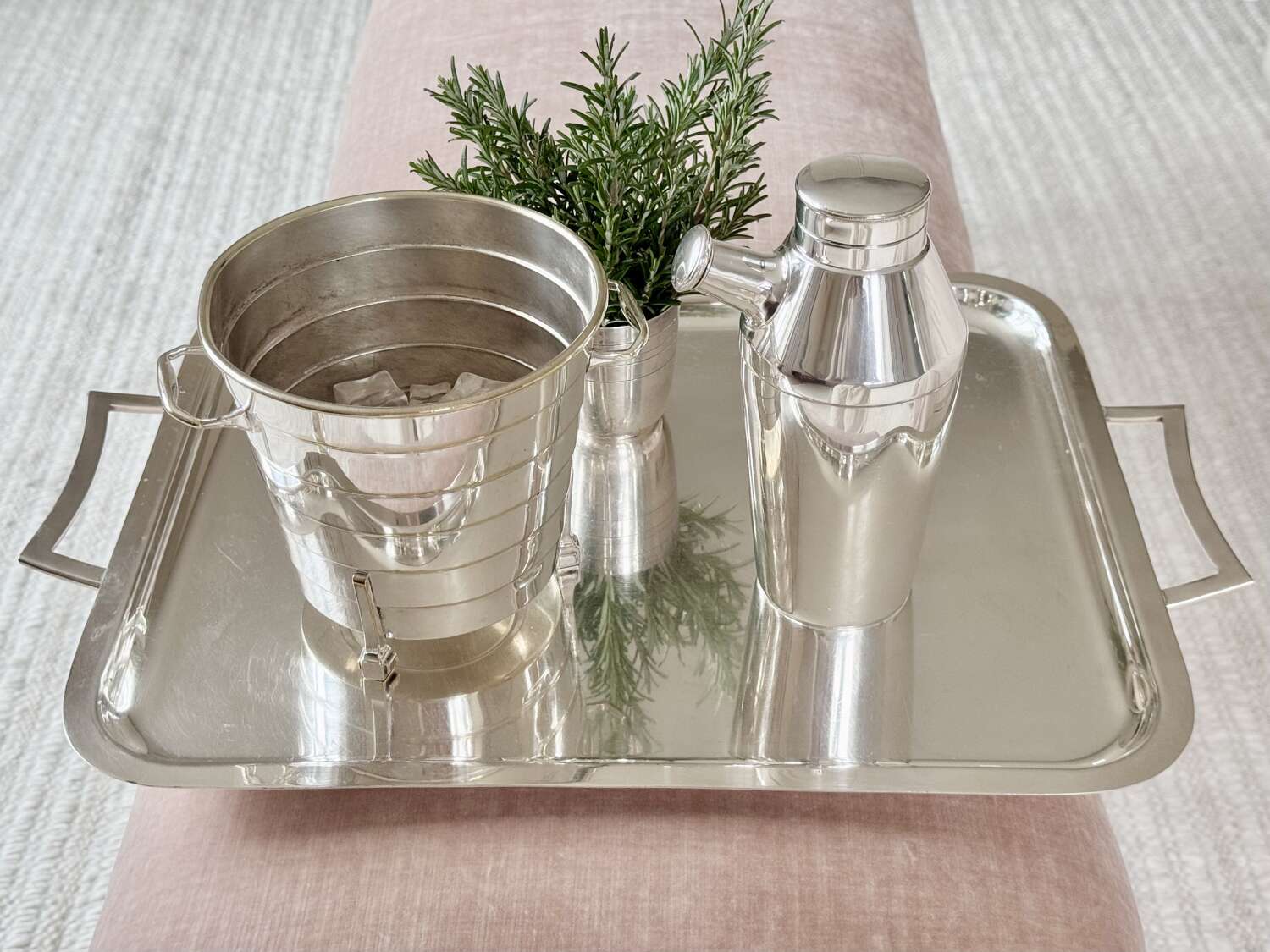 An excellent example of an Art Deco era English silver plated ice bucket, Circa 1920. This smart piece of antique barware is truly evocative of this design period, with stepped sides and three angular feet, along with a removable ice melt tray. The piece has splendid aged patina commensurate with age and use.