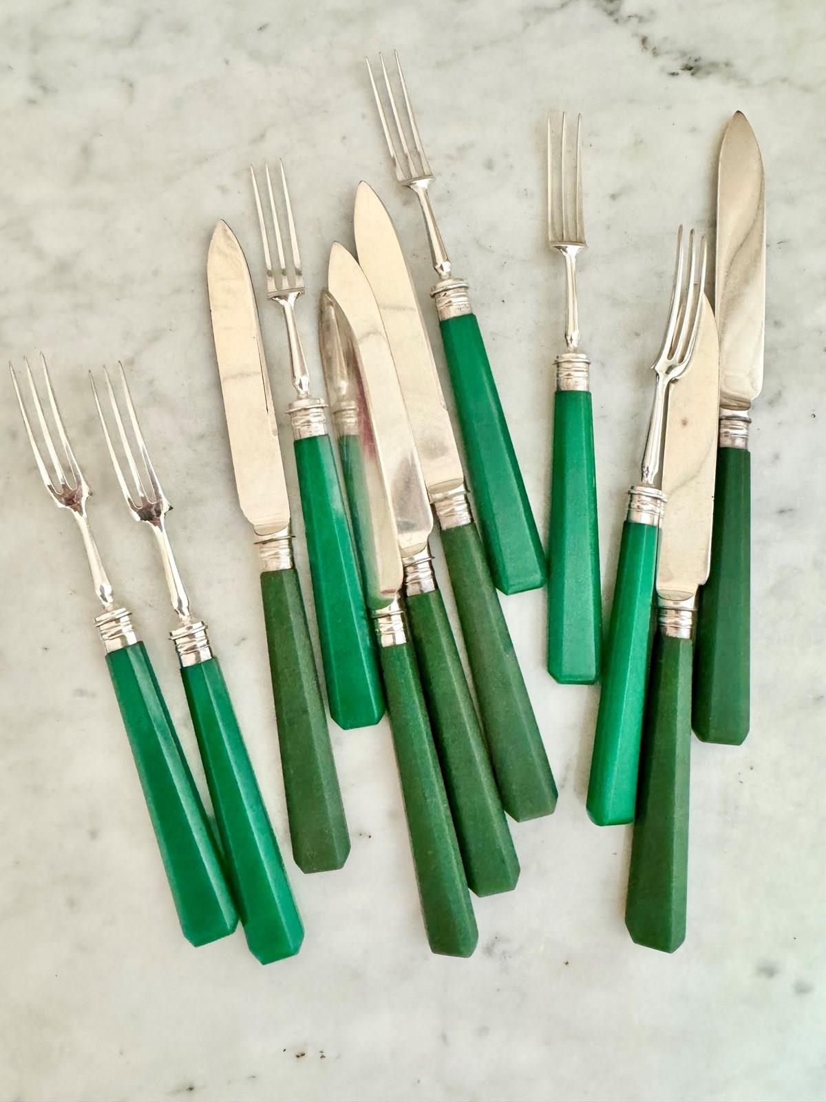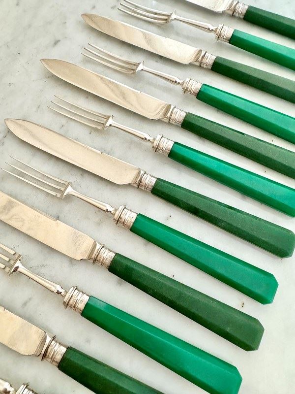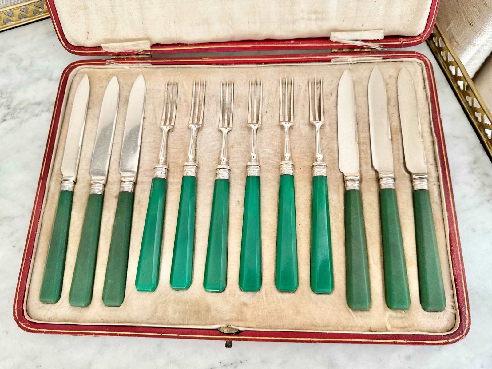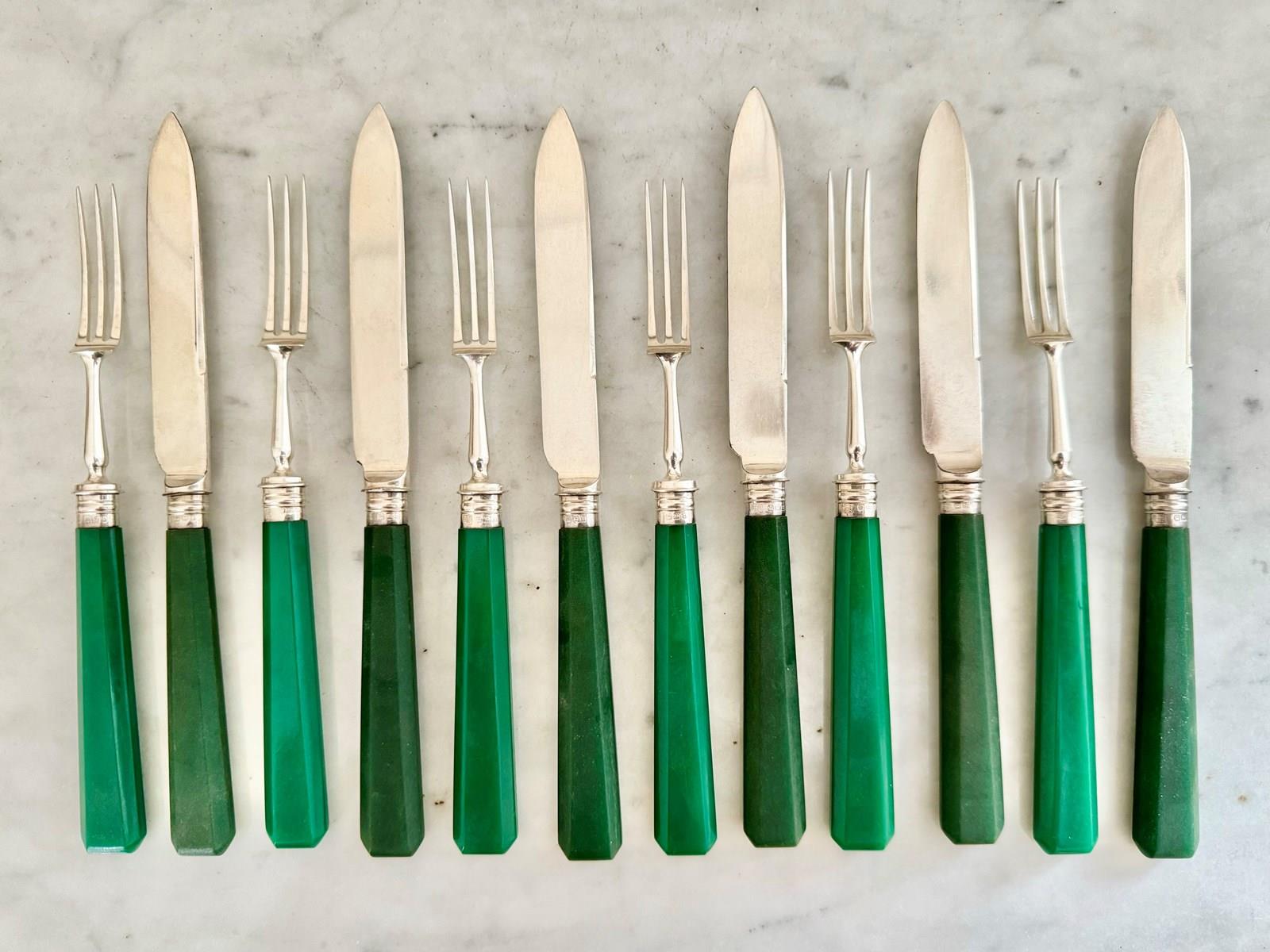 Art Deco Silver Dessert Knives Forks With Emerald Green Handles